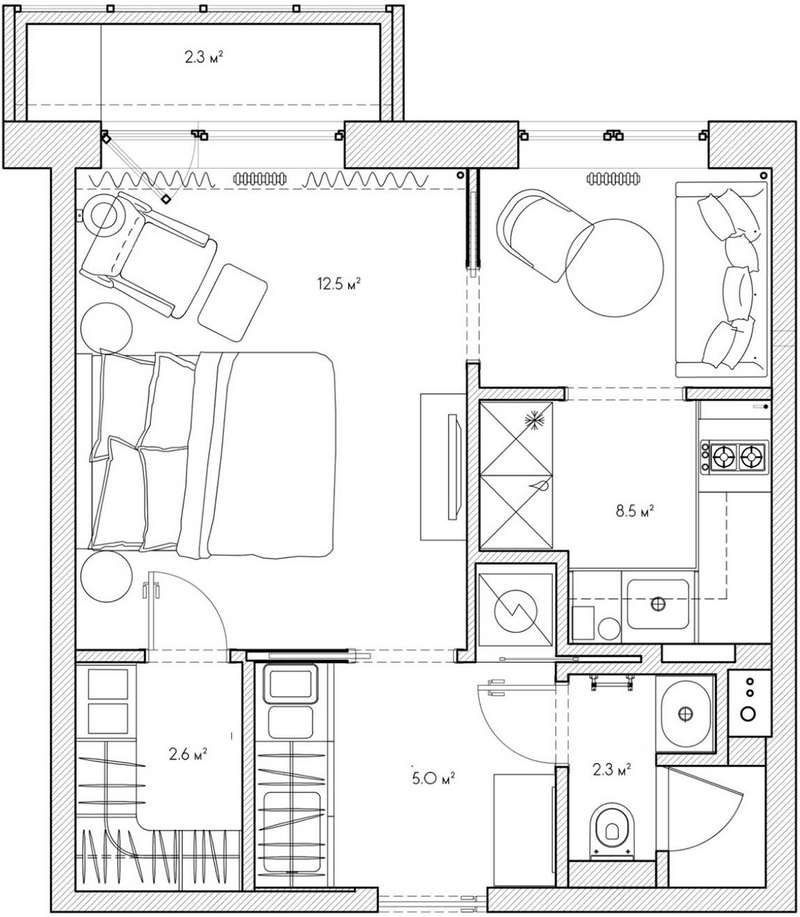A tervezés fő vezérelve a zsúfoltság elkerülése volt a szükséges funkciók megtartása mellett. A megrendelő egyik legfontosabb kérése a tárolóhelyek okos elhelyezése volt a ruhák, a mindennapi holmik, valamint a háztartási gépek (mosó- és szárítógép, vasalódeszka) számára. Kiemelt szempont volt továbbá a gázcsövek esztétikus elrejtése és egy olyan pihenőzóna kialakítása, amely nem a hagyományos „kinyitható kanapés” megoldást követi. A lakásban a padlóburkolatok egységesítése és a mennyezet vizuális megemelése is a térérzet növelését szolgálja: a fal és a mennyezet találkozását nagy sugarú holkerléccel oldották meg, ami elmossa a határokat, így a valóságban csupán 2,4 méteres belmagasság jóval nagyobbnak hat.