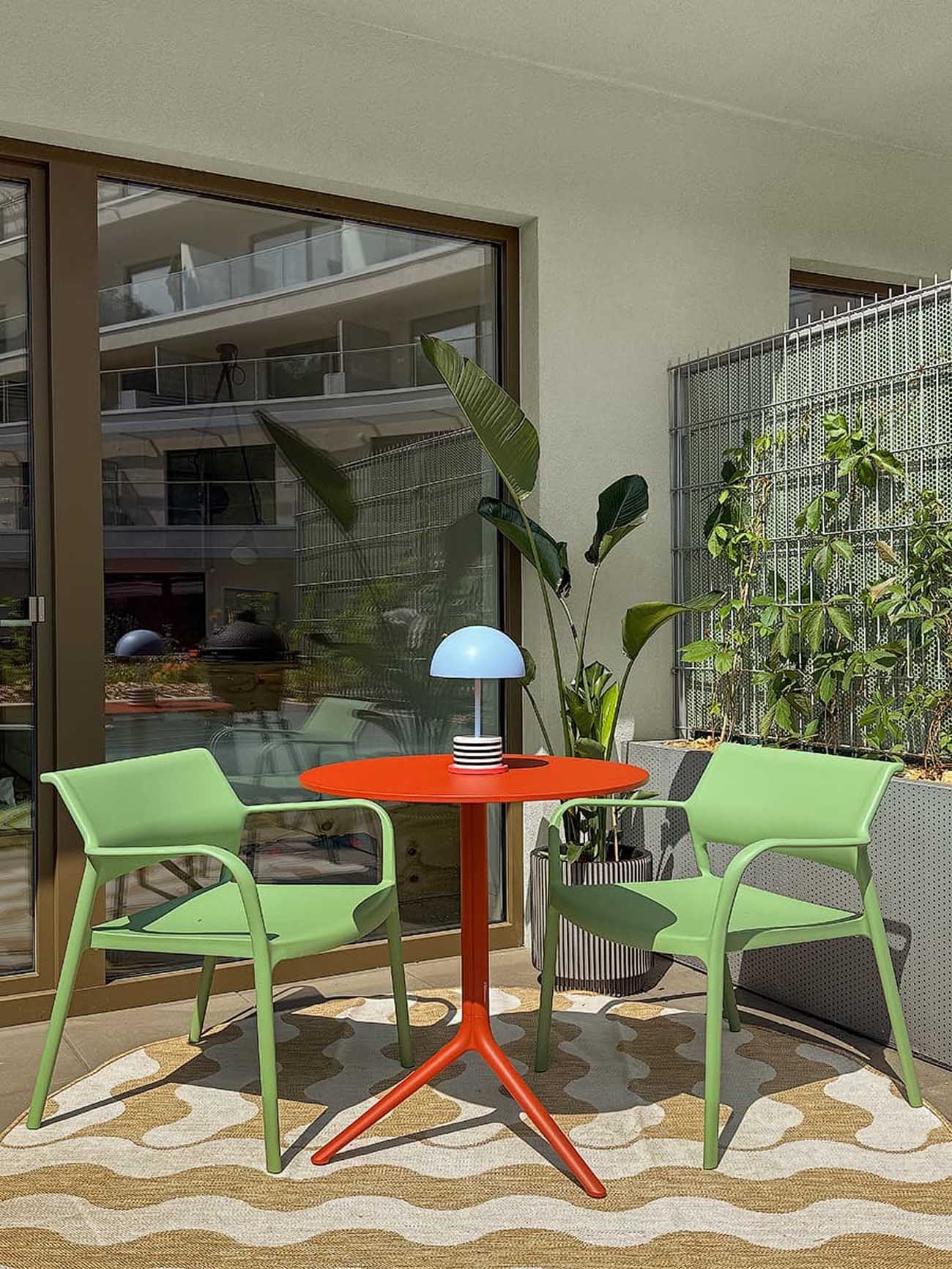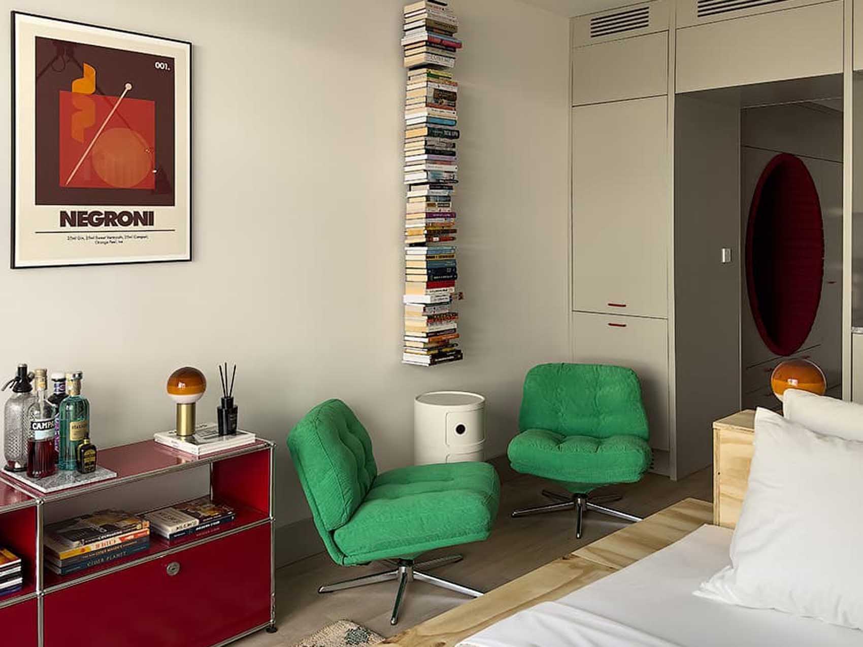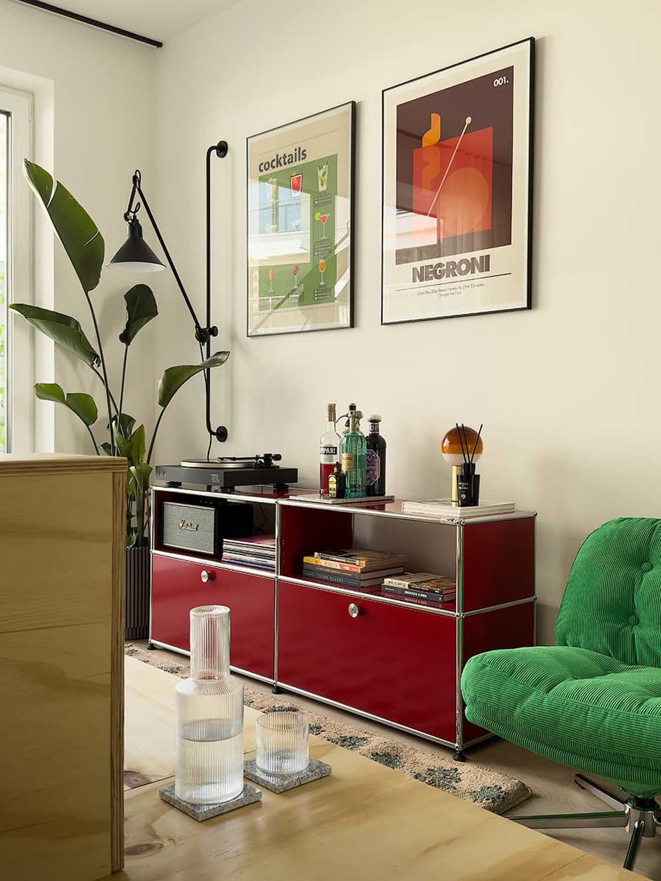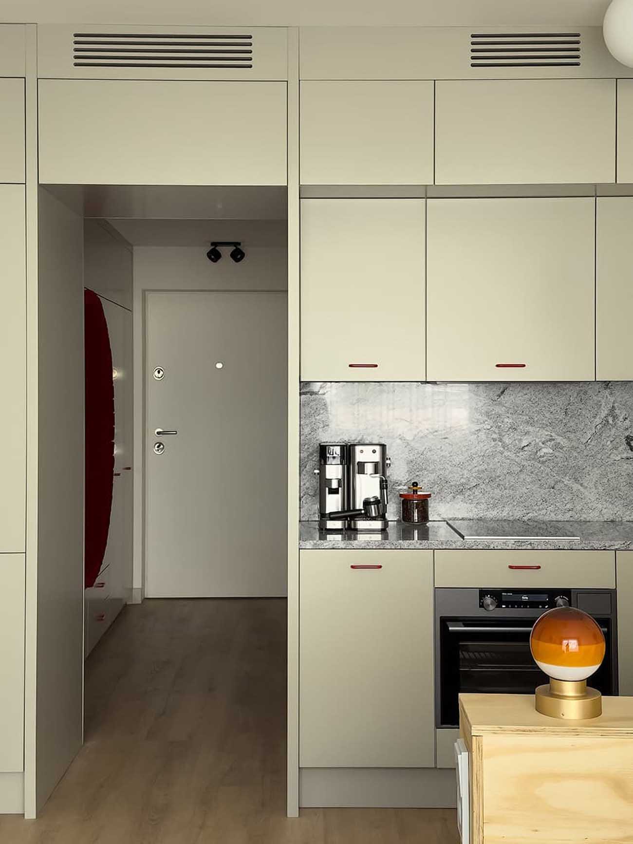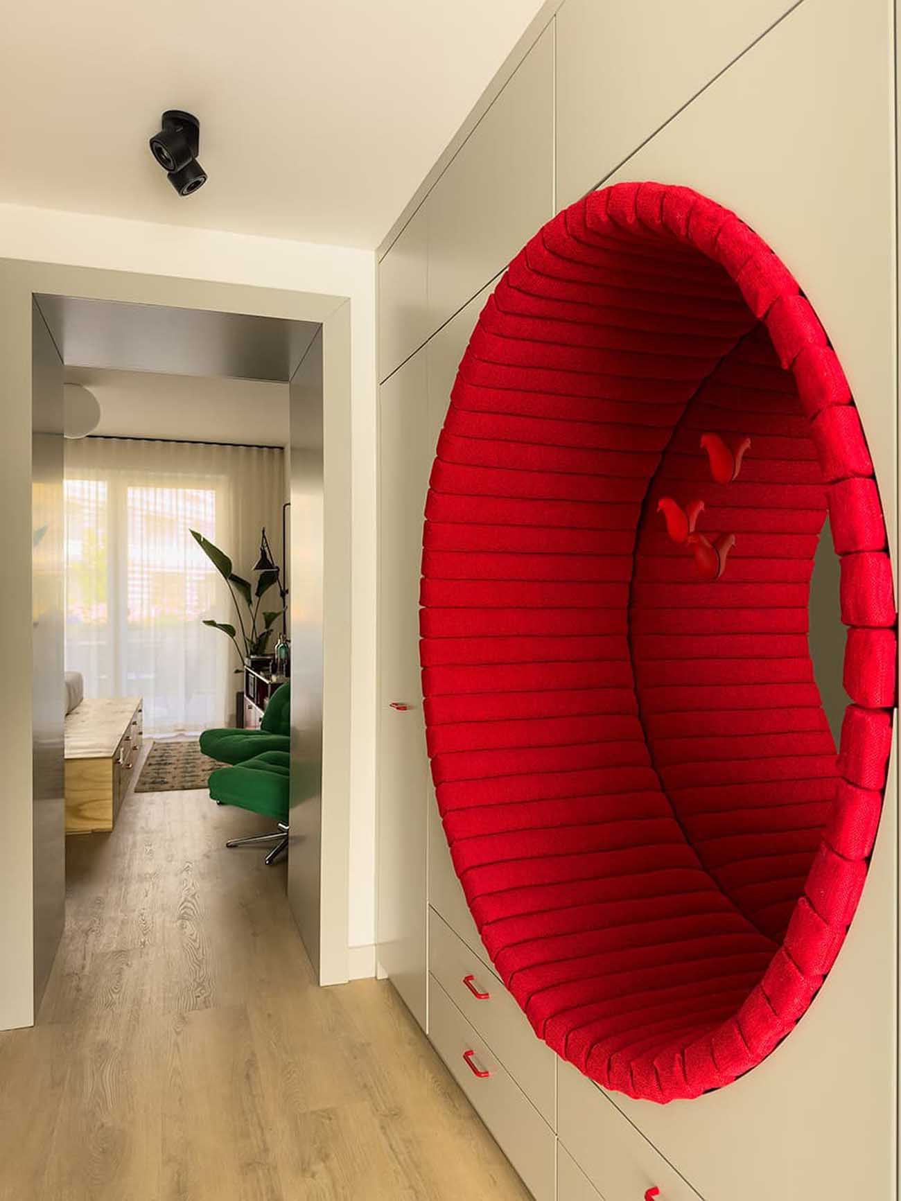 A bejáratnál a tervezők gardróbszekrényeket és fiókos tárolókat alakítottak ki. Itt jelenik meg az enteriőr fő dekoratív motívuma: egy kör alakú, élénkvörös falfülke. A bátor színhasználatnak (és a kiegészítőknek) köszönhetően a lakást oldott, kozmopolita és finoman retro hangulat hatja át.