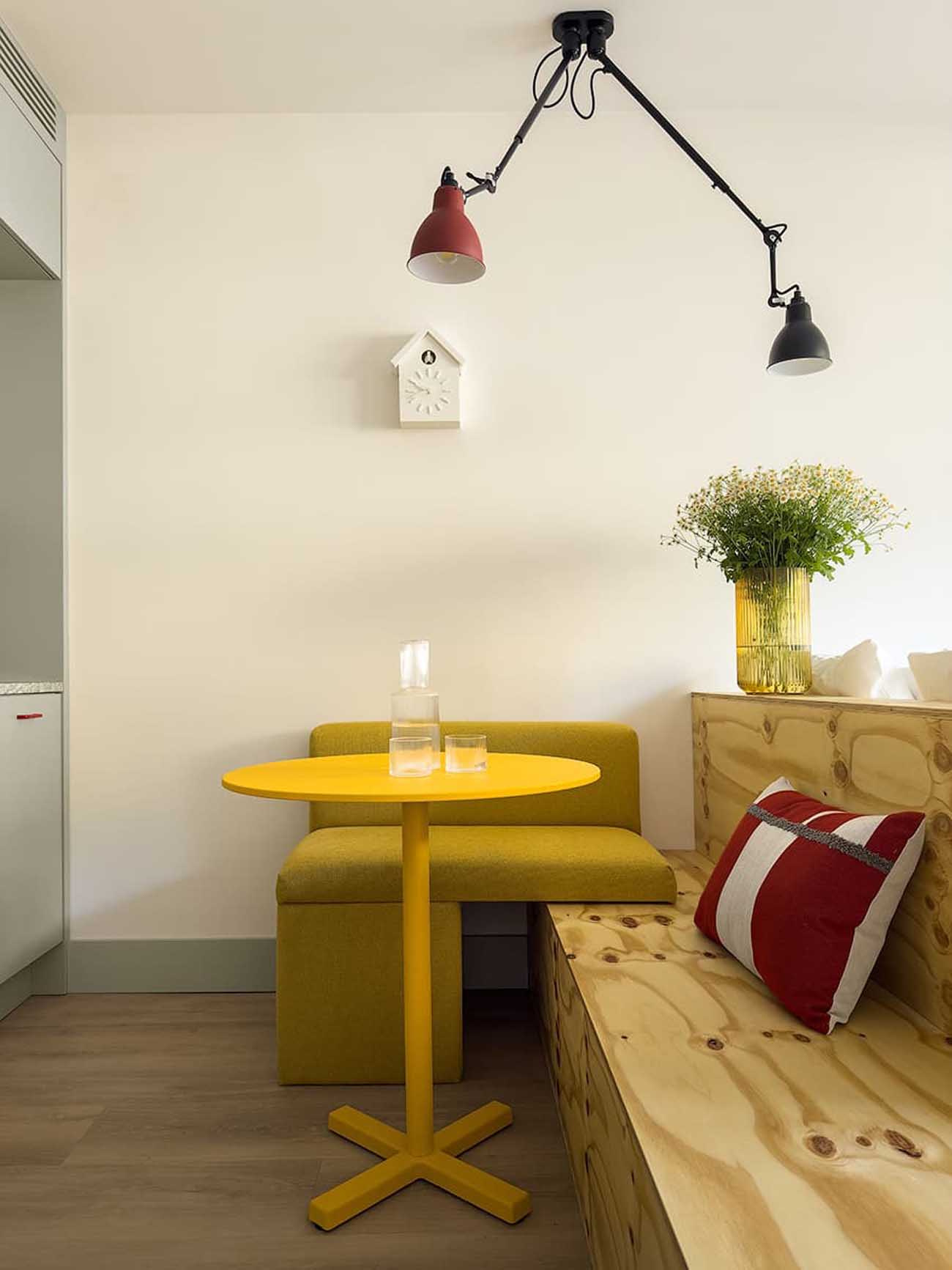 Annak érdekében, hogy elkerüljék a komolyabb építészeti beavatkozásokat és a vésést, a meglévő mennyezeti kiállásokat kreatívan hasznosították: a süllyesztett szpotok helyére különböző átmérőjű, gömbölyded függesztékek kerültek. A sárga fotel felett egy állítható karú dizájner lámpa, a komódnál pedig egy modern falikar gondoskodik a helyi megvilágításról, alkalmazkodva a bútorok pozíciójához.