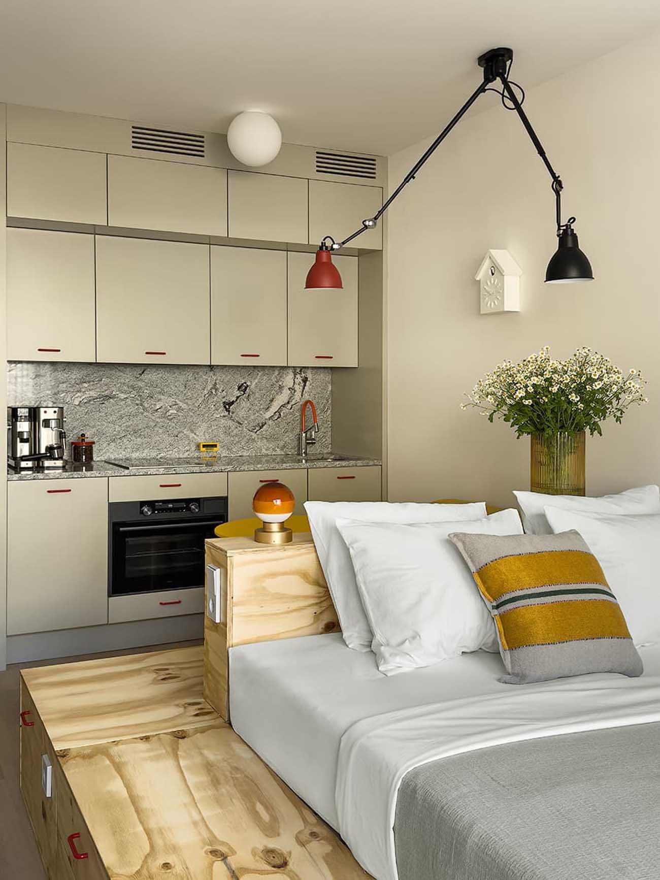 A csapatnak adott volt a befejezett alap, amelyet bútorokkal és dekorációval kellett megtölteniük, ám a helyiség elnyújtott geometriája kihívás elé állította a koncepció alkotóit. Az enteriőr központi eleme egy egyedi tervezésű, dobogóra emelt ágy lett.