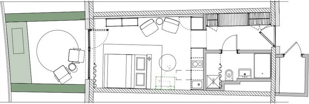 A saját terasszal rendelkező kis 30 m2-es lakásban nem állandó jelleggel, inkább csak munkájához kapcsolódóan rövidebb időszakokra lakik a tulajdonos, így a kompakt teret a minőségi pihenés igényével alakíttatta ki. A tervezők feladata egy burkolatokkal már ellátott, de bútorozatlan tér – előszoba, fürdő és egy lakószoba – komplett stúdiólakássá formálása volt.