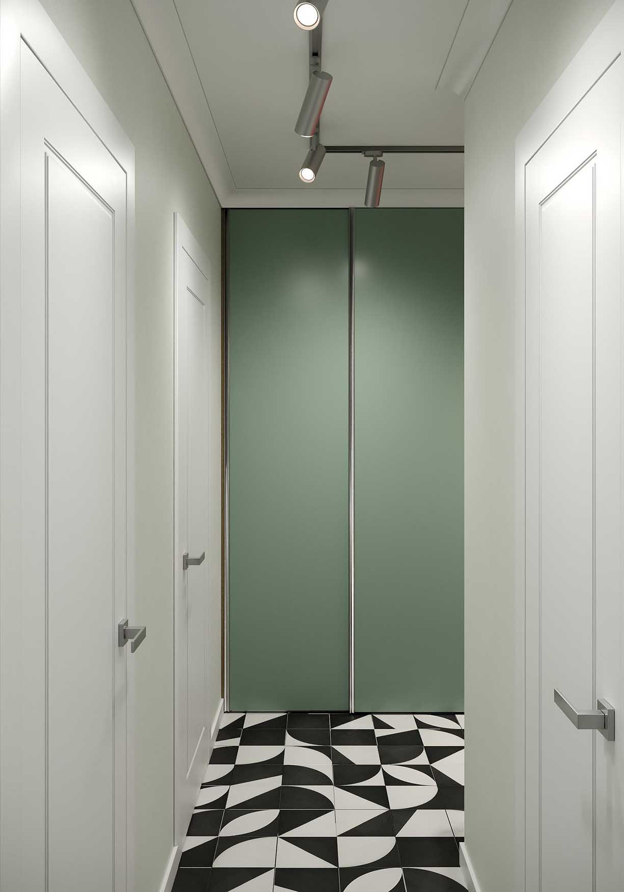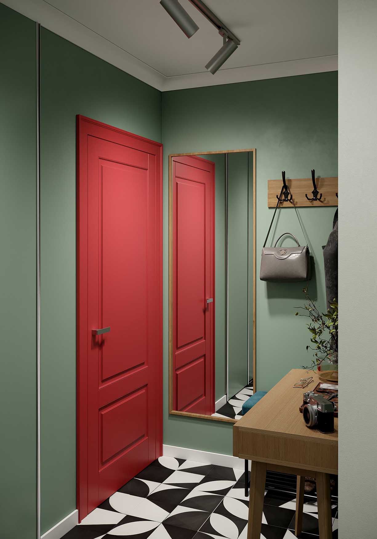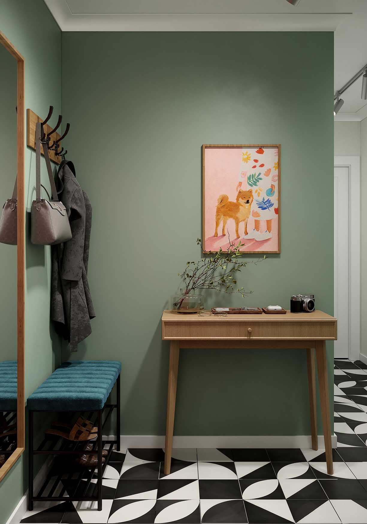 Az alaphangulatot a zöldre festett falakkal körbevett piros bejárati ajtó határozza meg – élénk színe magára vonzza a figyelmet, és eltereli azt a helyiség kis méretéről. Minden más elem fa dekorációt kapott, ami összhangban van a lakás többi részén megjelenő fa tárgyakkal.