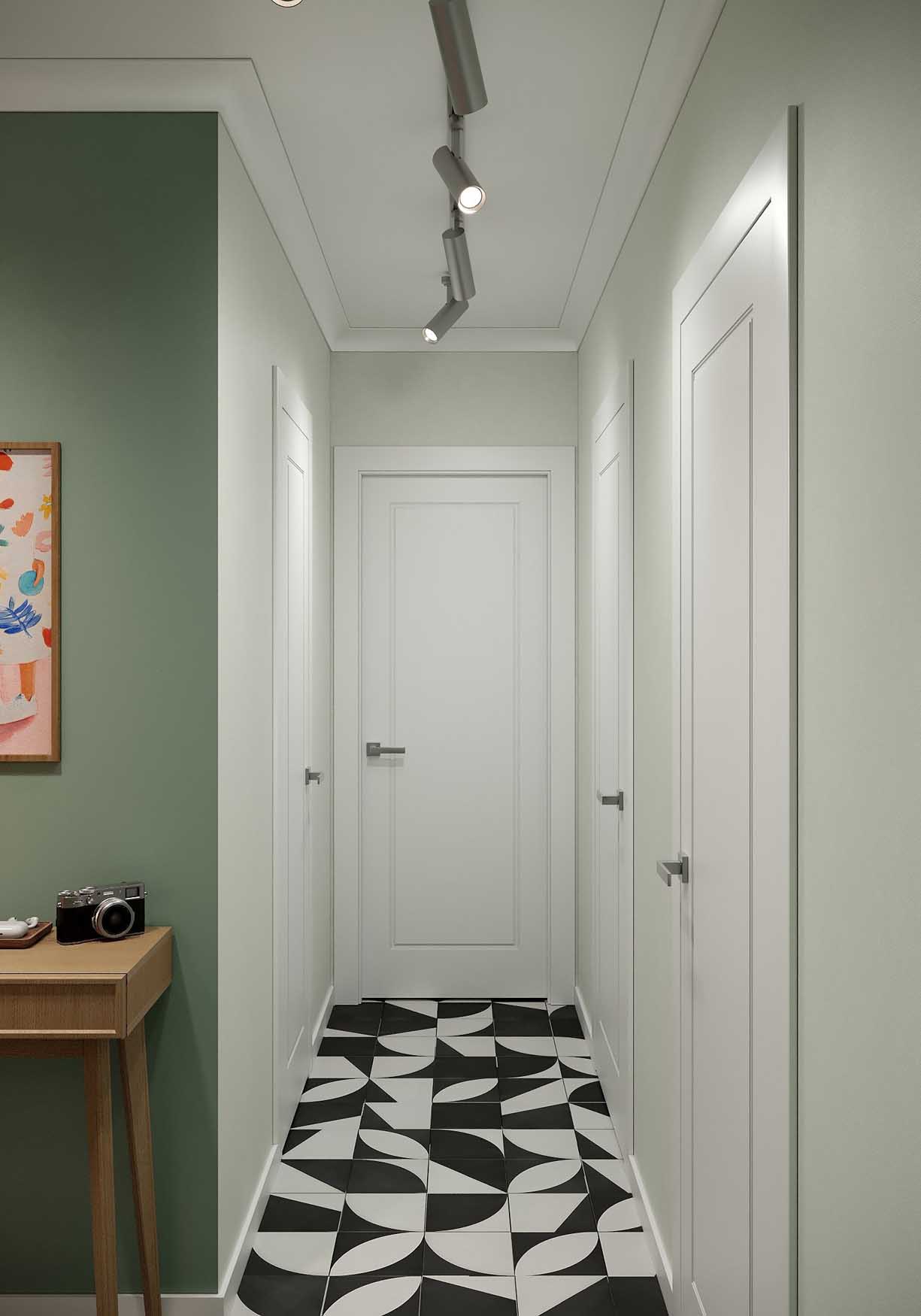 A folyosó részen sokkal világosabb zöld falszínt alkalmaztak, hogy elkerüljék az erős kontrasztot a fehér ajtókkal.