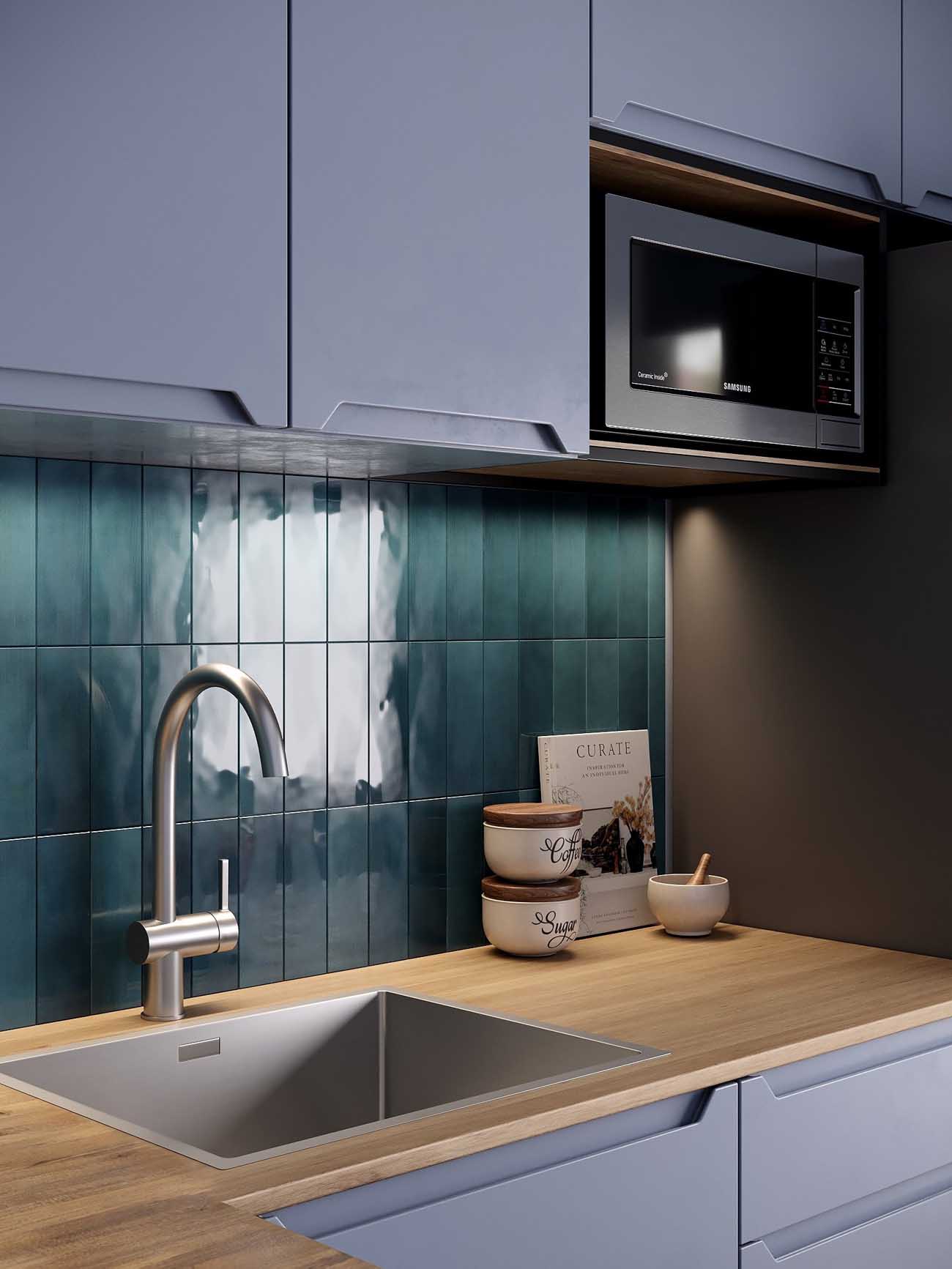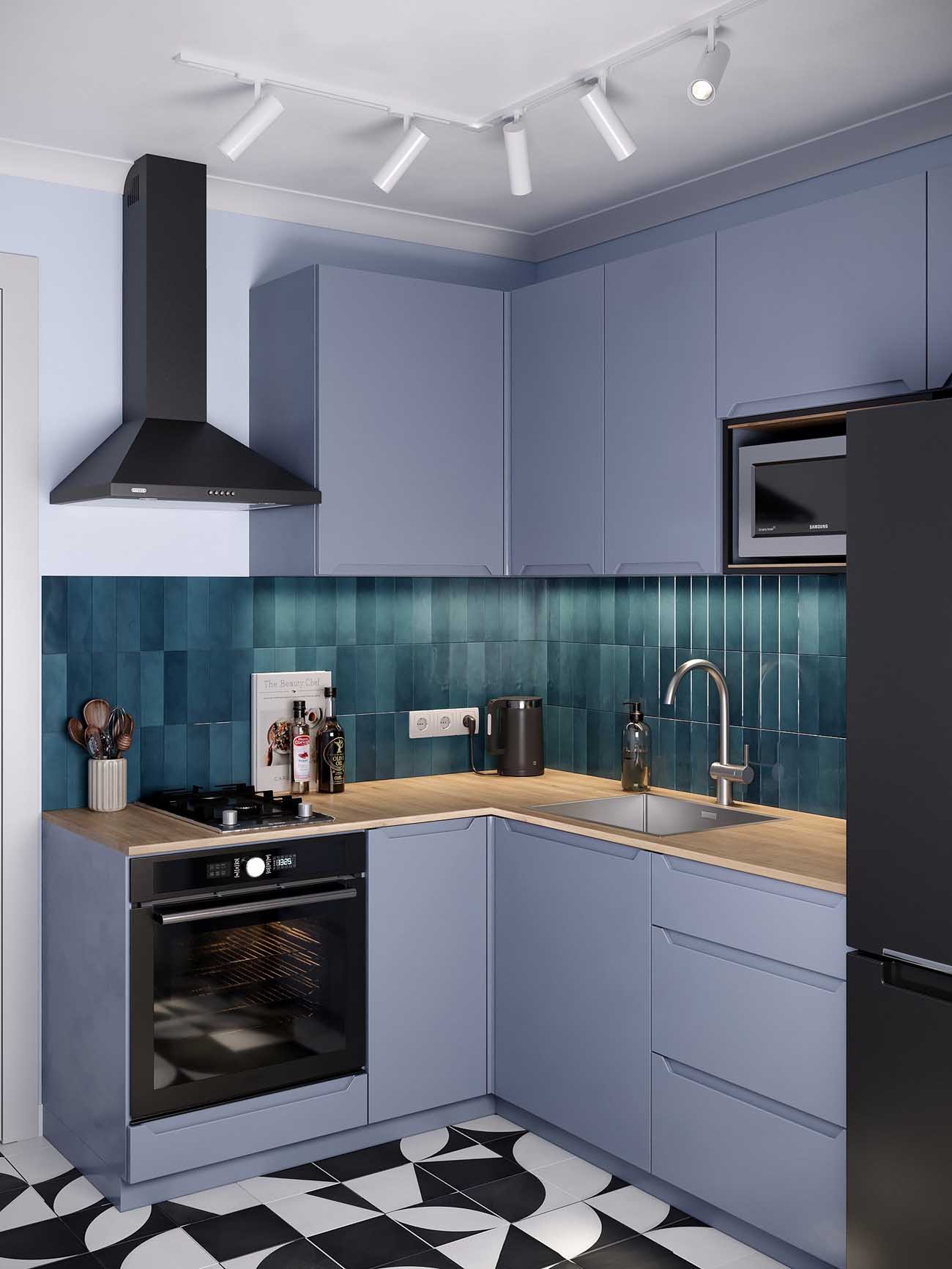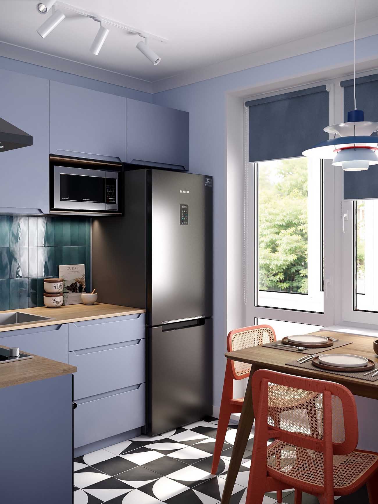 A konyhabútort standard méretű elemekből állították össze. Egy finom, kékes árnyalatot választottak, amelyet a spanyol Equipe zöldeskék, kisméretű csempéiből készült hátfal egészít ki. A fekete háztartási gépek és a padlólapok fekete-fehér mintázata ad markáns kontrasztot a helyiségnek.