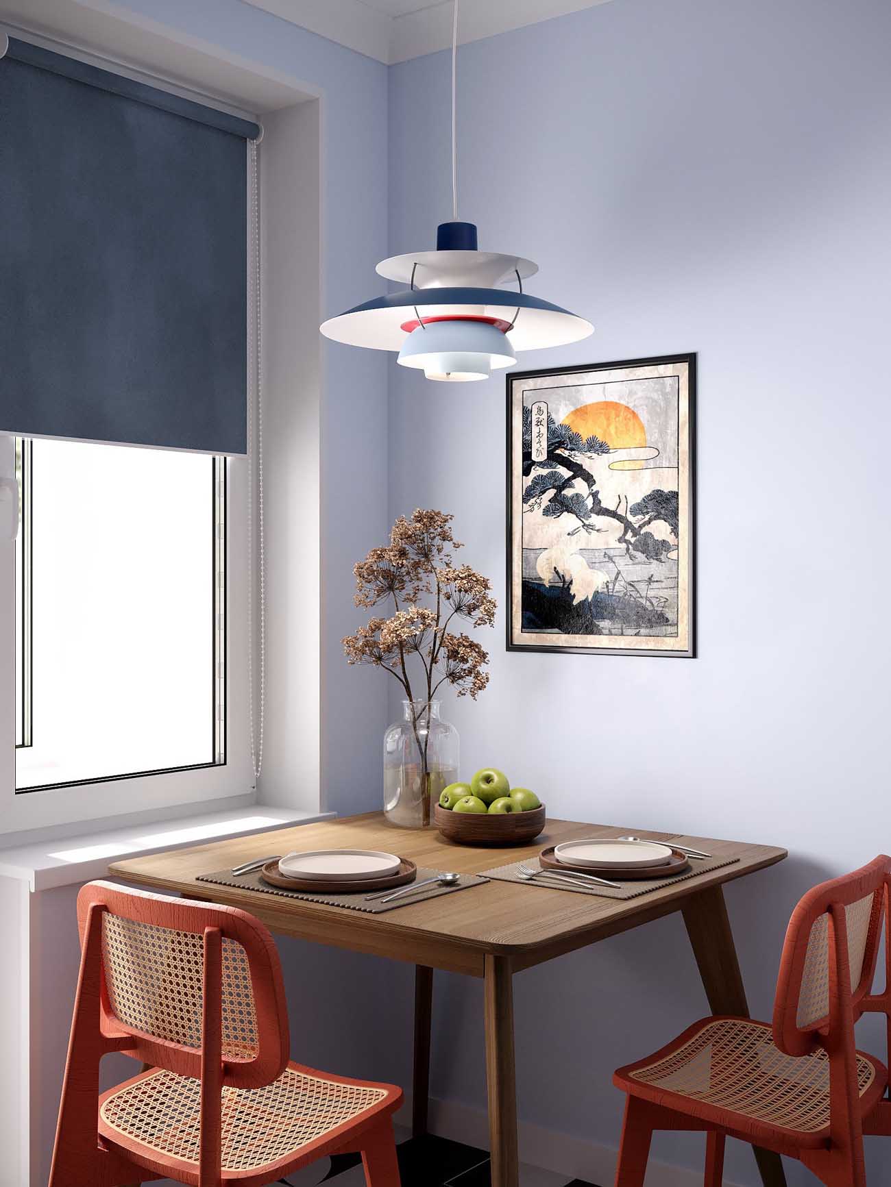 A tervező a kék és zöld árnyalatokat terrakotta színű étkezőszékekkel párosította. A pár hölgy tagja rajong a japán kultúráért – így nádszövet részletekkel készült bútorokat és az asztal fölé egy tematikus posztert választottak.