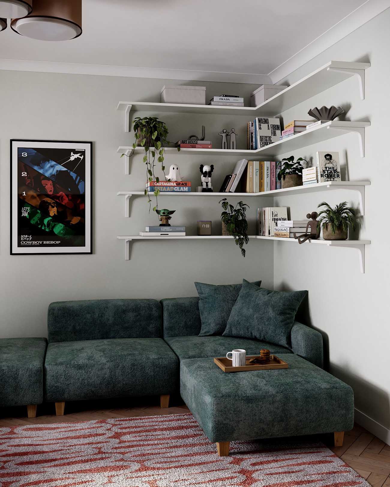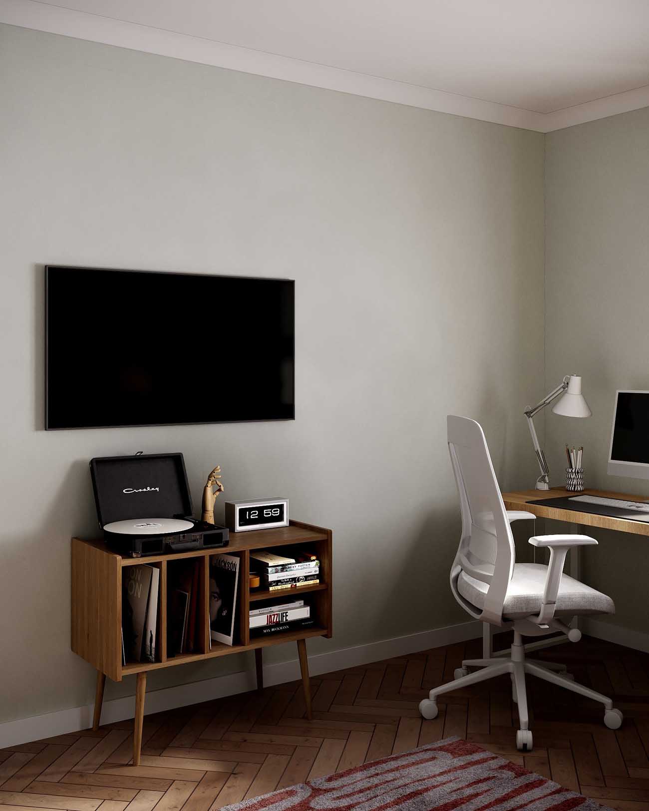 A nappali a legnagyobb helyiség ebben a kétszobás lakásban. Egyszerre funkcionál pihenőszobaként és dolgozószobaként, két munkaállomással, mivel a tulajdonosok otthonról dolgoznak. Moduláris kanapét választottak, hogy vendégek érkezése esetén a felállást könnyen variálni lehessen. A nyitott polcokon a házikönyvtár és különböző dekorációk kapnak majd helyet.