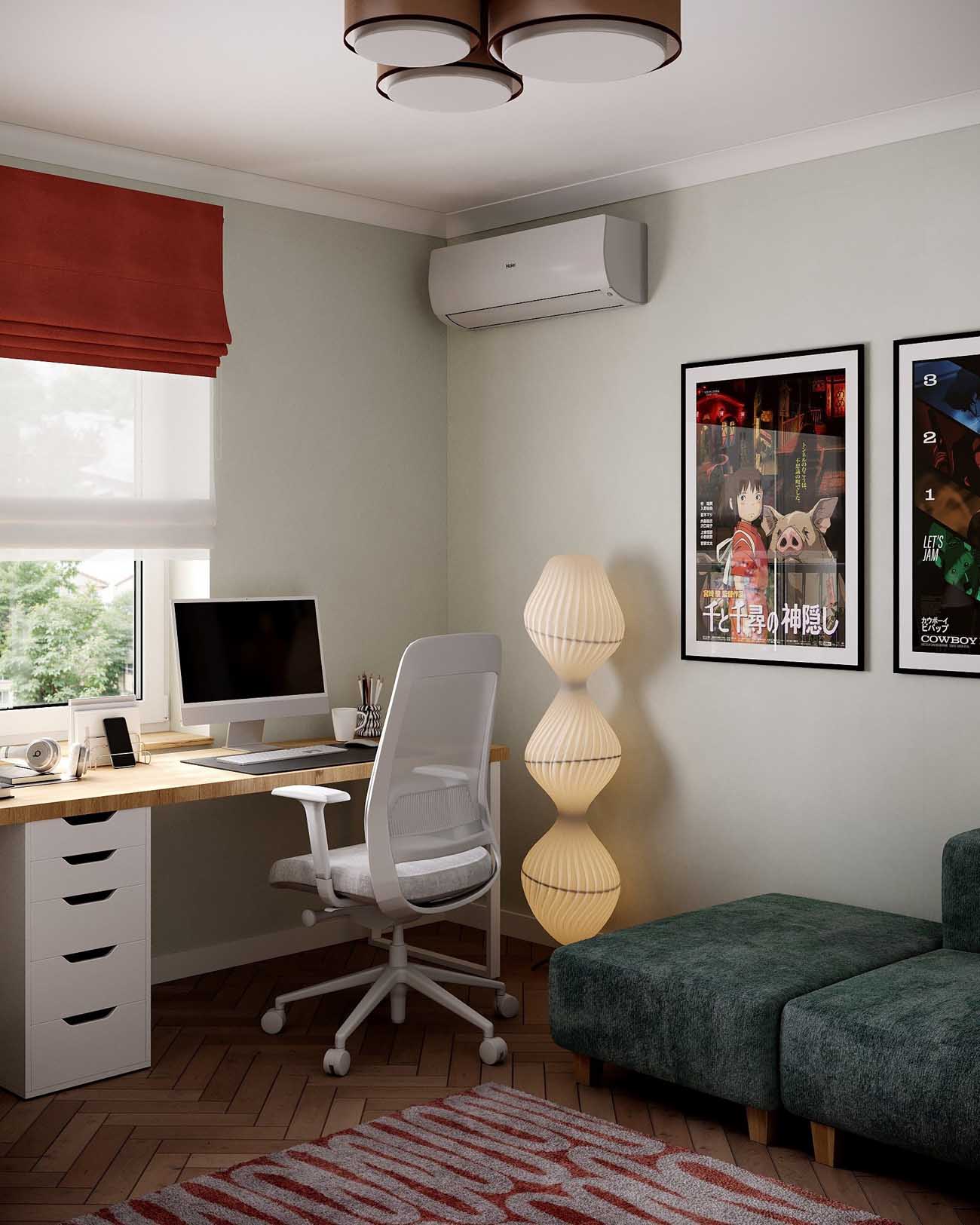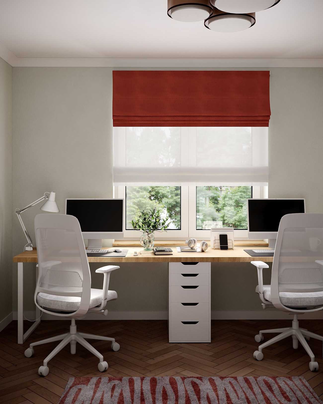 A két személy számára kialakított munkahely az ablakos fal mentén található. „Azt javasoltam, hogy használjunk egy standard fa konyhai munkalapot, amelyet fém lábakkal és egy fiókos szekrénnyel egészítünk ki” – meséli a tervező. – „Ez egy egyszerű és költséghatékony megoldás.”