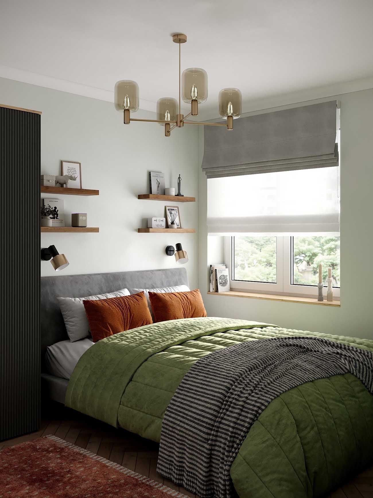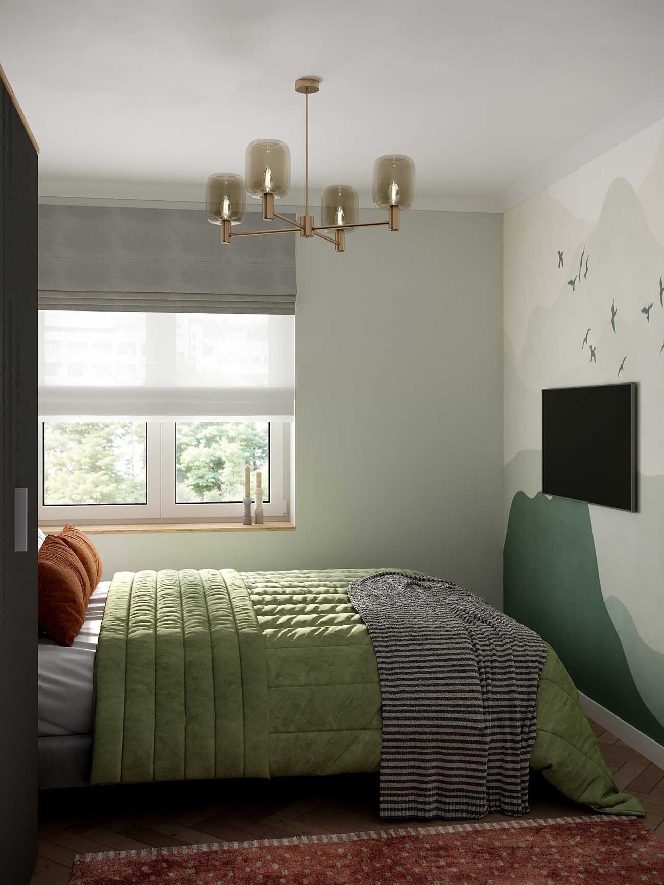 A hálószoba berendezésénél figyelembe kellett venni a megbízók már meglévő bútorait – egy grafitszürke szekrényt és egy szürke ágyat. A színpaletta változatosabbá tétele érdekében fa elemekkel, színes textíliákkal egészítették ki a teret, az ággyal szemközti falat pedig egy hegyeket vagy dombokat ábrázoló tapéta díszíti.