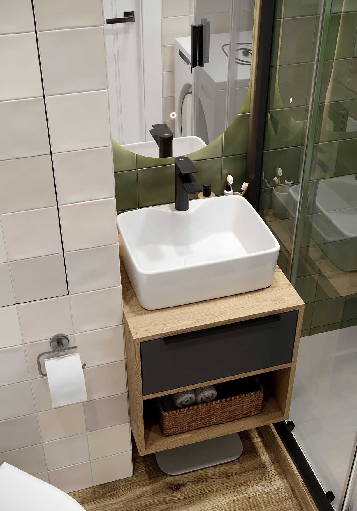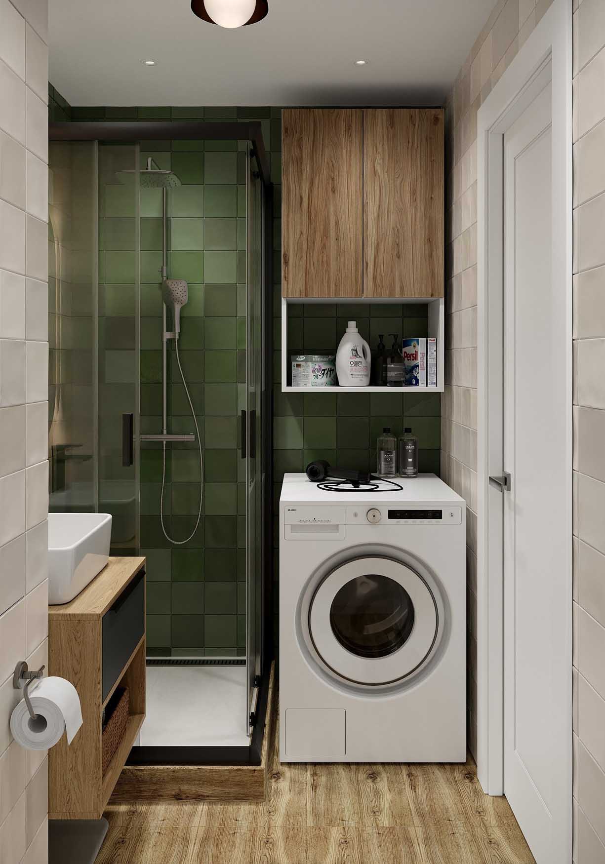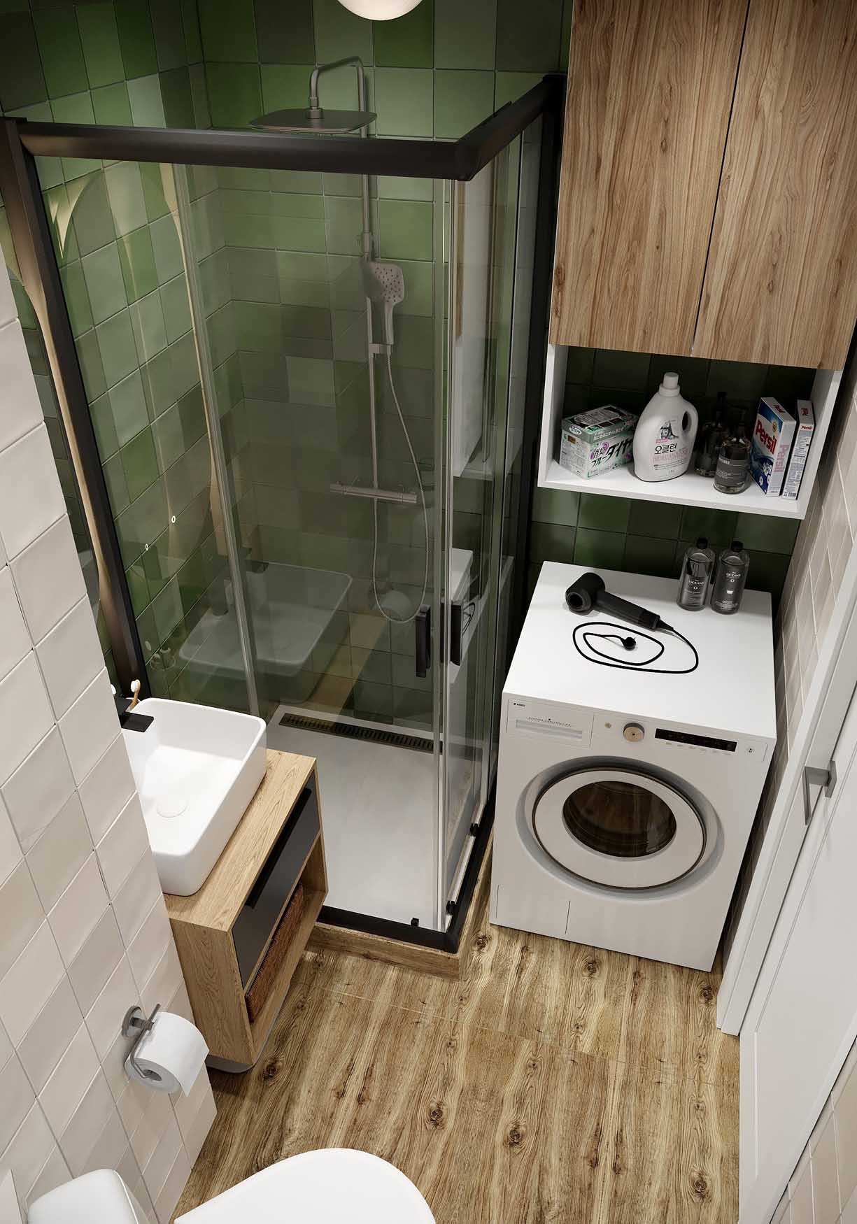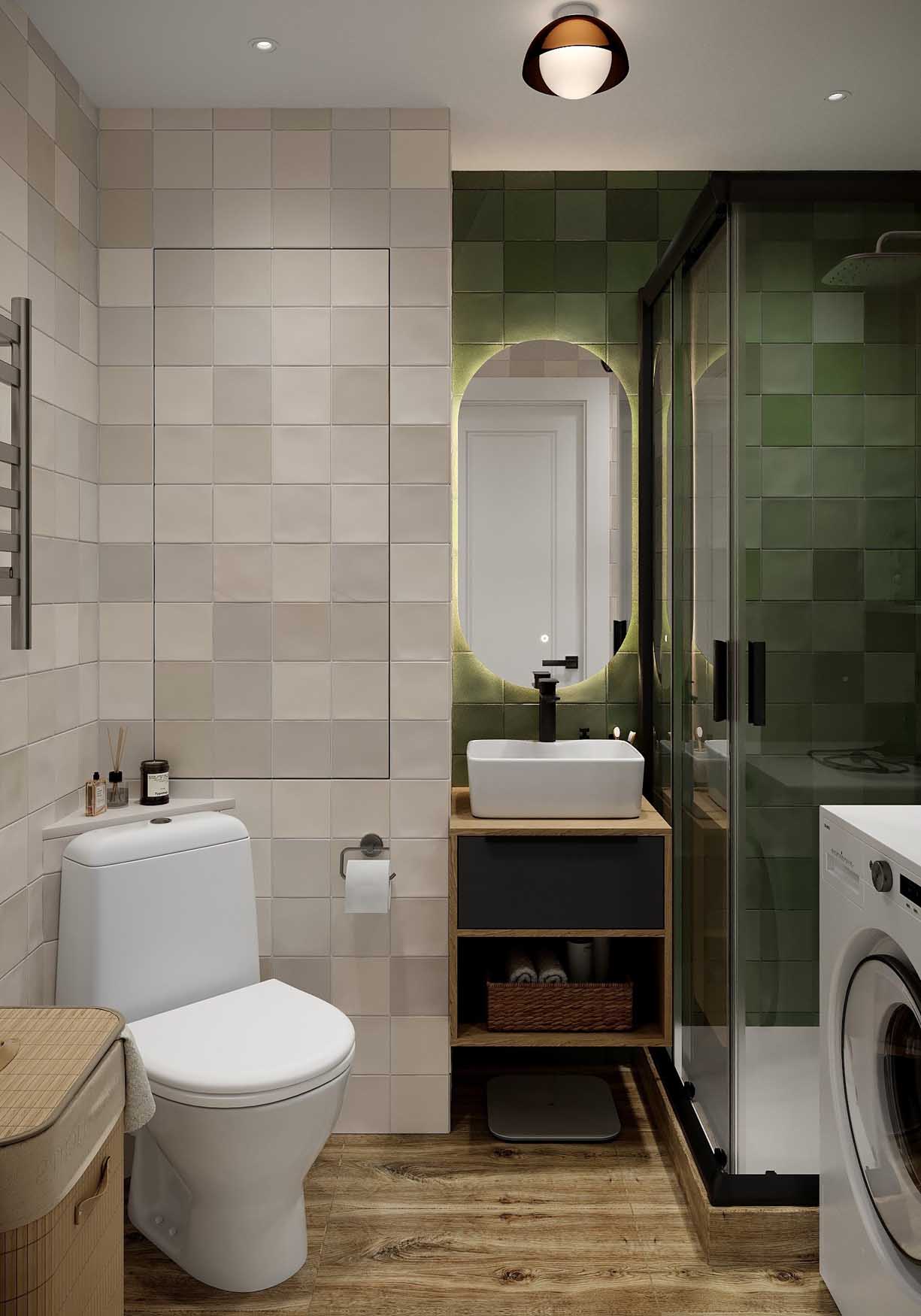 A sötétzöld csempe a fürdőszobában a megbízó hölgy kérése volt, ez adta az alapot szinte az egész lakás koncepciójához. Mivel a helyiség kicsi – mindössze 2,8 négyzetméter –, a falak alapszínéül bézs csempét választottak. A kádat zuhanykabinra cserélték, hogy mellette elférjen a mosógép, és egy tárolórészt is ki lehessen alakítani.