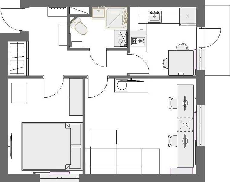 Az egyetlen átalakítás a fürdőszoba és a WC egybenyitása volt, hogy a helyiségben elférjen egy zuhanykabin, a mosdó, a WC és egy mosógép. A többi helyiség változatlan maradt.