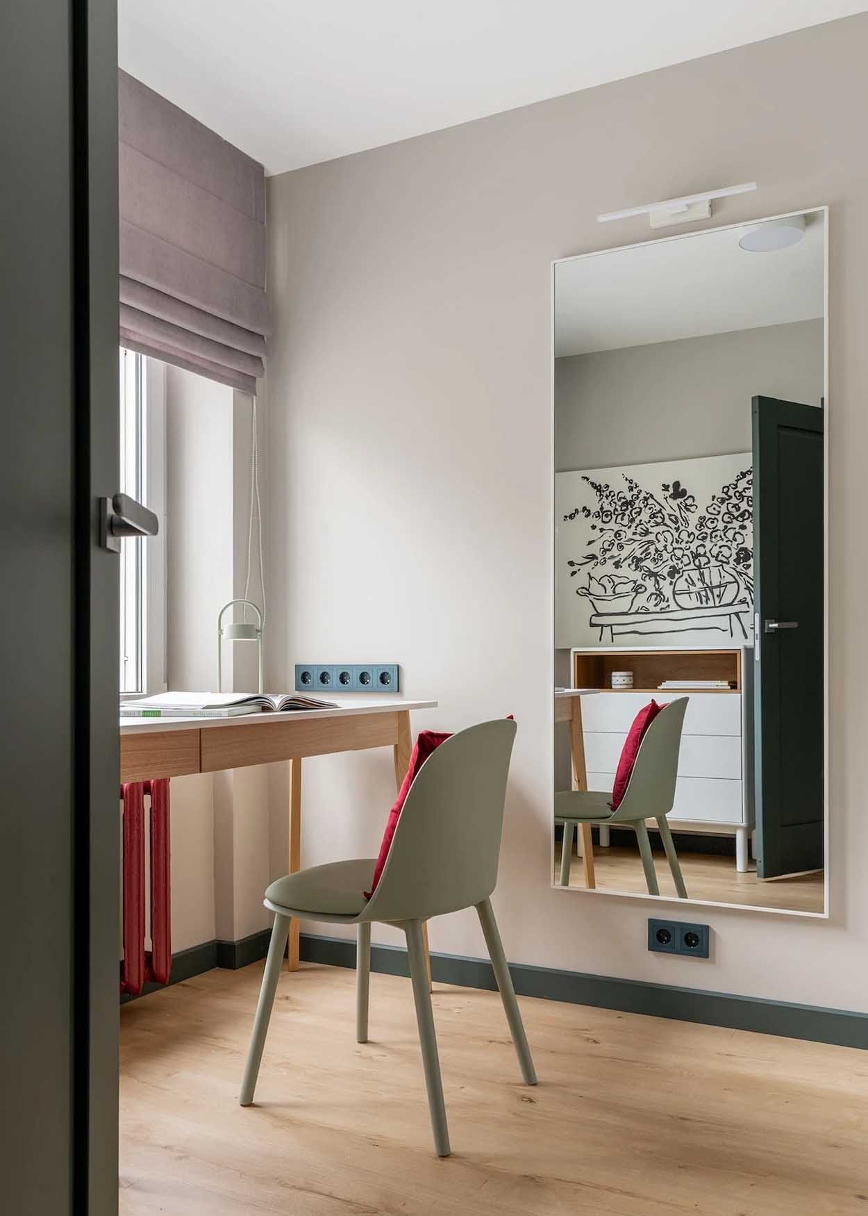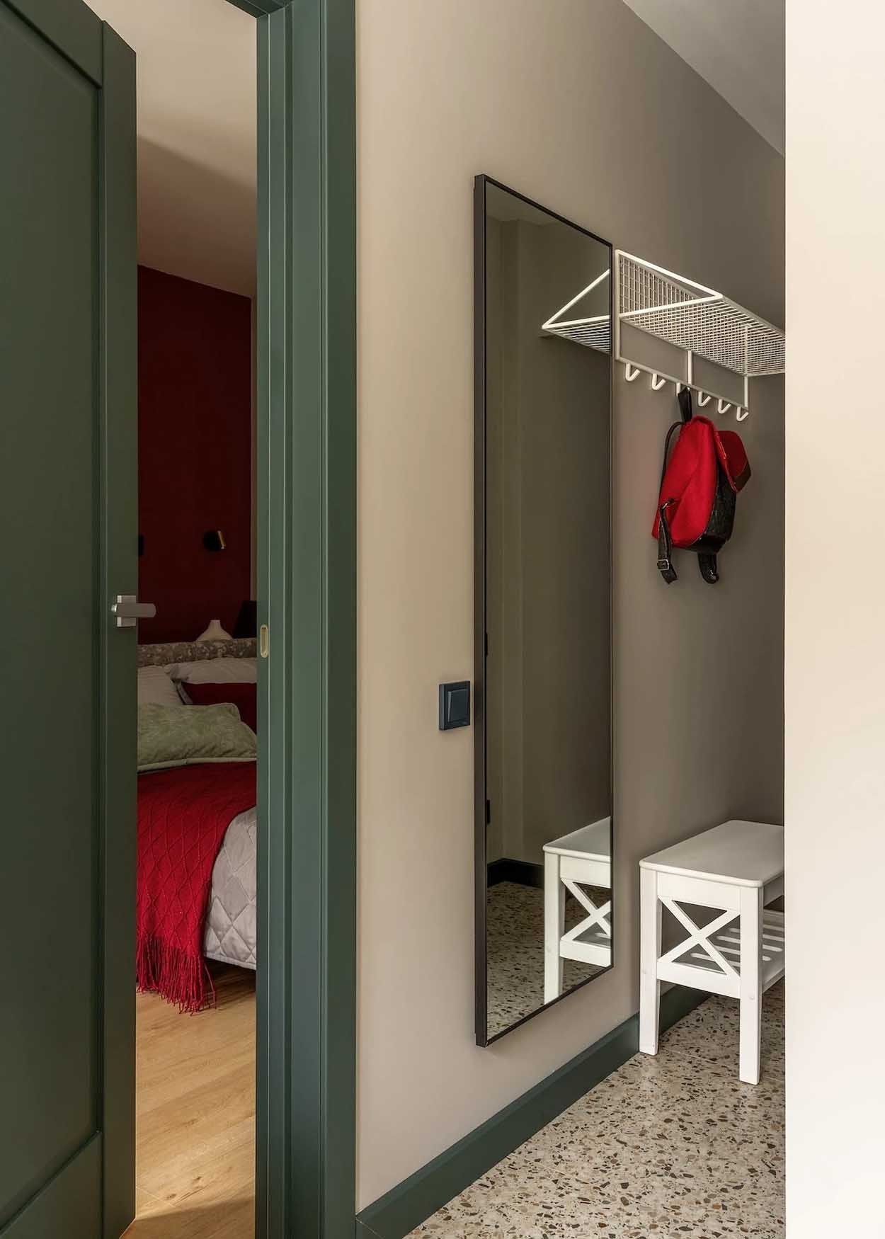 Az eredeti elrendezésen mindössze egyetlen, ám annál fontosabb módosítást végeztek: a szoba ajtaját áthelyezték. A bejárat így a konyha felől nyílik, ami pont elegendő helyet szabadított fel ahhoz, hogy a háló zónában kényelmesen elférjen egy franciaágy. A belső ajtók és a szegélylécek mély smaragdzöld árnyalatot kaptak, melyekhez tökéletesen passzoló, azonos színű kapcsolókat és dugaljakat választottak, így teremtve meg az anyagok közötti finom harmóniát.