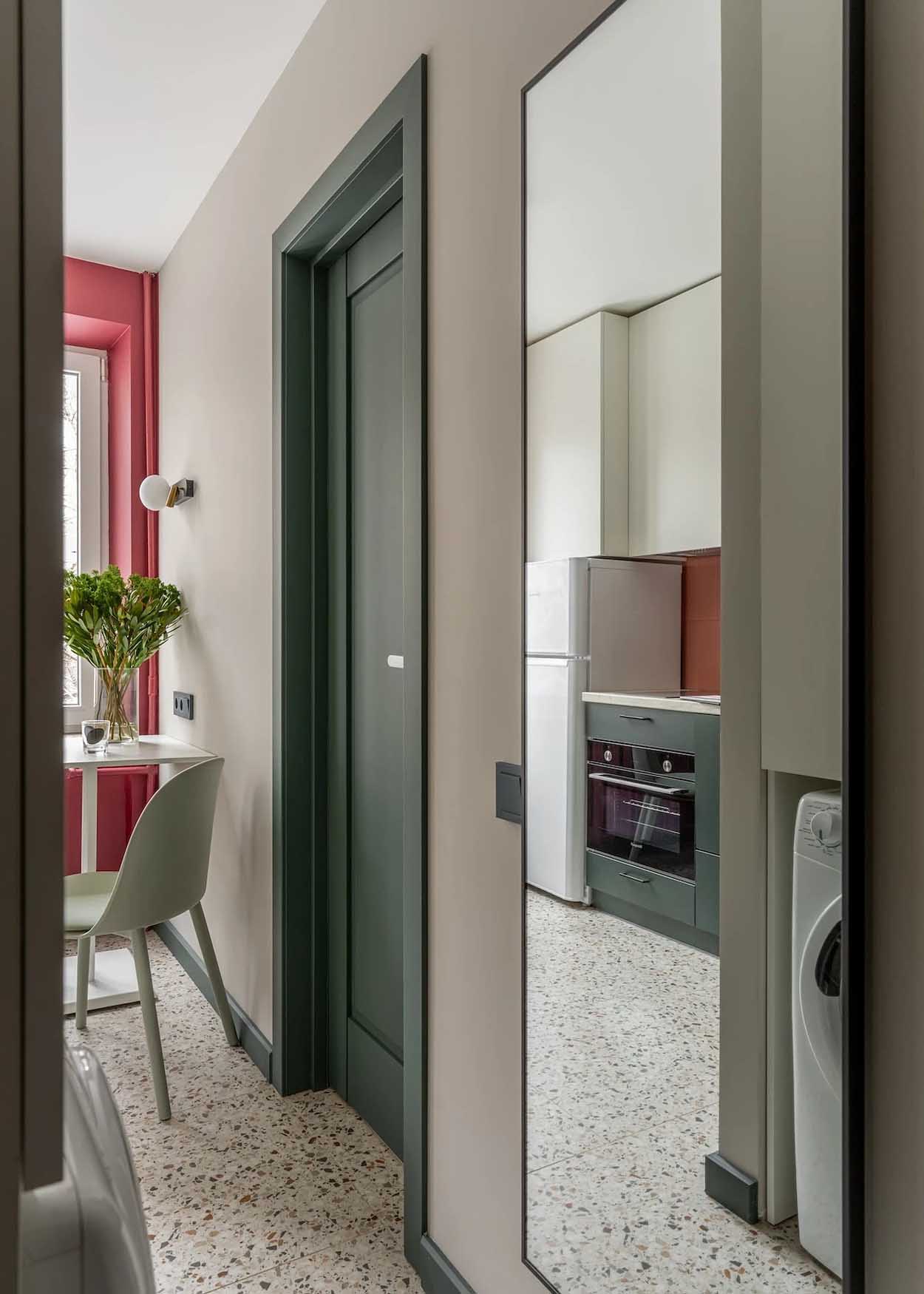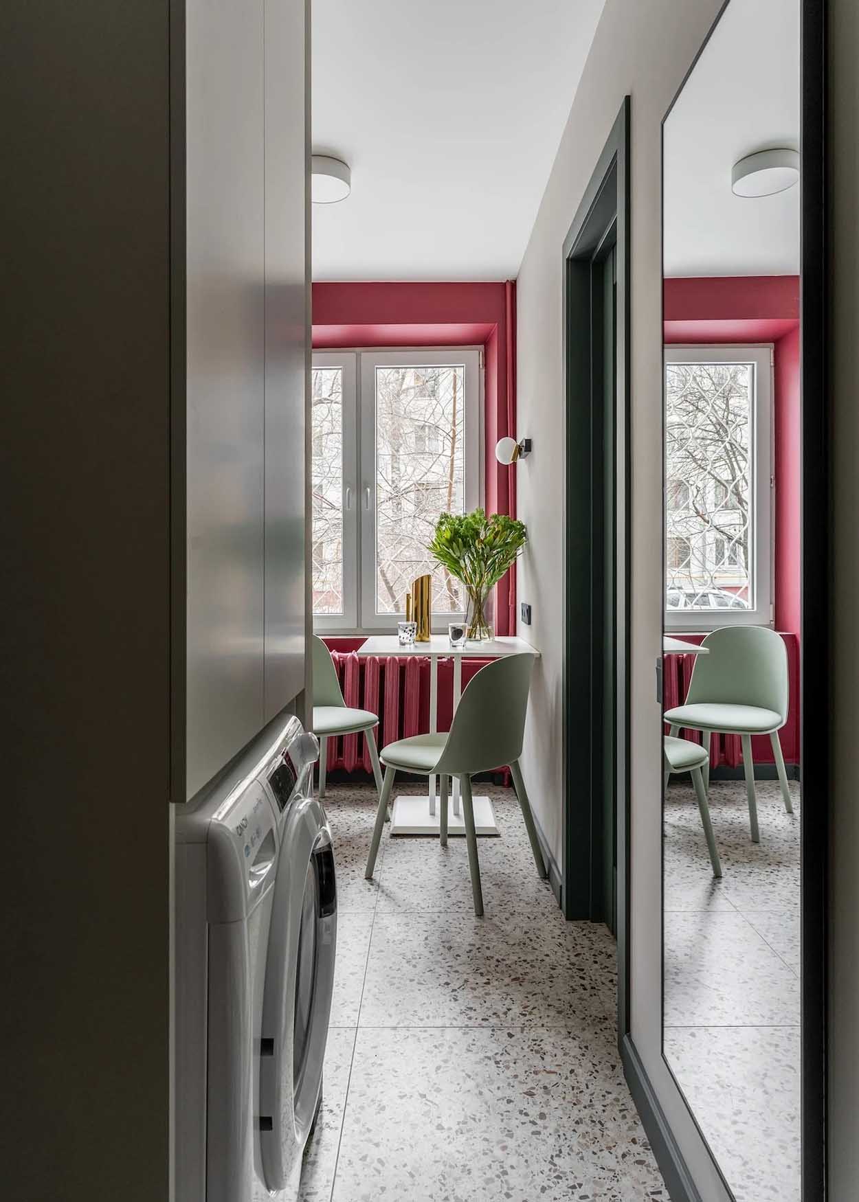 Az előszobában a padlót egy terrazzo mintás burkolat fedi, amelyet praktikussági okokból választottak, mivel vizuálisan remekül elrejti az apró szennyeződéseket. A térszervezés komoly kihívás volt a 20 négyzetméter alatti lakásban, különösen a tárolás és a mosó-szárítógép elhelyezése terén. Mivel a fürdőszobában nem jutott neki hely, a gép az előszobába került. Fölötte egy méretre szabott szekrényt alakítottak ki a tisztítószerek és a szennyes elrejtésére. A bejárati zónát egy beépített világítással rendelkező tükör látja el fénnyel.