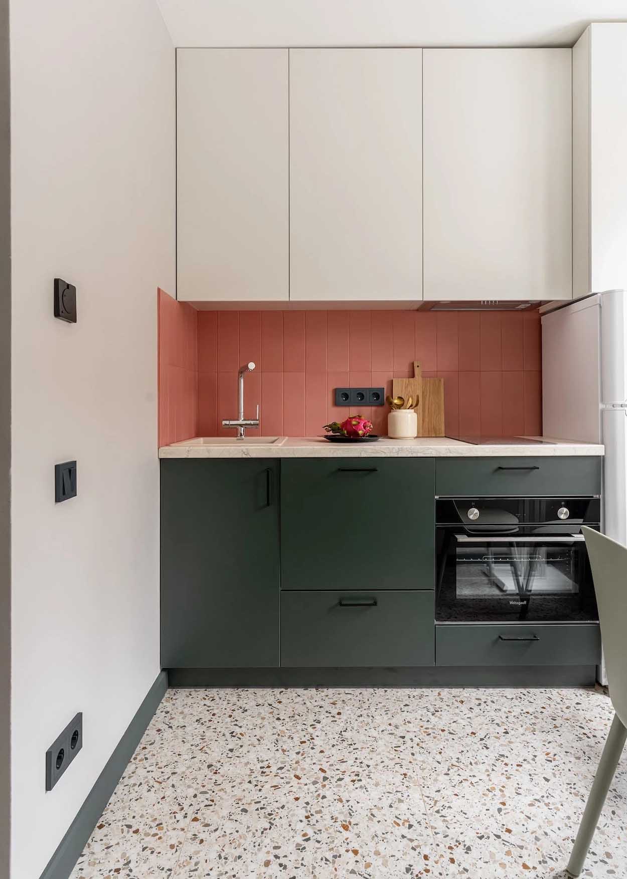 Az alig 5 négyzetméteres konyhában a terrazzo mintás padlólap folytatódik. A falfelületeken itt is megjelenik a világosszürke alap, azonban az ablakos fal, az ablaknyílások, sőt, a meghagyott régi öntöttvas radiátorok is a dizájn fókuszát jelentő vörösáfonya színt kapták. Az egyedi méretre készült konyhabútor egy sorban helyezkedik el: beépített sütő, egy kompakt mosogatógép és egy alacsony hűtőszekrény is elfért benne. A tárolókapacitás maximalizálása érdekében a felső szekrények egészen a mennyezetig érnek. Az étkezőasztal melletti falon egy két fényforrásos falikar gondoskodik a hangulatos világításról.