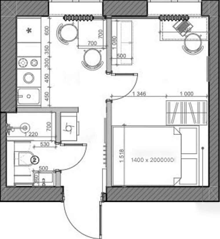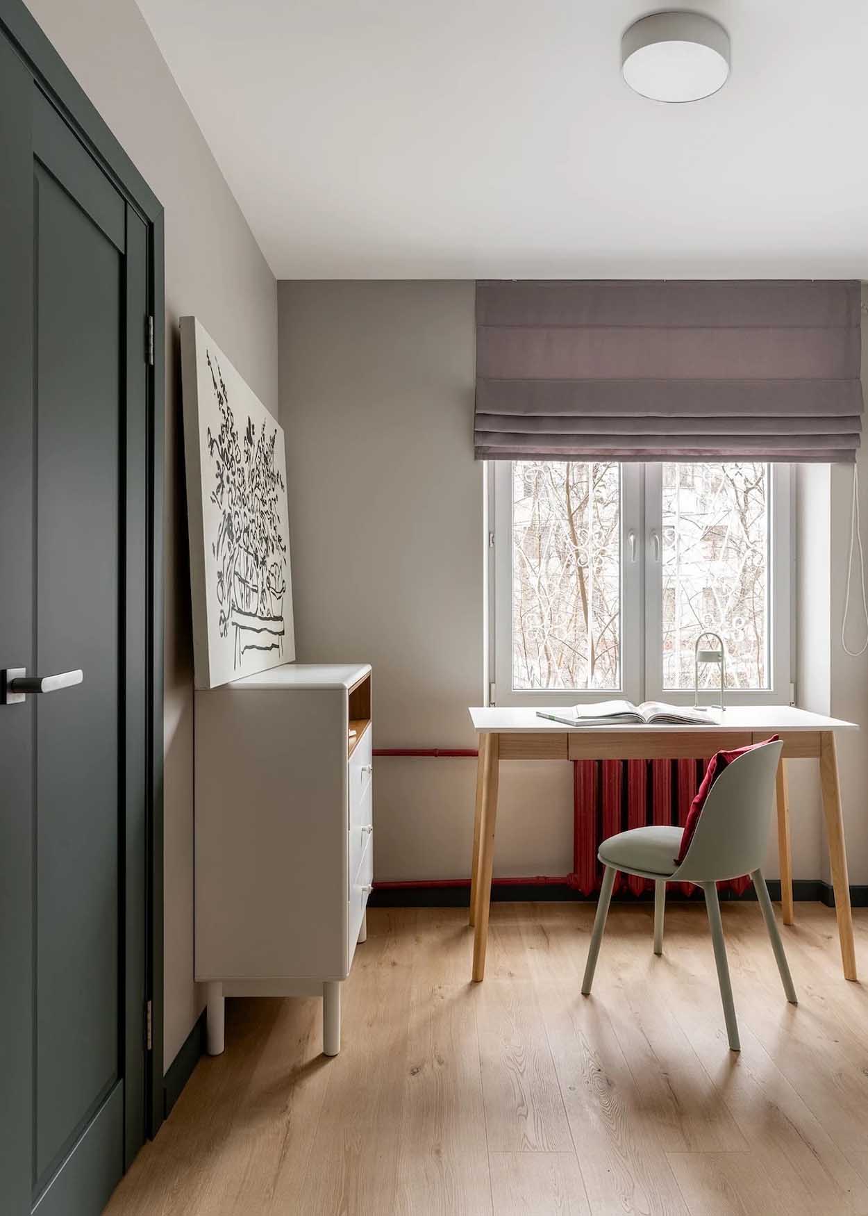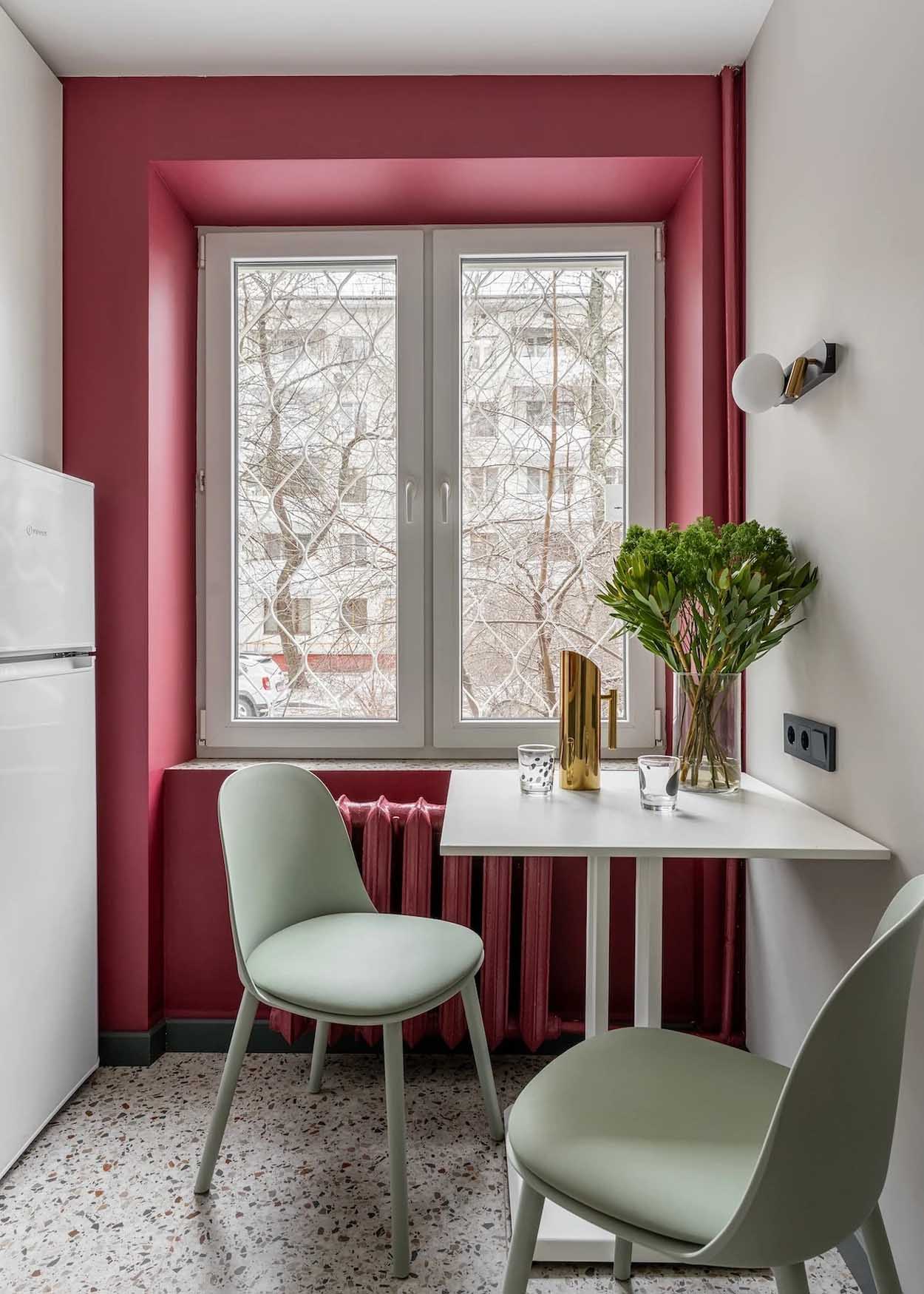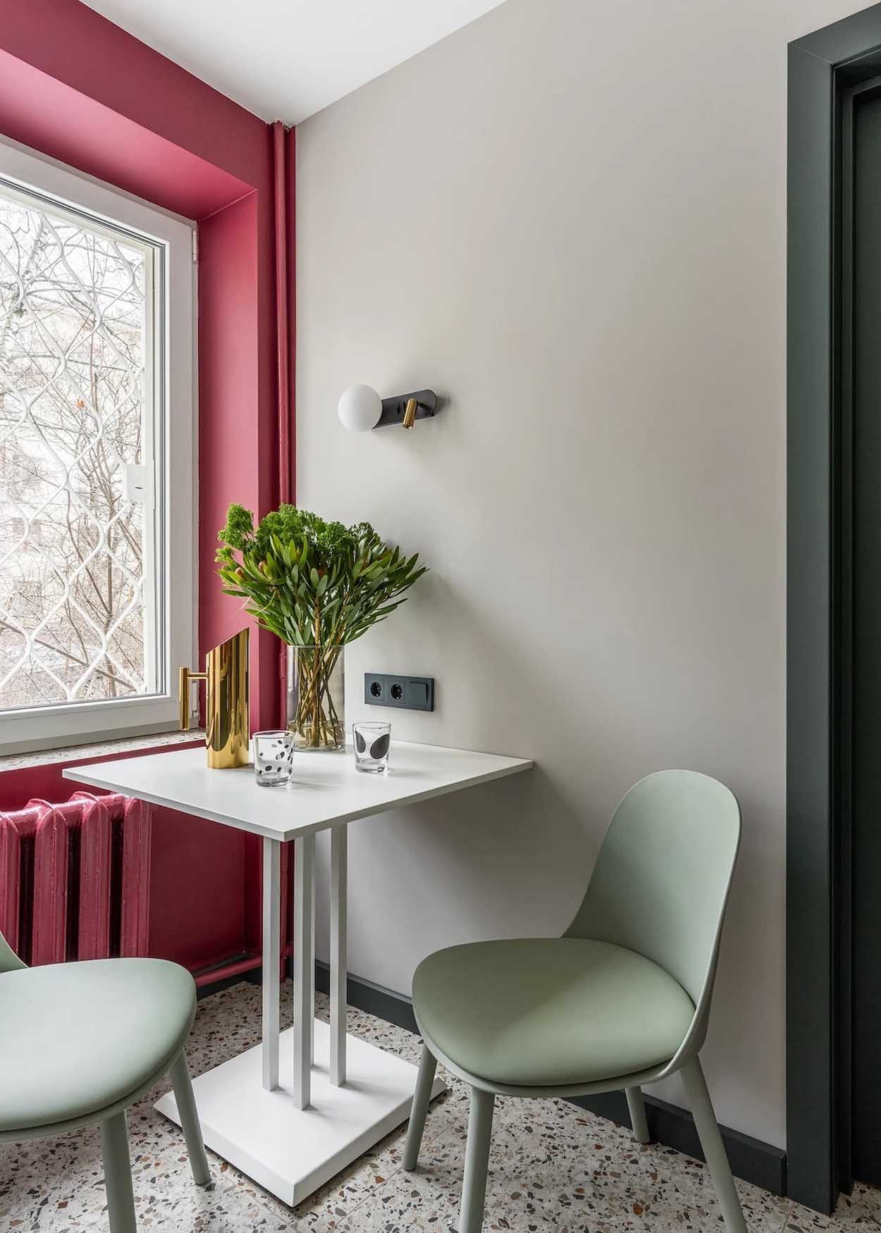 Ez az apró, mindössze 19,6 négyzetméteres lakás egy 1964-ben épült ház földszintjén található, alapterülete egy minigarzonénak felel meg. A feladat egy funkcionális és vonzó enteriőr kialakítása volt. Mivel a költségvetés szűkös volt, a tervező úgy döntött, hogy a drága építészeti megoldások helyett a színekkel operál: a letisztult világosszürke alapokat a vörösáfonya szín és a smaragdzöld markáns, figyelemfelkeltő kontrasztjával tette különlegessé. Az alacsony belmagasság miatt a függőlámpákat és csillárokat teljesen elvetették, így a lakásban mindenhol kizárólag mennyezetre szerelhető, illetve fali lámpatesteket alkalmaztak.