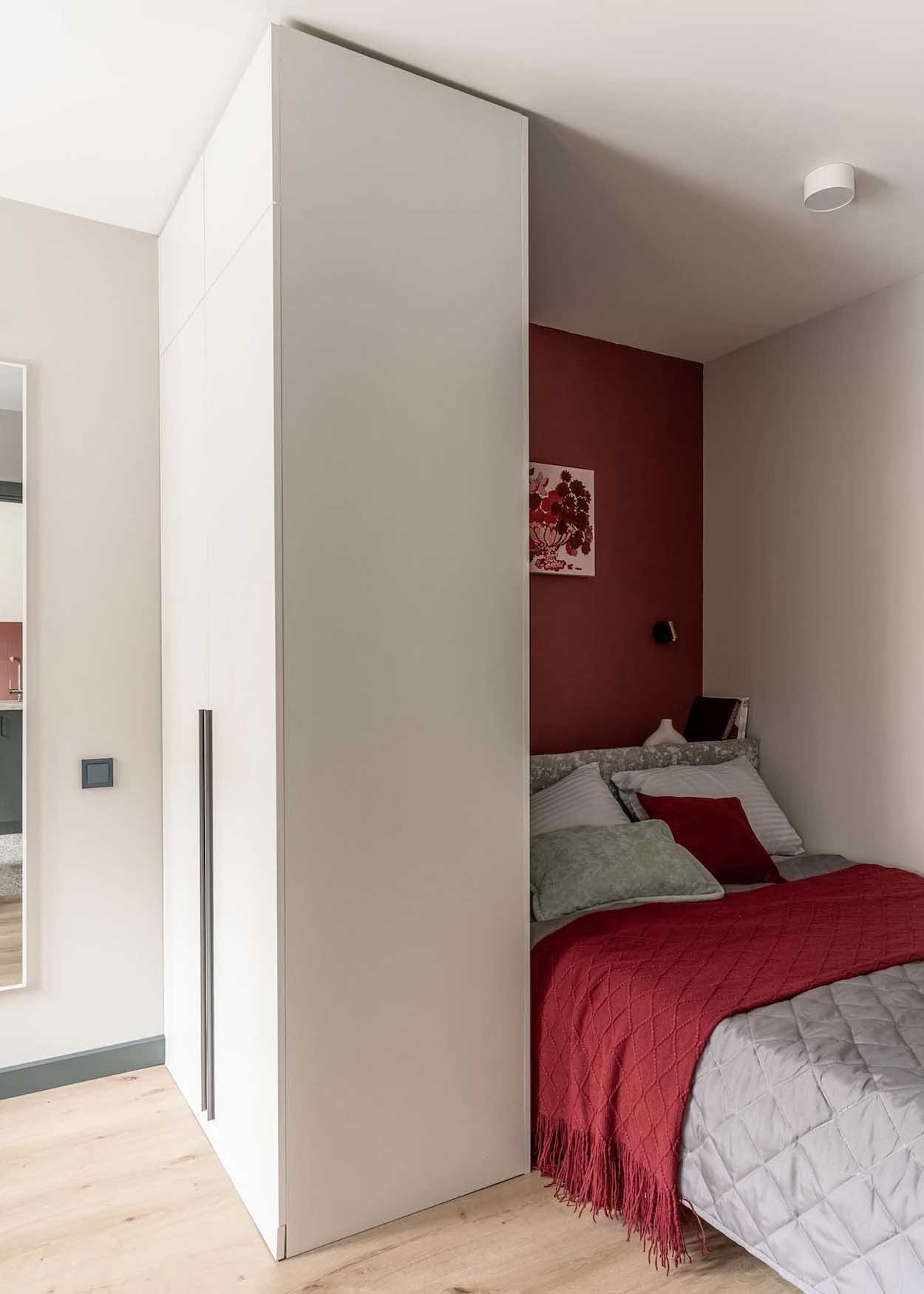 A lakás fő helyiségében a hidegburkolatot világos fa hatású laminált padló váltja fel. A tér okos zónázásának köszönhetően a hálórészt egy nagyméretű gardróbszekrény választja el a többi funkciótól, így a bútor egyben térelválasztóként is szolgál. A franciaágy mögötti fal szintén vörösáfonya árnyalatban pompázik, az éjjeliszekrényeket pedig az ágy fejtámlájába integrált praktikus polc helyettesíti.