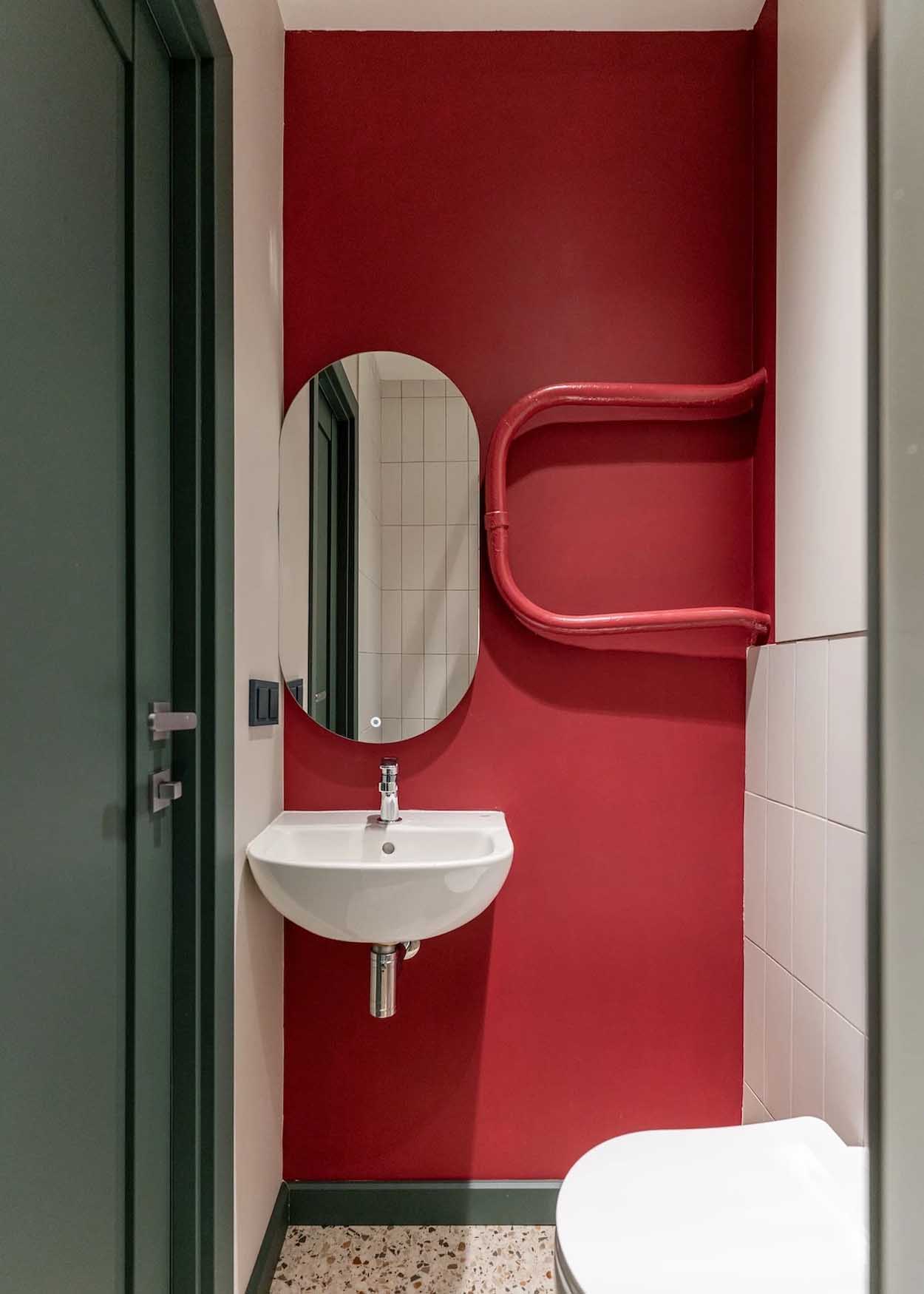 A fürdőszobában az előszobából és konyhából ismerős terrazzo padló, valamint a fali, kisméretű, fehér téglalap alakú csempék adnak letisztult alapot. A mosdókagyló mögötti fal és az itt is megtartott régi csőradiátor szintén vörösáfonya színt kapott – utóbbi cseréje túl nagy költség lett volna a csövek hegesztése miatt, így a festés remek, költséghatékony megoldásnak bizonyult. A megtartott régi fűtőtest miatt azonban csak egy nagyon apró mosdókagylót és egy keskeny tükröt lehetett beépíteni, a mosdó alatti szekrényről pedig teljesen le kellett mondani. Tárolásra így a beépített WC tartály feletti faliszekrény szolgál, amely egyben a felújítás során áthelyezett vízórákat is diszkréten elrejti.