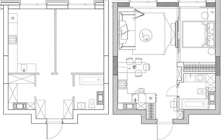 Az eredetileg egyszobás lakást úgy alakították át, hogy a gardrób megszüntetésével és az előszoba méretének csökkentésével egy tágas konyha–nappali jöjjön létre. Ehhez egy könnyed, eltolható üvegfalas megoldással leválasztott, kisebb hálószoba kapcsolódik. A fürdőszobát is valamelyest megnövelték, a közlekedő területéből lecsípve.