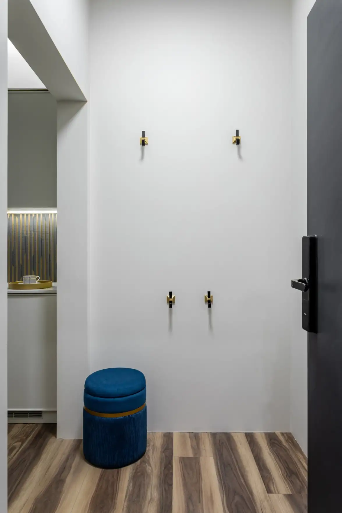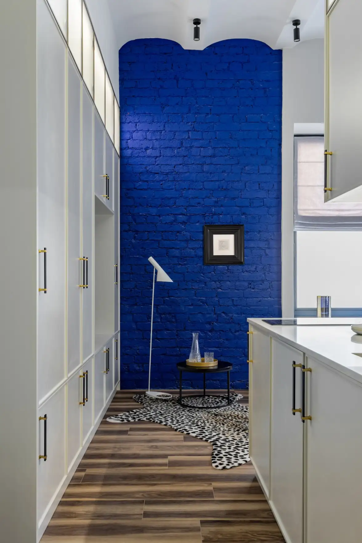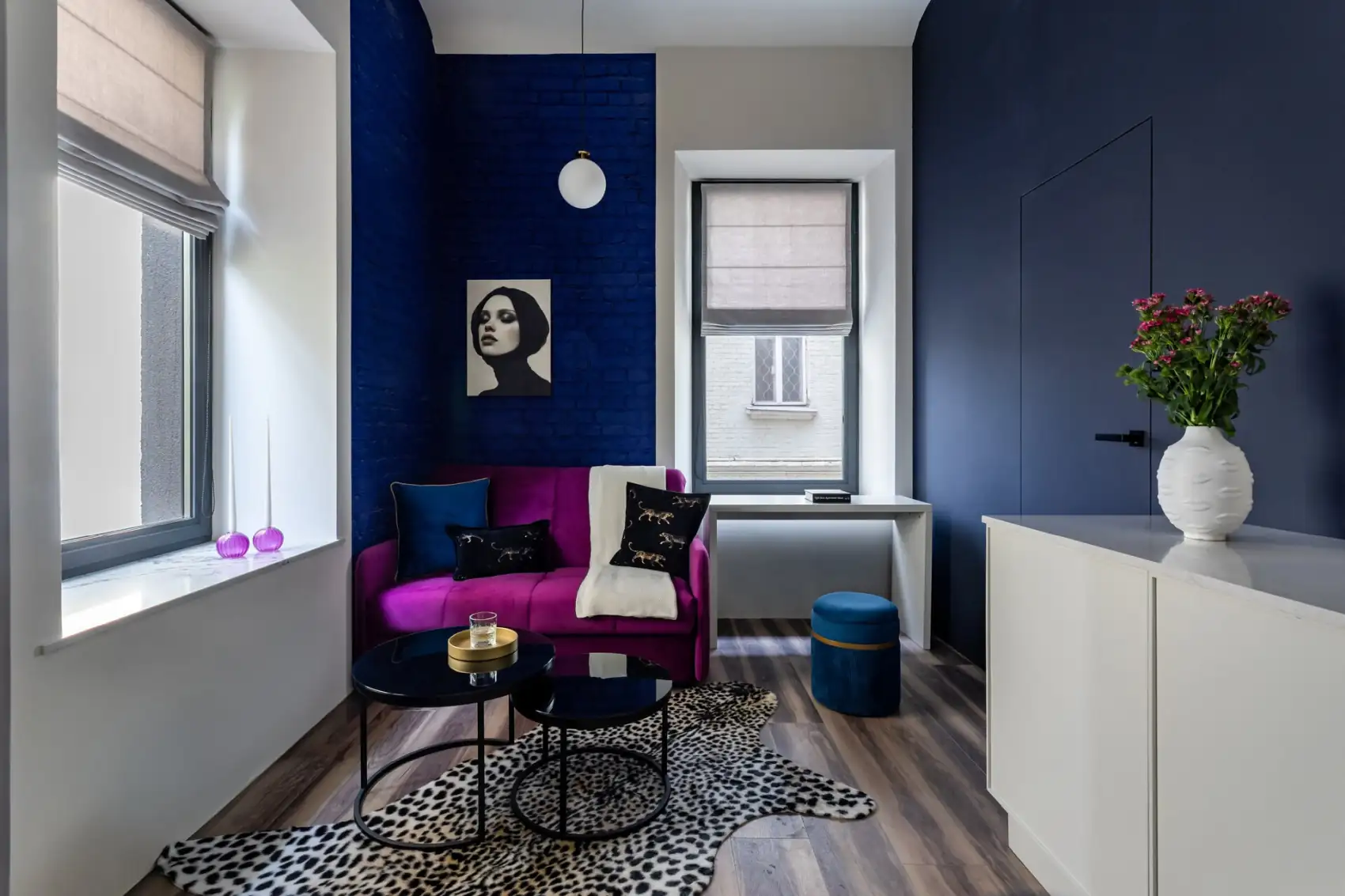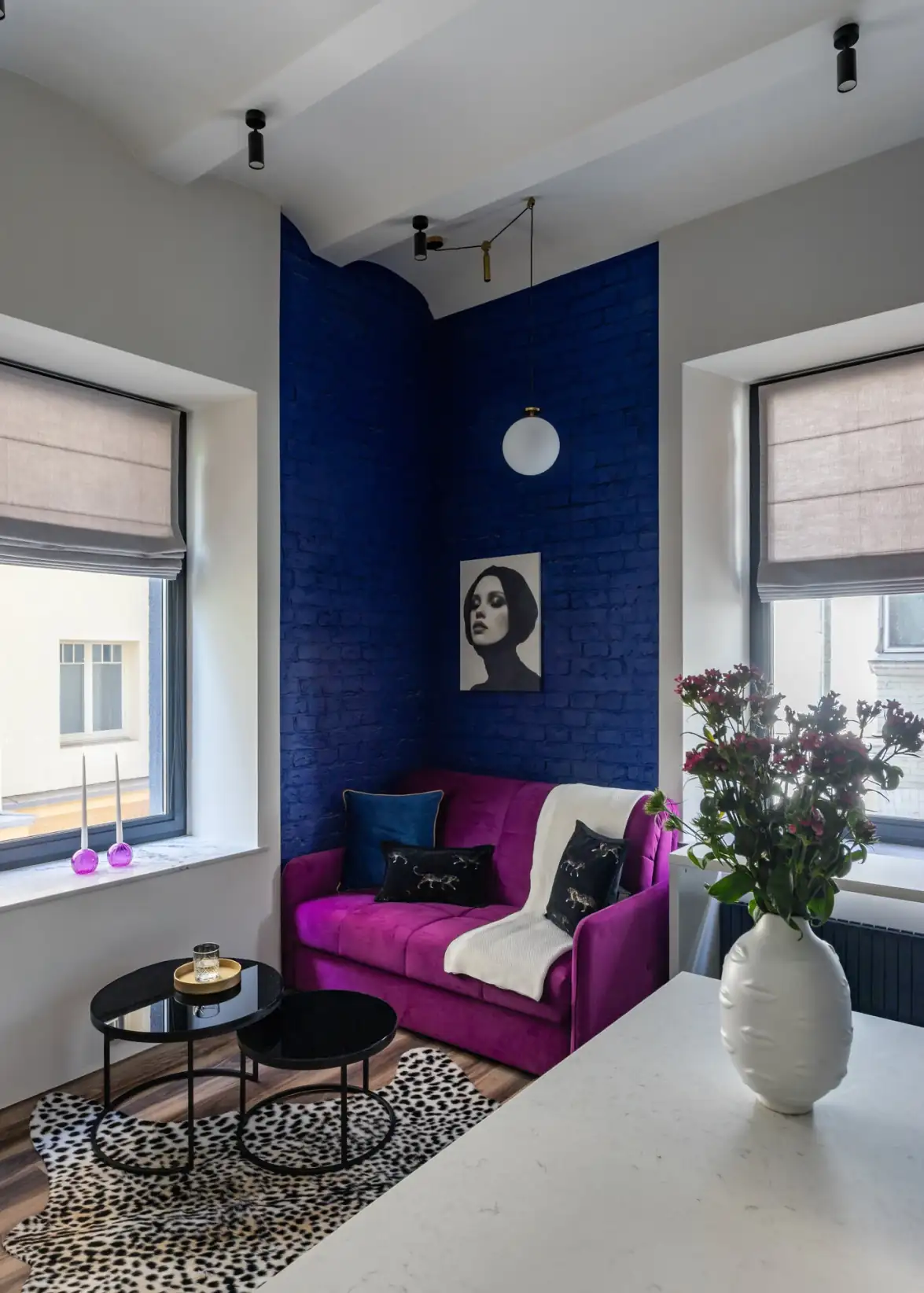 Az élénkkék fókuszfal és a hozzá kiegészítő színként választott fukszia kanapé olyan vibráló kontrasztot teremt, amely a szoba geometriájáról a színek dinamikájára irányítja a tekintetet. A világítás és a dekoráció szintén részt vesz ebben a figyelemfelkeltő játékban, tovább fokozva az optikai hatást.