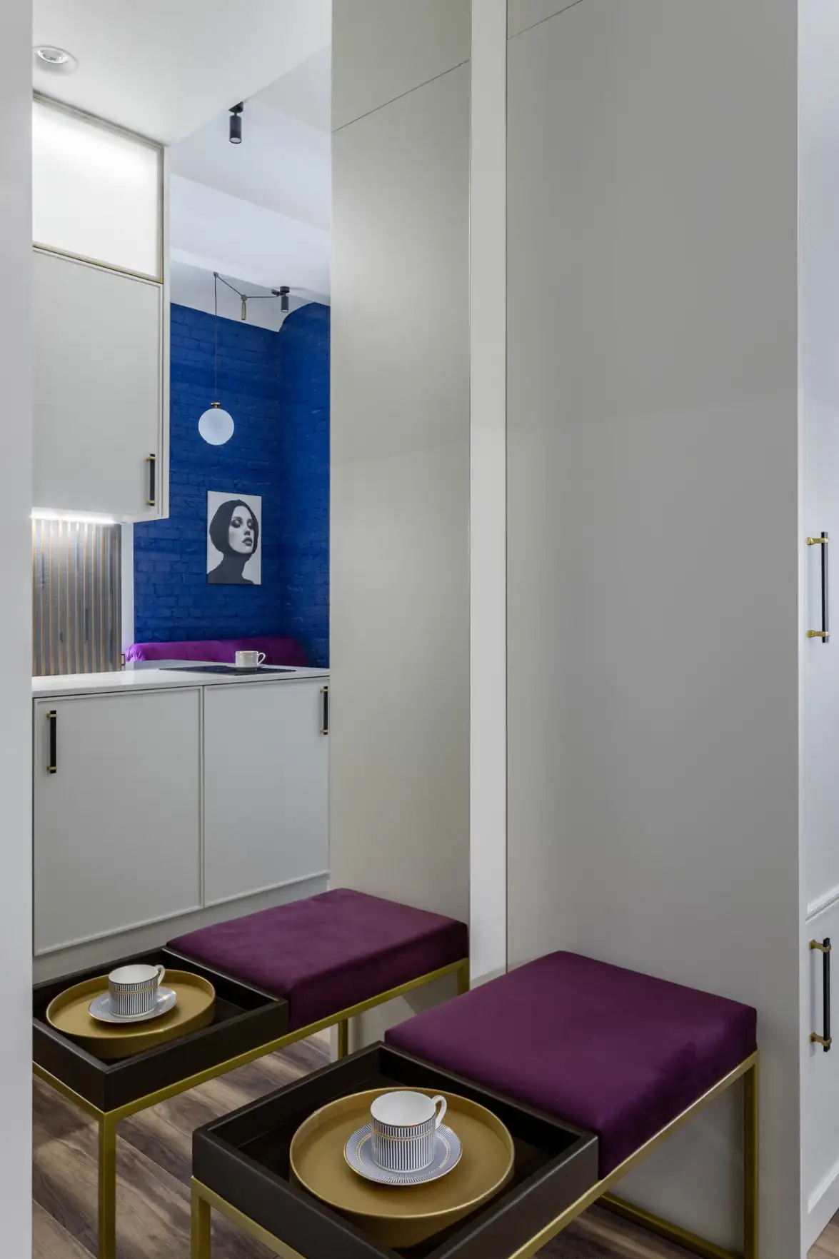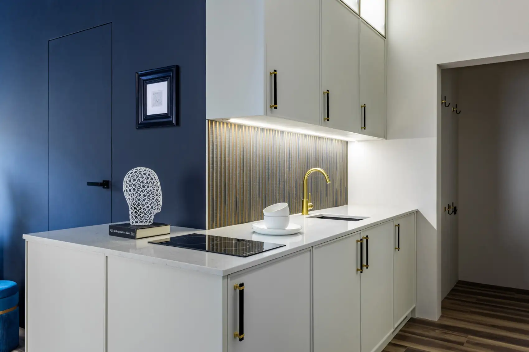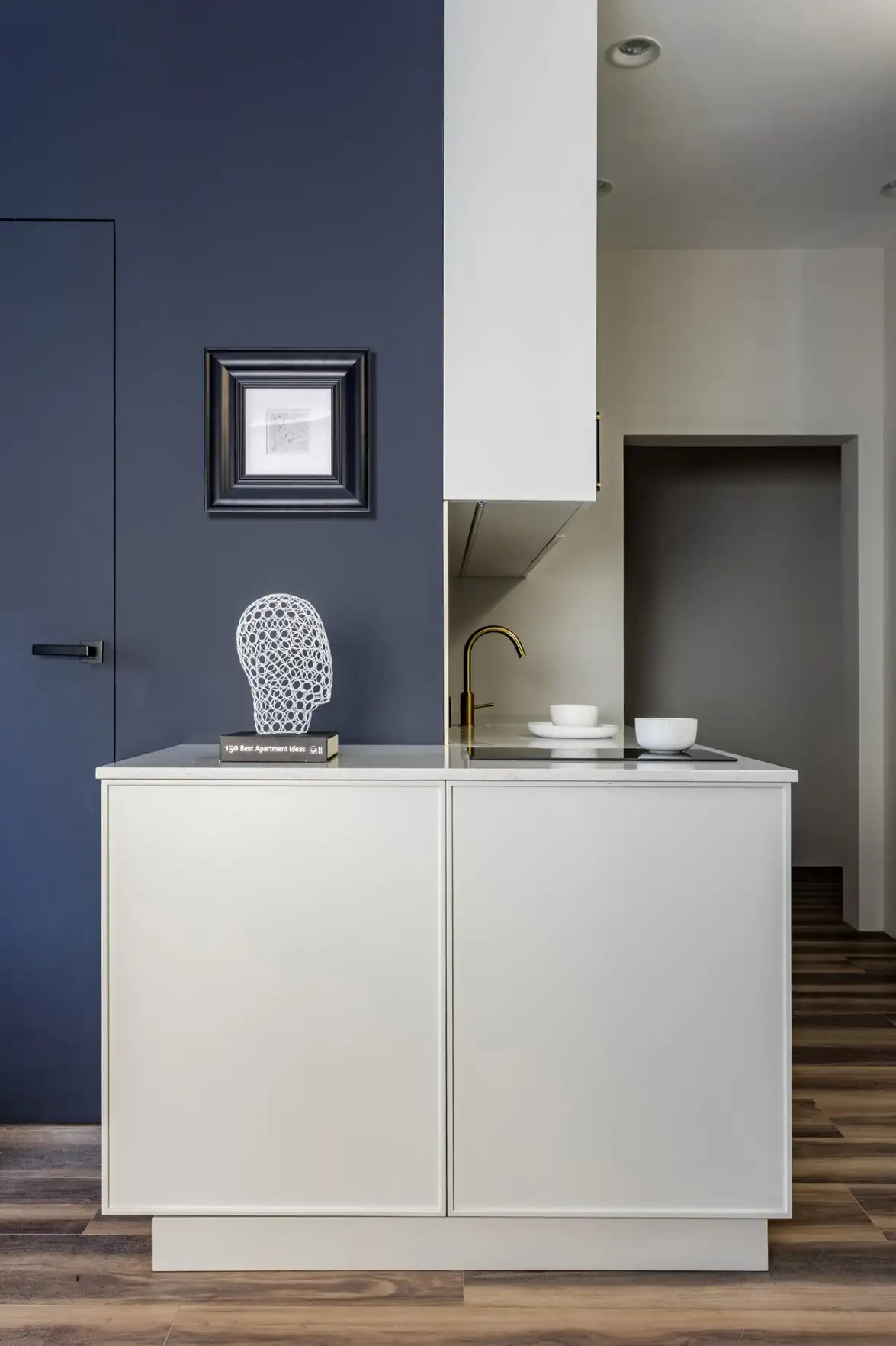 A falakat fokozottan ellenálló, mosható szupermatt zománcfesték borítja – ez egy kifejezetten praktikus megoldás a kis helyiségekben, amin a tervezés során nem volt érdemes spórolni. A fürdőszobában kerámiaburkolatot használtak a falakon és a padlón egyaránt. A konyha tágas tárolórendszerrel van felszerelve. A klasszikus sütő helyett itt egy főzőlap és egy mikrohullámú sütő kombinációja kapott helyet. Helytakarékossági okokból a mosógépet és a kompakt hűtőszekrényt a pult alá építették be.