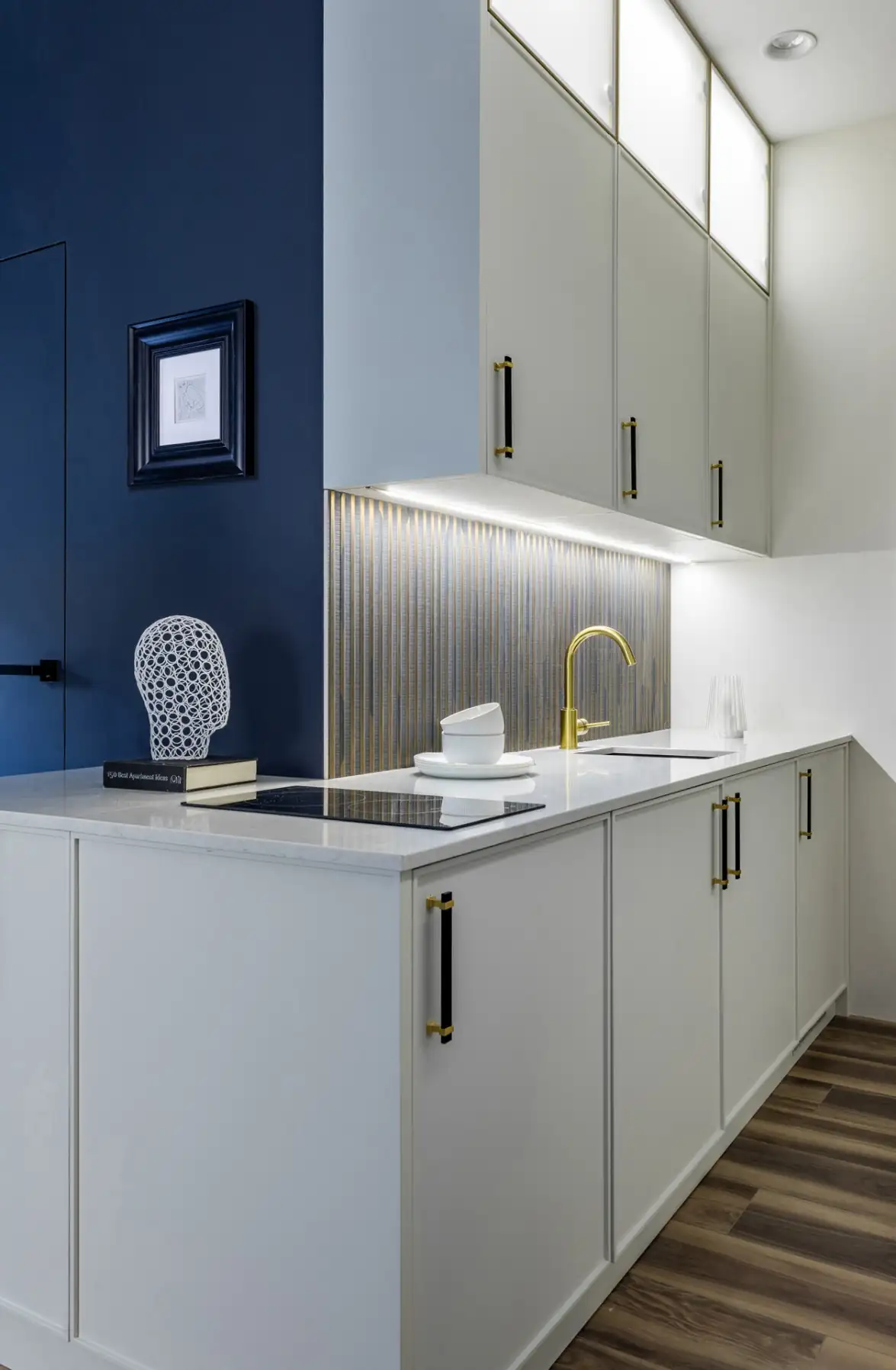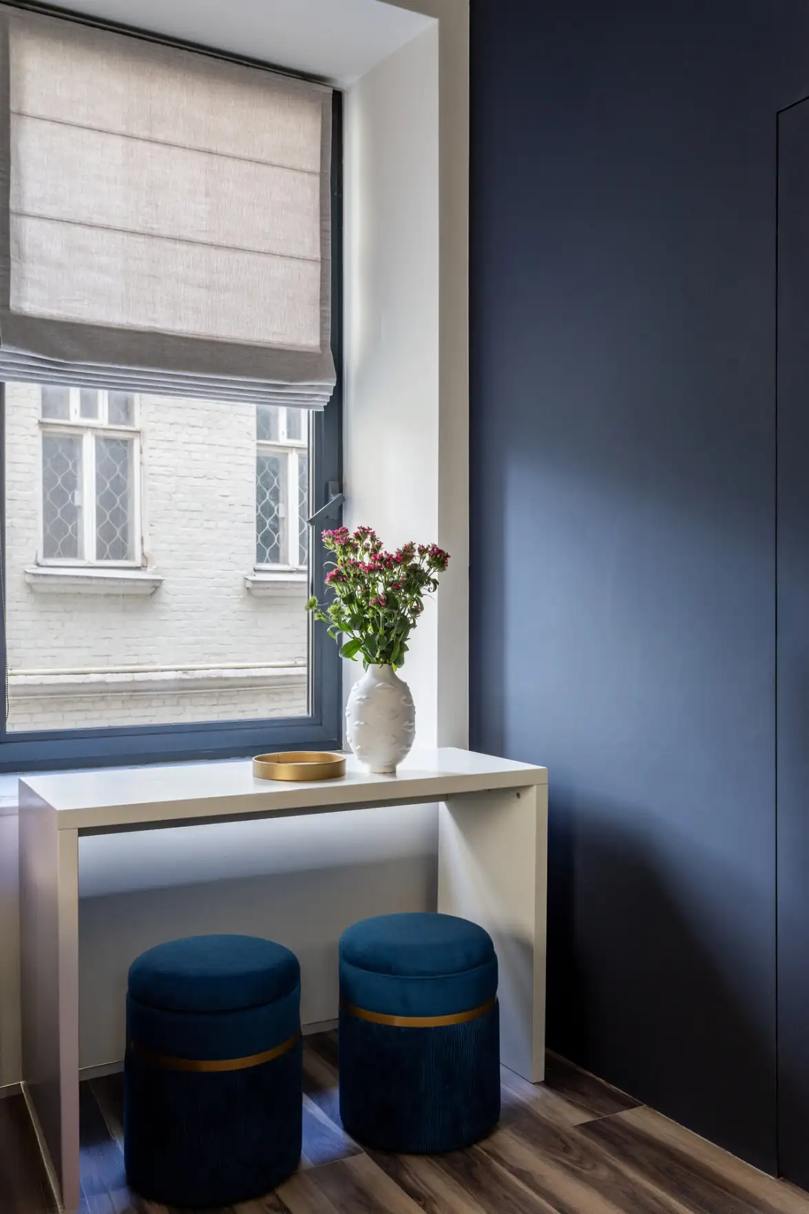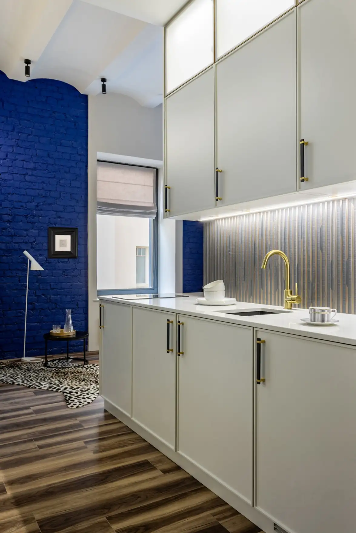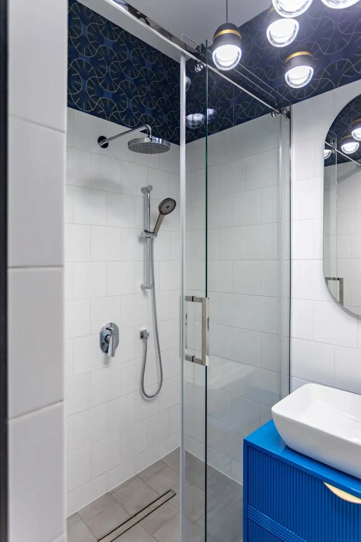 A falakat fokozottan ellenálló, mosható szupermatt zománcfesték borítja – ez egy kifejezetten praktikus megoldás a kis helyiségekben, amin a tervezés során nem volt érdemes spórolni. A fürdőszobában kerámiaburkolatot használtak a falakon és a padlón egyaránt. A konyha tágas tárolórendszerrel van felszerelve. A klasszikus sütő helyett itt egy főzőlap és egy mikrohullámú sütő kombinációja kapott helyet. Helytakarékossági okokból a mosógépet és a kompakt hűtőszekrényt a pult alá építették be.