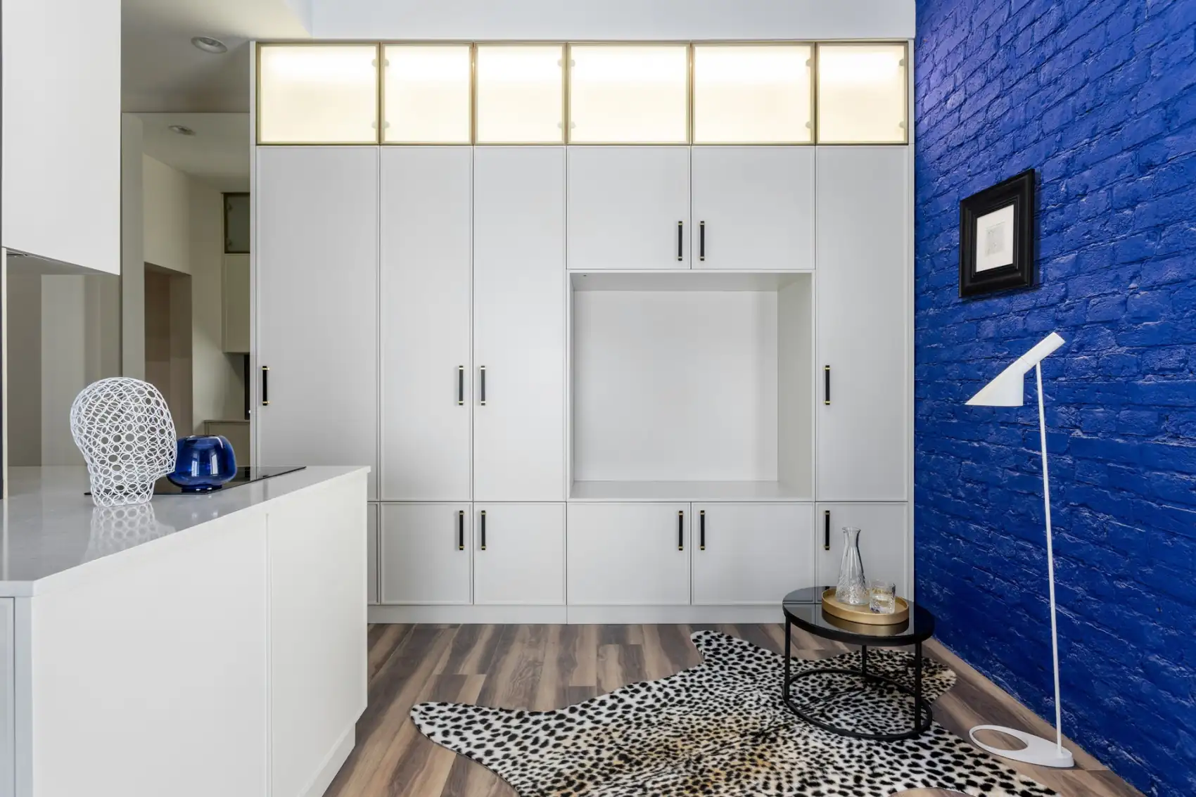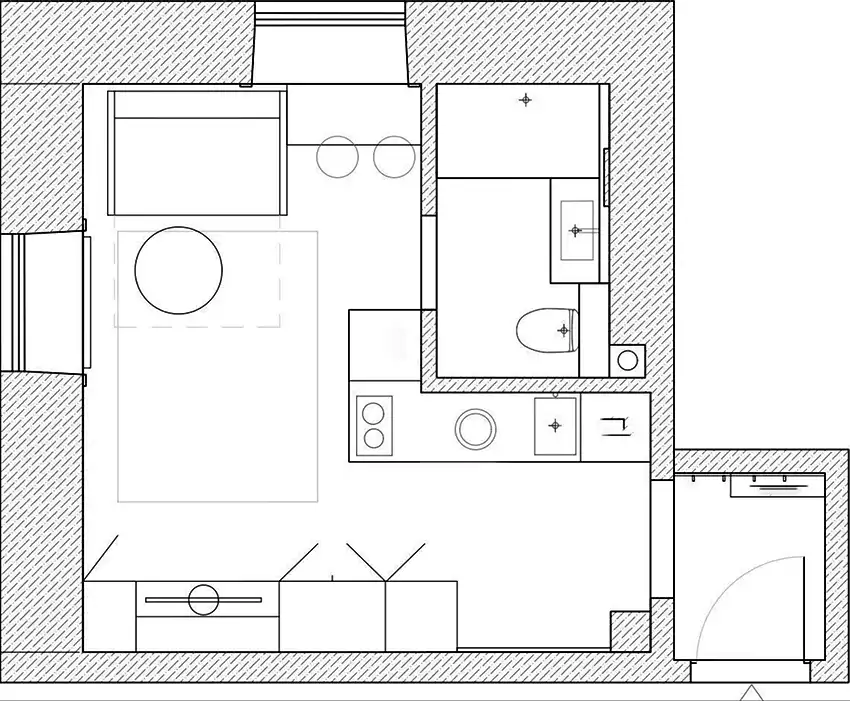 A garzonlakásnak a fő helyisége L-alakú alaprajzzal és két egymásra merőleges falon elhelyezkedő, nagy ablakokkal rendelkezik. Az ablakok elhelyezkedése alapjaiban határozta meg a konyhabútor pozícióját is. A külső sarok mentén kellett elhelyezni, ami normál esetben tovább erősíthette volna a tér szabálytalan formájának érzetét. A tervező azonban vizuális és színbeli trükköket alkalmazott a figyelem elterelésére.