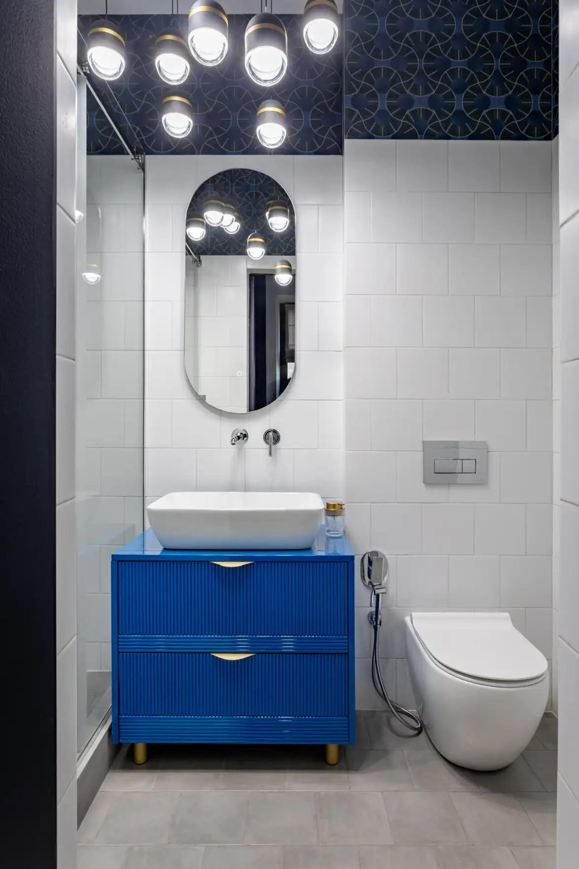 Kifejezetten rendhagyó részlet a fürdőszobai csillár. A tervezők szándékosan szakítottak a hagyományos sztereotípiákkal, hogy még egyedibbé és személyesebbé tegyék a enteriőrt.