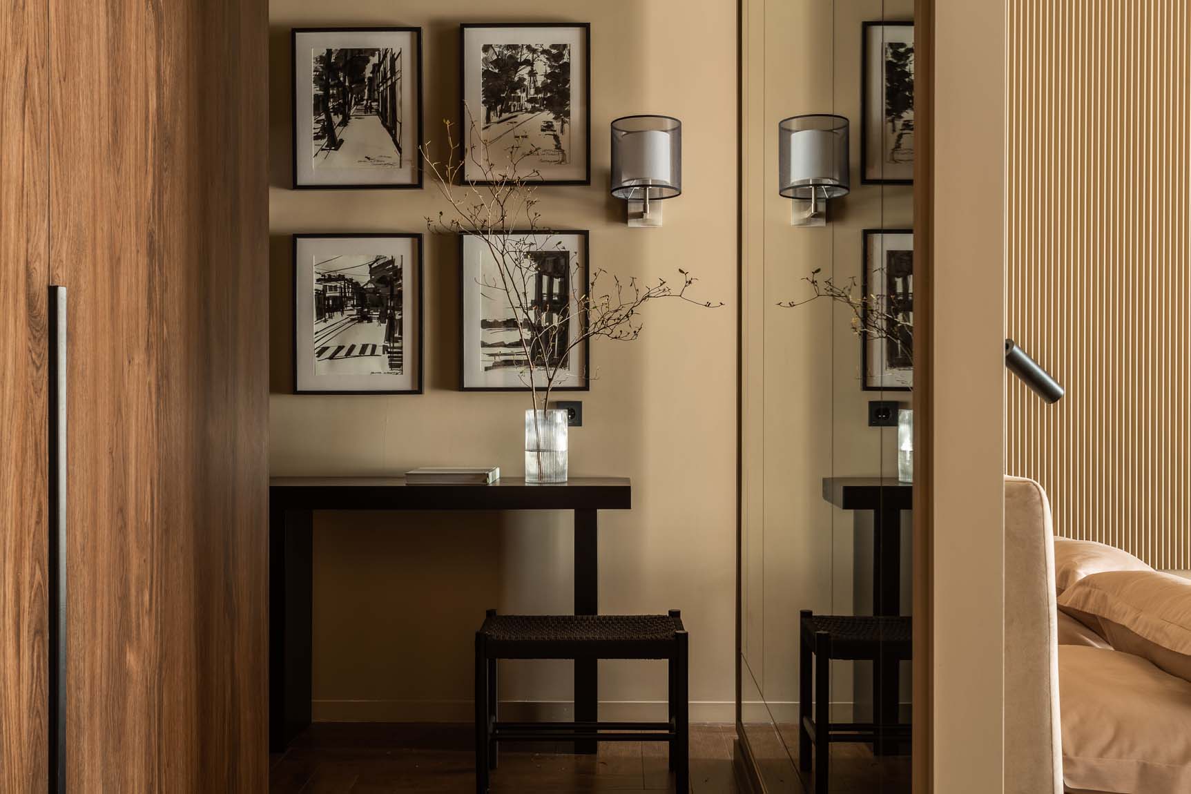 Annak érdekében, hogy a kis előszoba nagyobbnak tűnjön, a tervező a bejárati zónát a fő helyiségtől elválasztó válaszfalat tükörrel burkolta. Ennek a megoldásnak köszönhetően az előszoba határai szó szerint feloldódnak a térben, így a lakásba lépve egy tágasabb helyiség benyomását keltik.