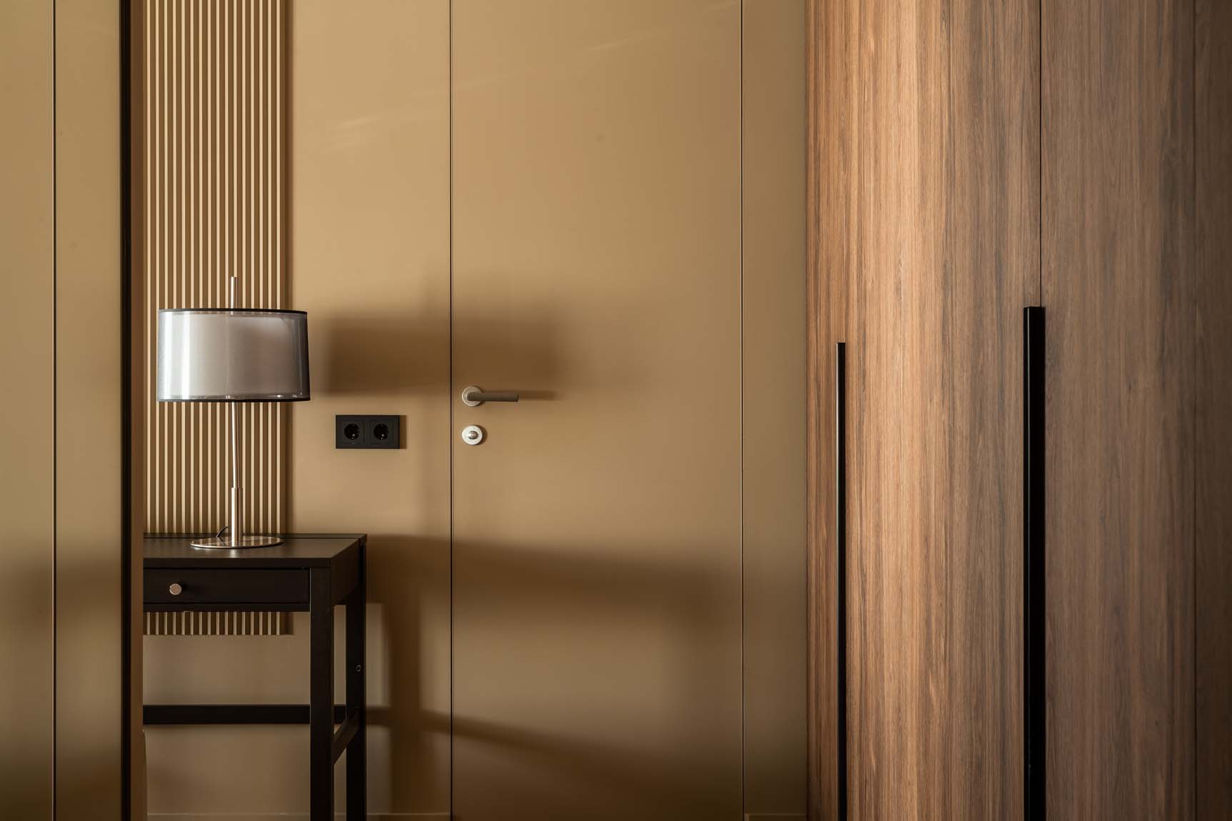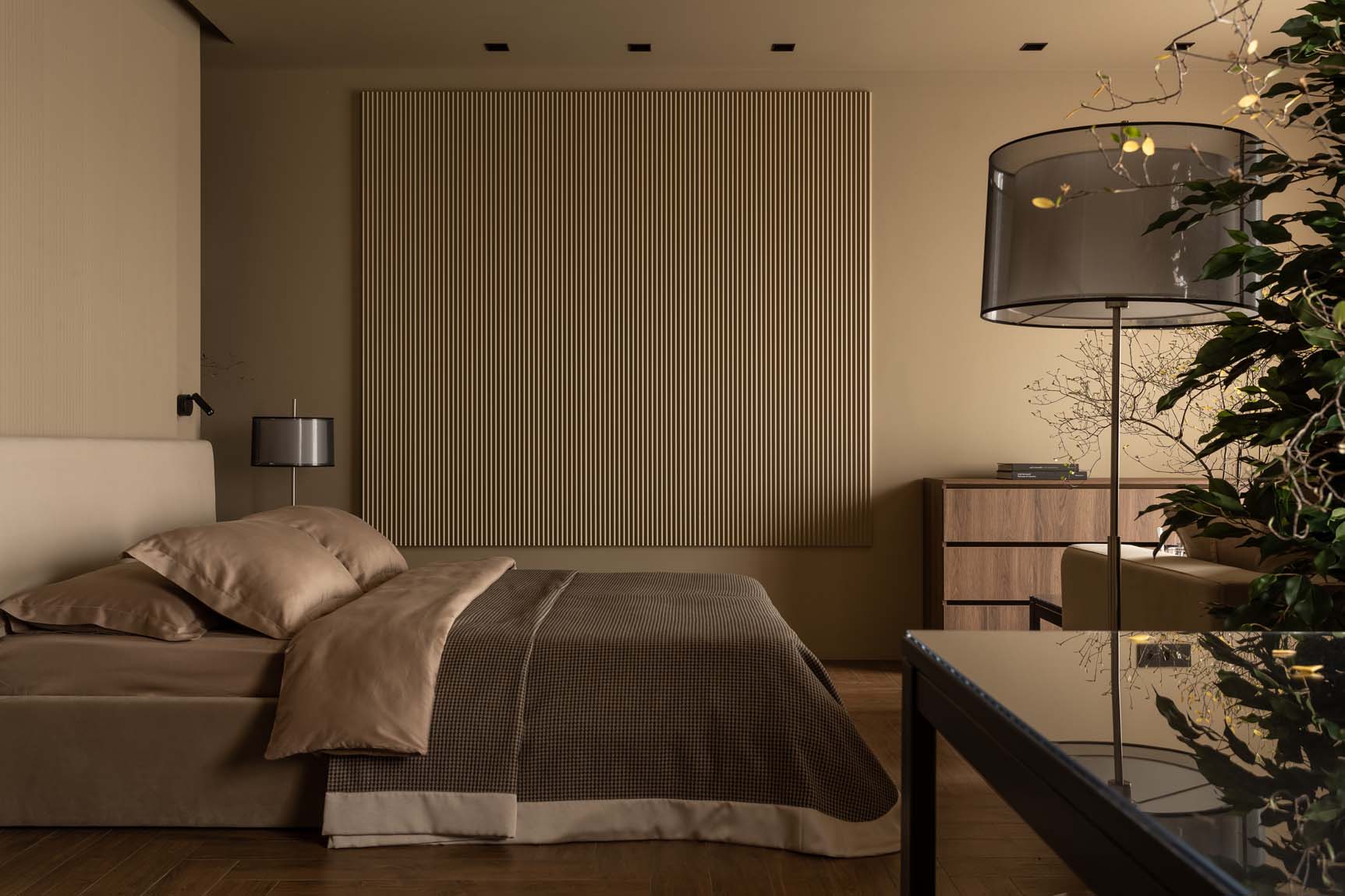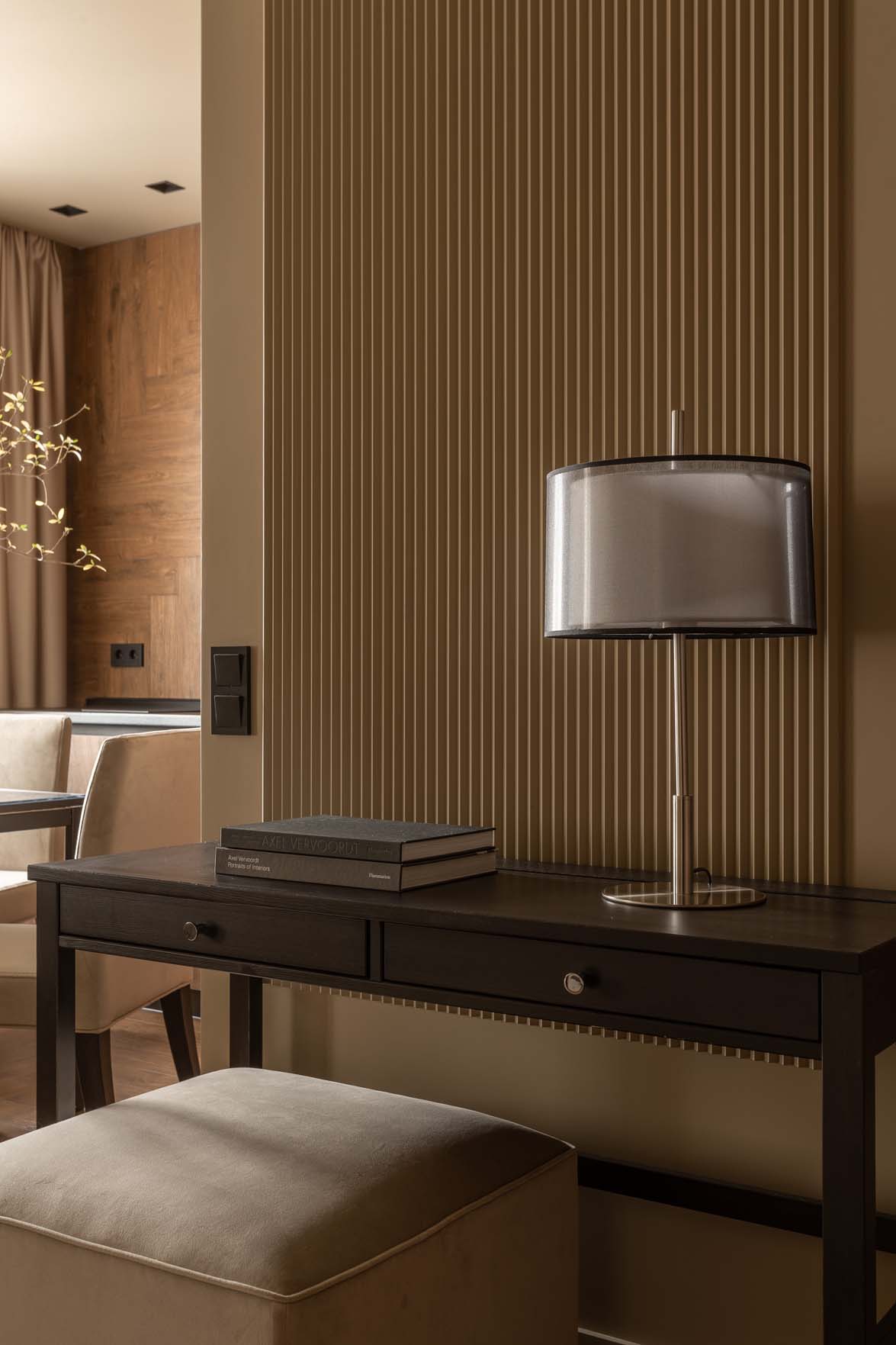 A lakberendező igyekezett a teret minél tágasabbnak mutatni, ezért az egész lakásban egységes színpalettát alkalmazott – ez egy hatásos tervezői fogás, amikor a mennyezetet és a falakat ugyanazzal a festékkel festik, még akkor is, ha, mint ebben az esetben, az árnyalat nem a legvilágosabb. A stílus, a dekoráció és a színvilág maximálisan a pihenést és a feltöltődést szolgálja. A színpaletta: karamell, szarvasgombás jegyekkel.