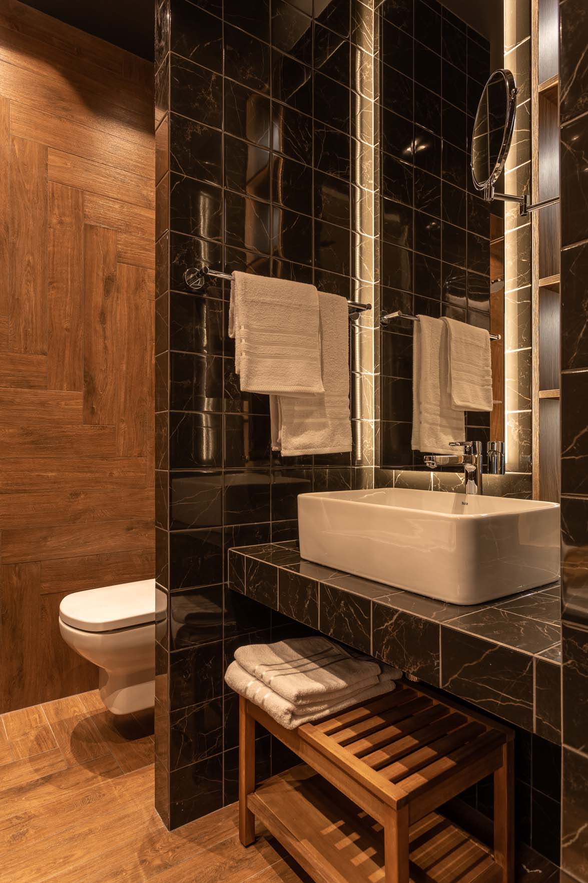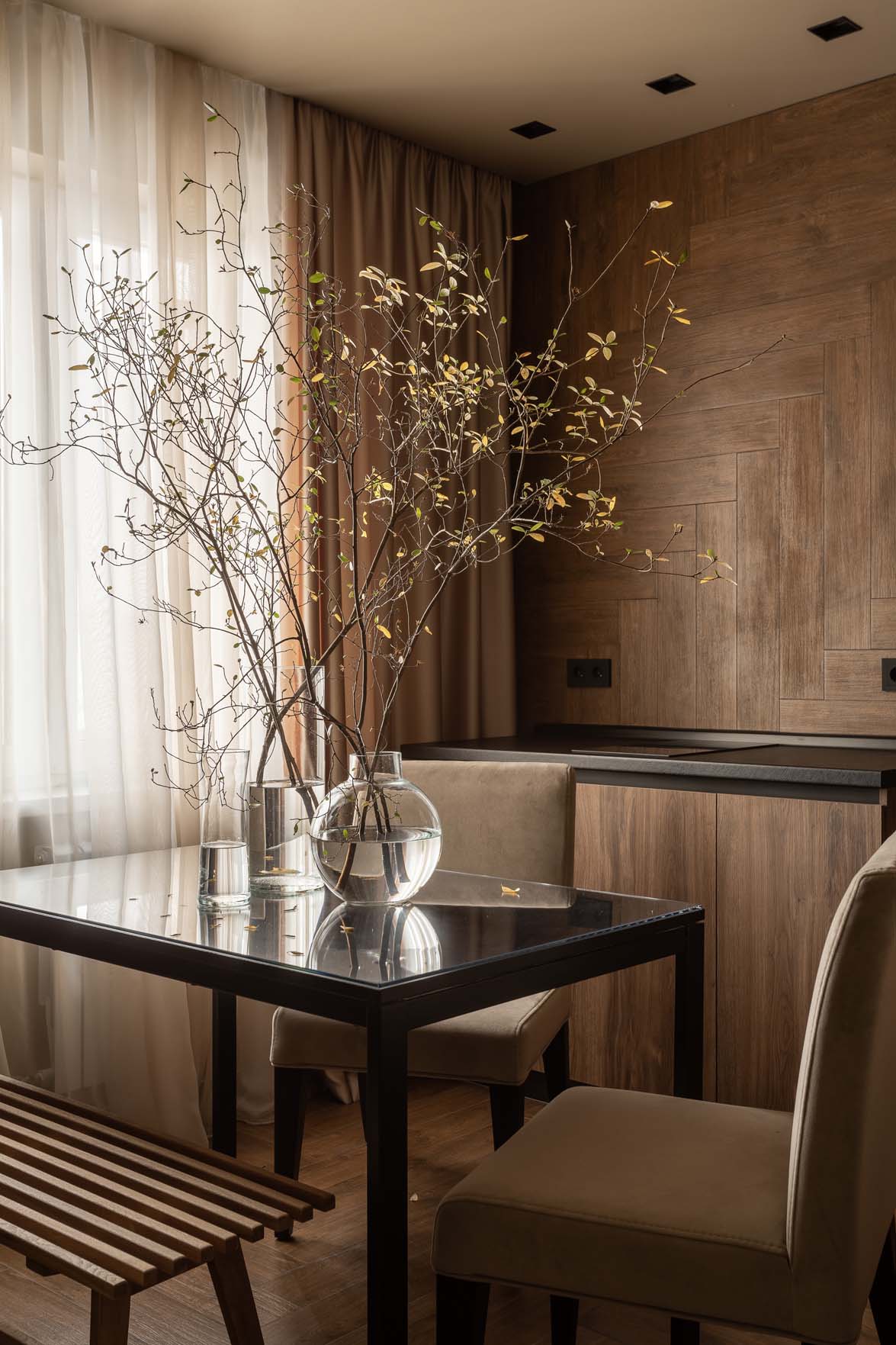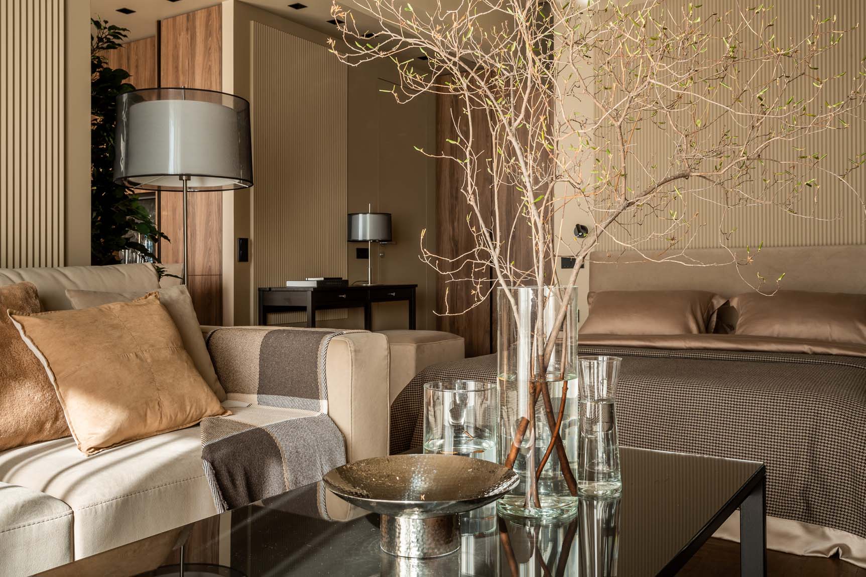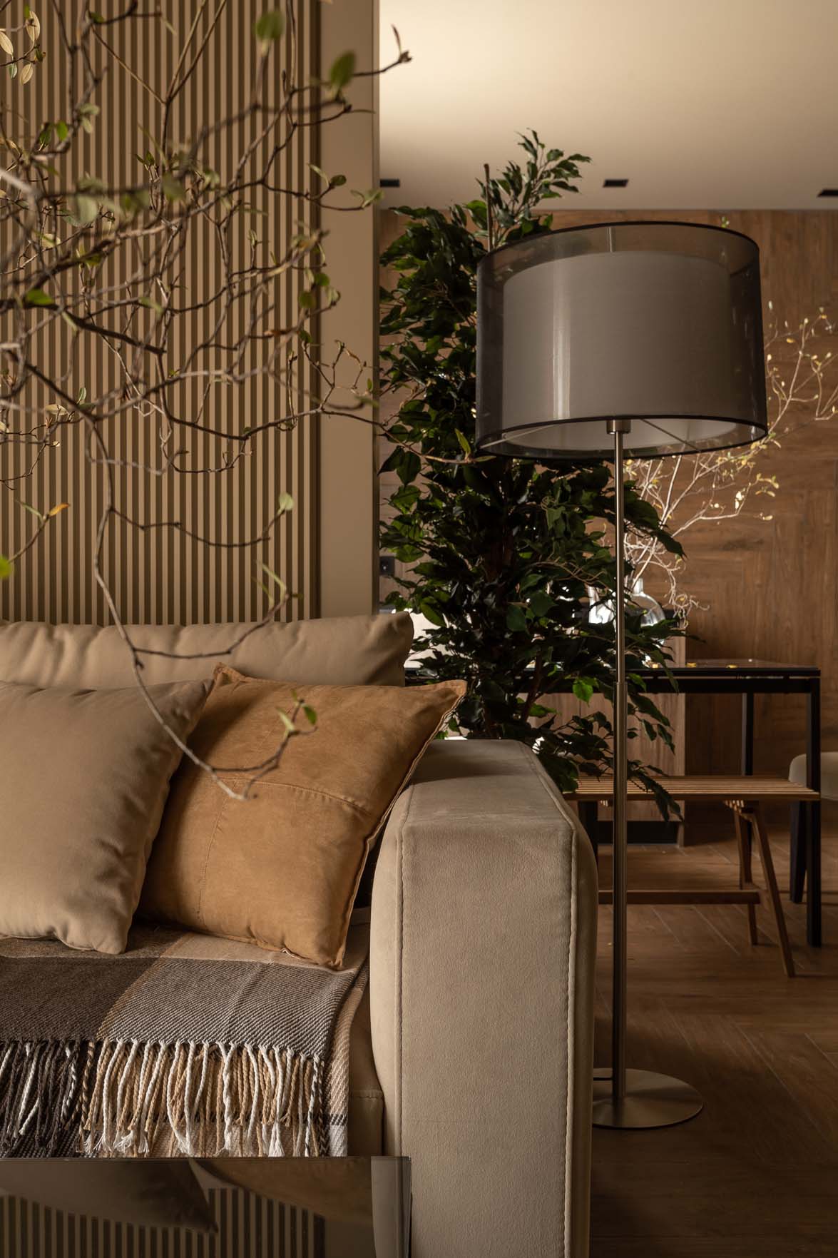 A lakberendező igyekezett a teret minél tágasabbnak mutatni, ezért az egész lakásban egységes színpalettát alkalmazott – ez egy hatásos tervezői fogás, amikor a mennyezetet és a falakat ugyanazzal a festékkel festik, még akkor is, ha, mint ebben az esetben, az árnyalat nem a legvilágosabb. A stílus, a dekoráció és a színvilág maximálisan a pihenést és a feltöltődést szolgálja. A színpaletta: karamell, szarvasgombás jegyekkel.