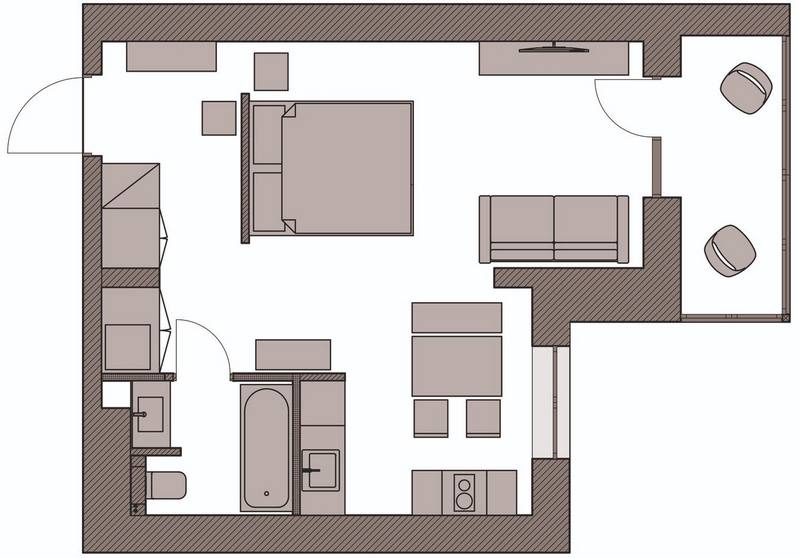 A kis alapterületen a lehető legnyitottabb térre törekedtek, ezért falakkal alig, inkább csak a bútorok elrendezésével tagolták a teret. Végül sikerült elhelyezni egy konyhát, nappali zónát kis kanapéval, kényelmes ágyat, valamint előszobát, amelyet egy gardróbszekrényekkel felszerelt folyosó követ (ahol nemcsak a ruhák, de a mosógép is el van rejtve).