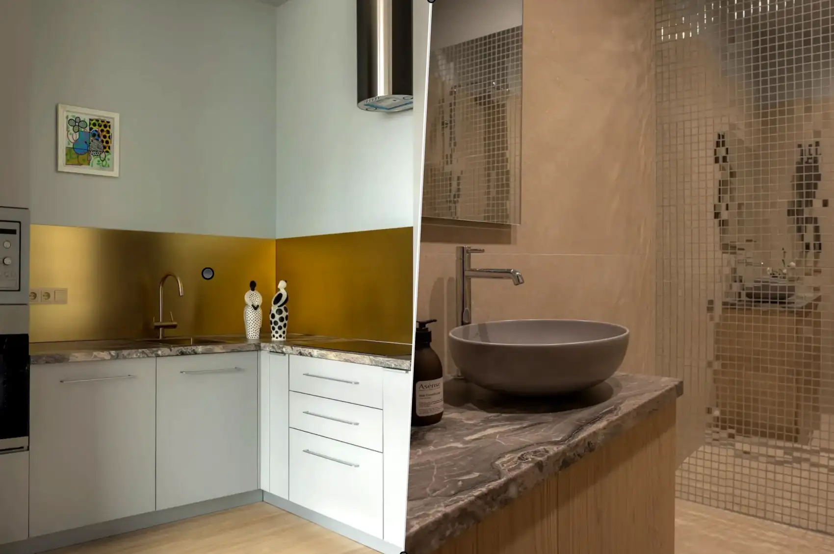 Sárgaréz konyha hátfal és tükörmozaik hölgy 40 m2-es lakásában