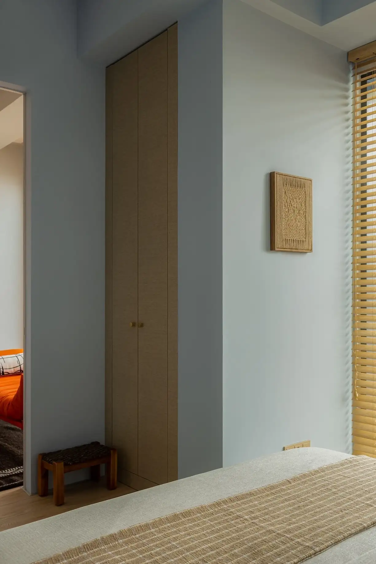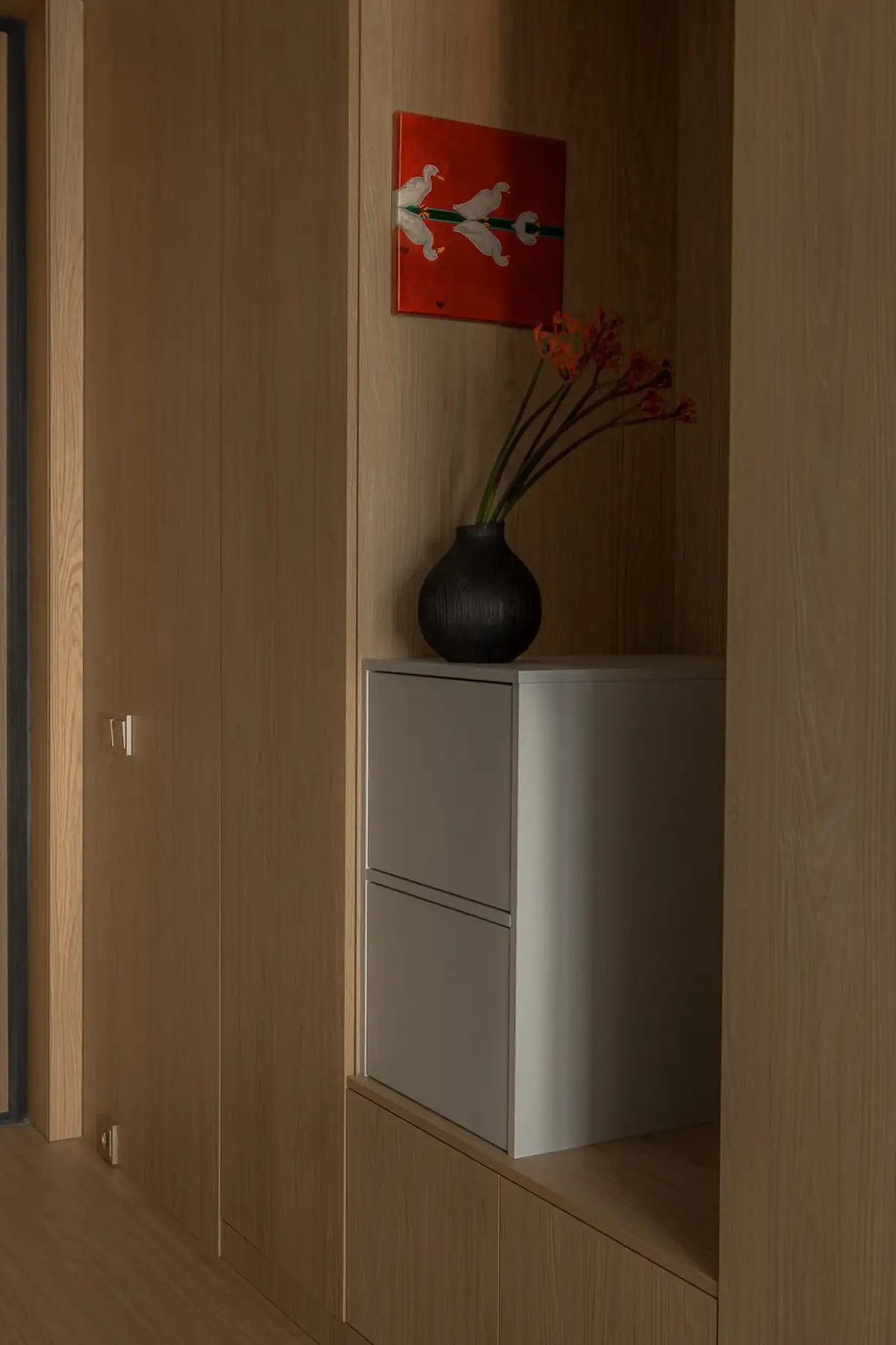 A lakás kis előszobájában a falakat praktikus, ugyanakkor rendkívül esztétikus, fa hatású panelek borítják. Ezek a panelek tökéletesen harmonizálnak a fürdőszoba kivételével az egész lakásban végigfutó, világos fa hatású laminált padlóval. A tárolást egy tágas, plafonig érő beépített szekrény oldja meg, amelyet úgy integráltak a térbe, hogy szinte észrevehetetlen legyen: frontjai teljesen megegyeznek a falpanelek felületével. A szekrény belseje a ruhákat és a szezonális holmikat rejti, a cipőknek pedig külön fiókokat alakítottak ki. A bútorrendszer közepén egy nyitott fülke is helyet kapott, benne egy kisebb tárolóval a cipők és a mindennapi apróságok számára.