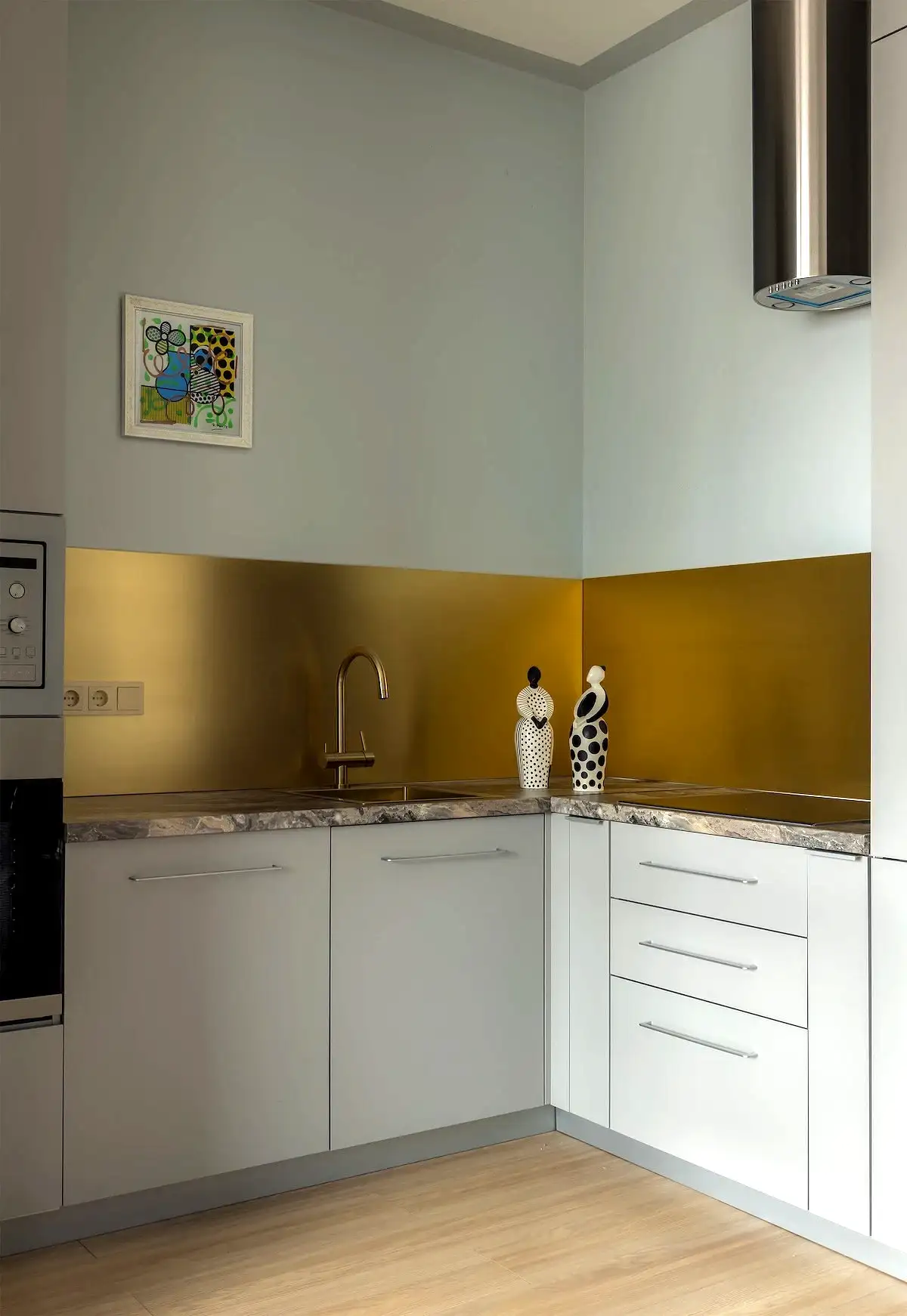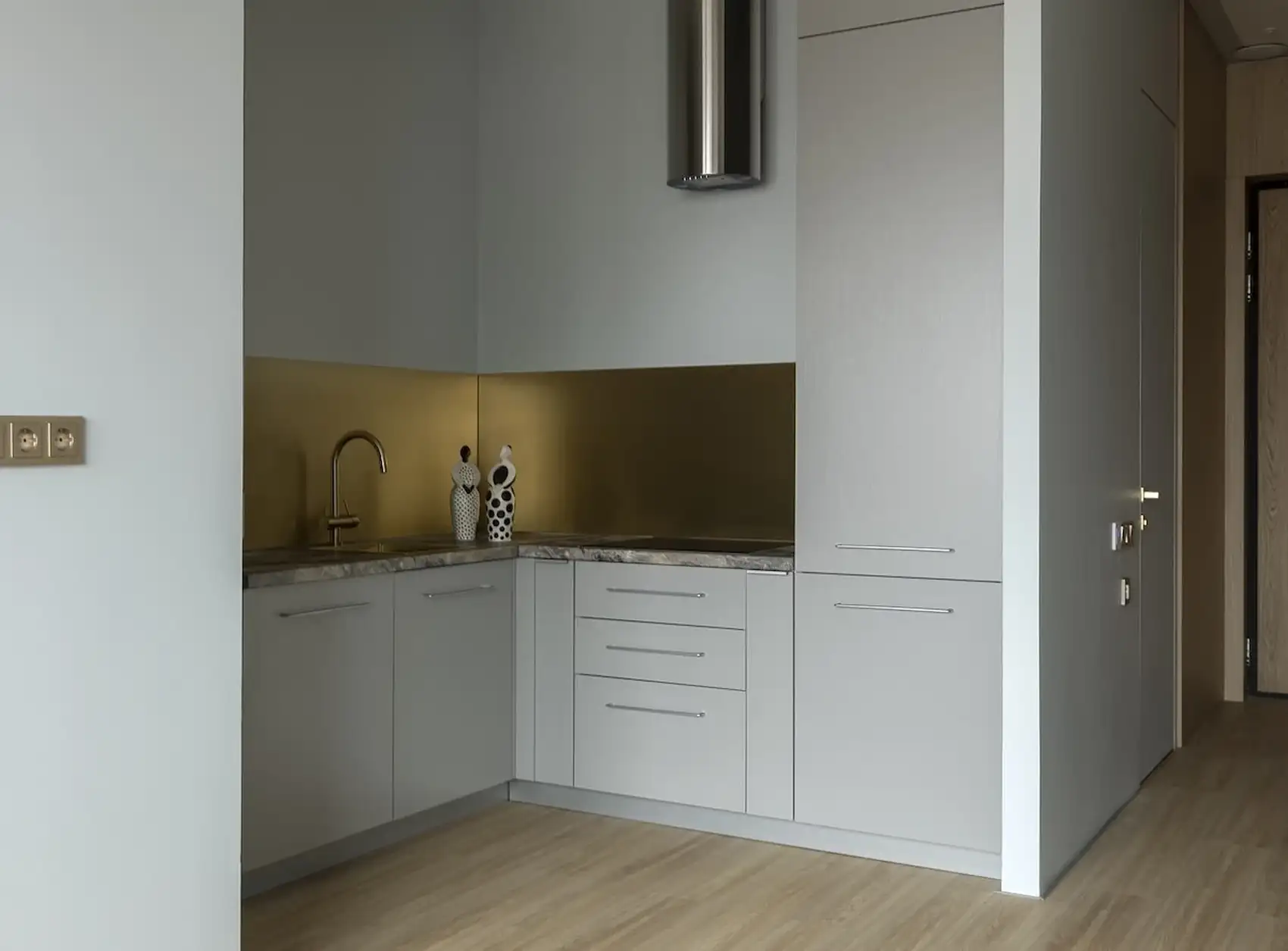 A nappalival egy légtérben lévő konyha falai elegáns szürke festést kaptak. A konyhabútort egy fülkébe süllyesztették, és a tágas térérzet érdekében teljesen lemondtak a felső szekrényekről. A tárolást és a gépesítést a két szélen elhelyezett magas oszlopelemek biztosítják: az egyikben a hűtőszekrény, a másikban pedig a sütő és a mikrohullámú sütő kapott helyet, míg a mosogatógépet a mosogató melletti alsó elembe rejtették. A konyha igazi fókuszpontja a sárgaréz lemezekből készült hátfal, amely elegáns utalás a lakópark homlokzatán is megjelenő fémes dizájnelemekre.