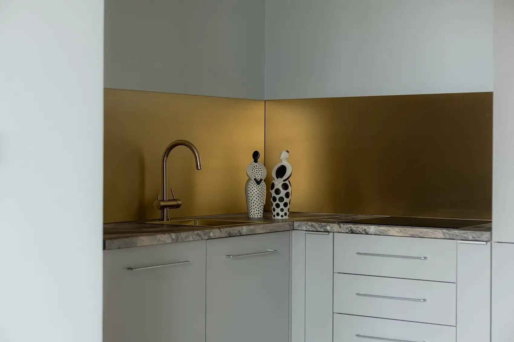 Sárgaréz konyha hátfal és tükörmozaik: fiatal nő különleges, 40 m²-es új lakása