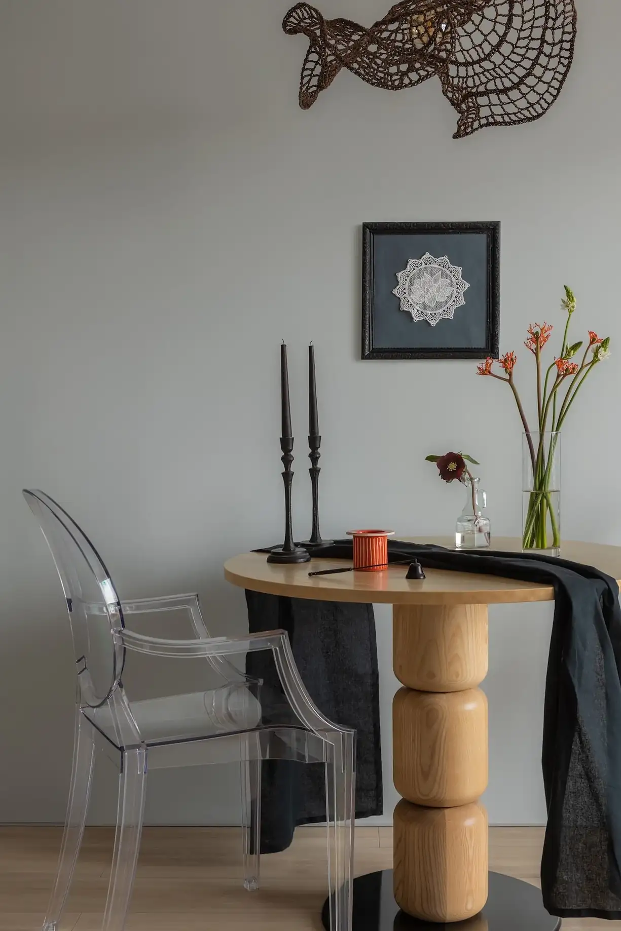 Az általános világítást sínes mennyezeti lámpák biztosítják, míg a masszív faasztalból és műtárgyként is funkcionáló műanyag dizájnszékekből álló étkezőcsoport felett egy fonott búrás lámpa ad meleg, fókuszált fényt. Az étkező sarkát egy minimalista, elforgatható karos fali lámpa teszi még hangulatosabbá.
