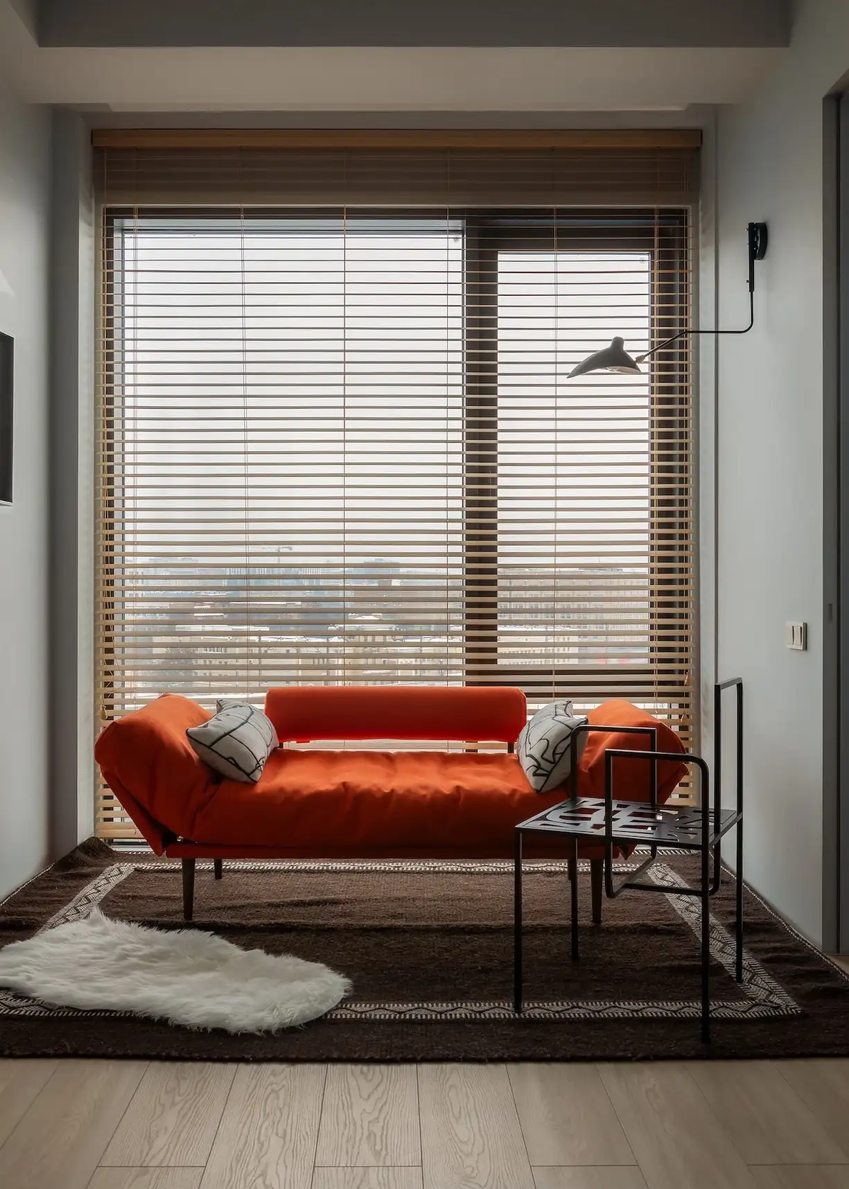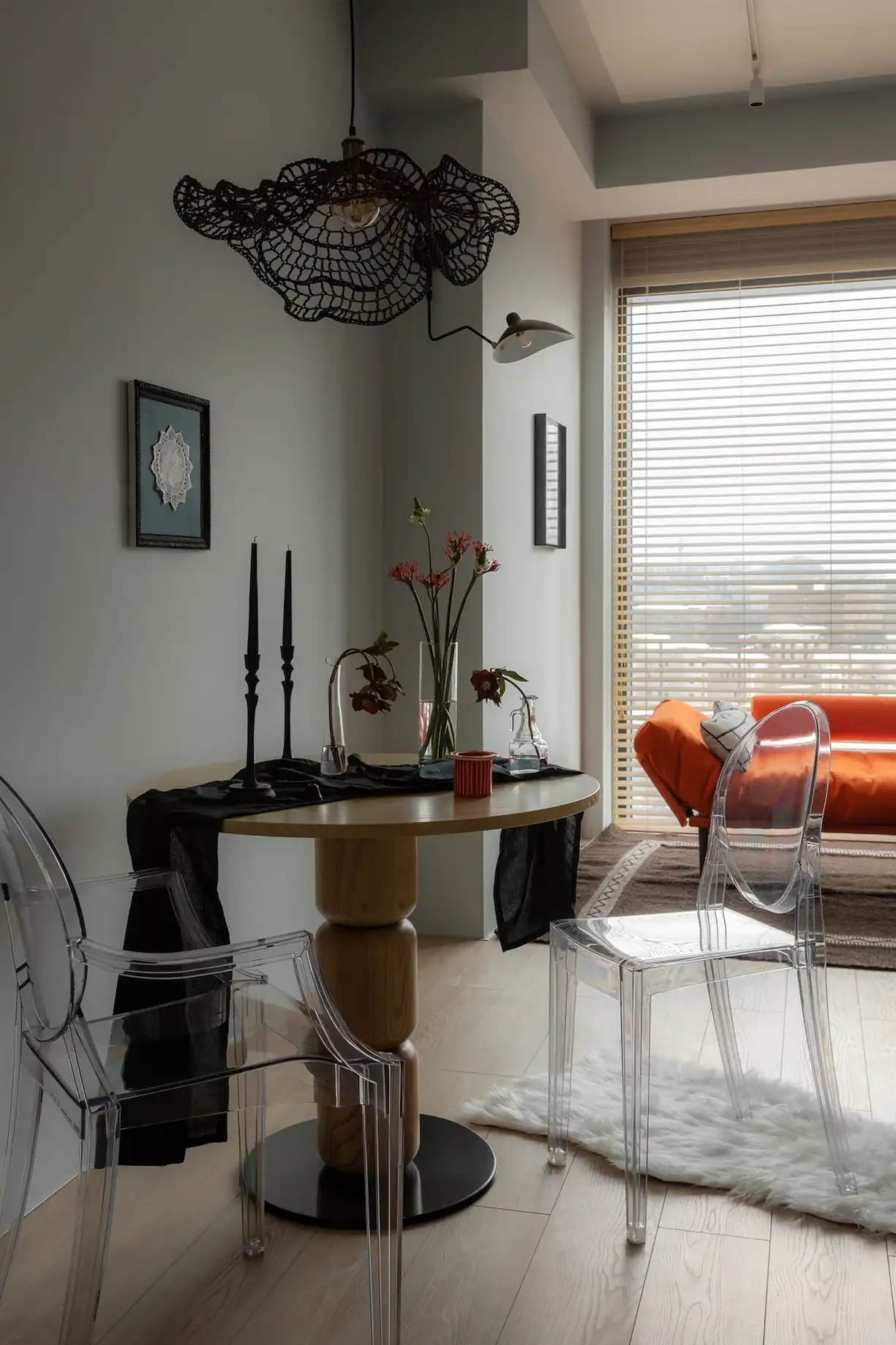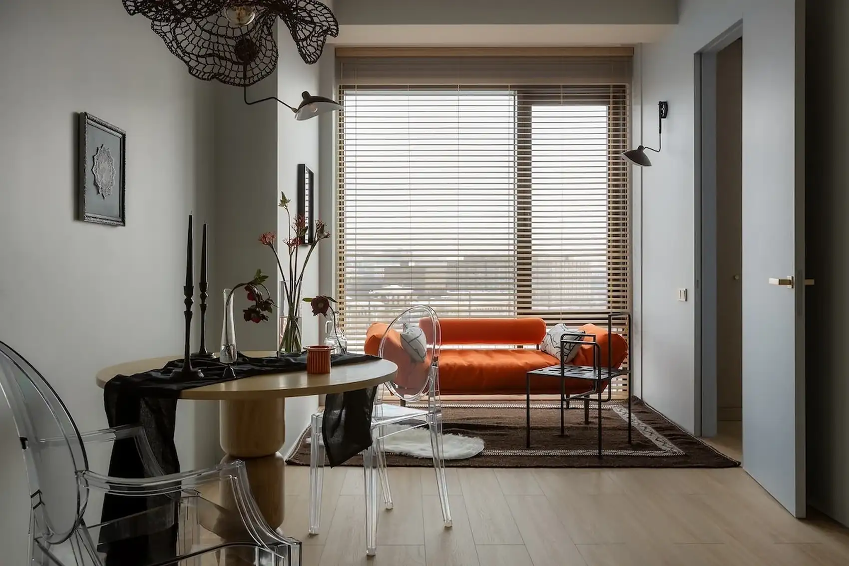 A nyitott tér nappali funkcióját betöltő részén, közvetlenül az ablak mellett egy élénk, narancssárga kárpitozású dívány áll, amely az étkezőszékekhez hasonlóan egyedi, figyelemfelkeltő vizuális elemként, szinte műalkotásként uralja a teret. Ezt a pihenősarkot egy másik, falra szerelt, forgatható olvasólámpa világítja meg. A tér karakterét a gondosan megválasztott egyedi kiegészítők – mint az izgalmas csillár, a fém szék vagy a keretezett textildekoráció – teszik teljessé.