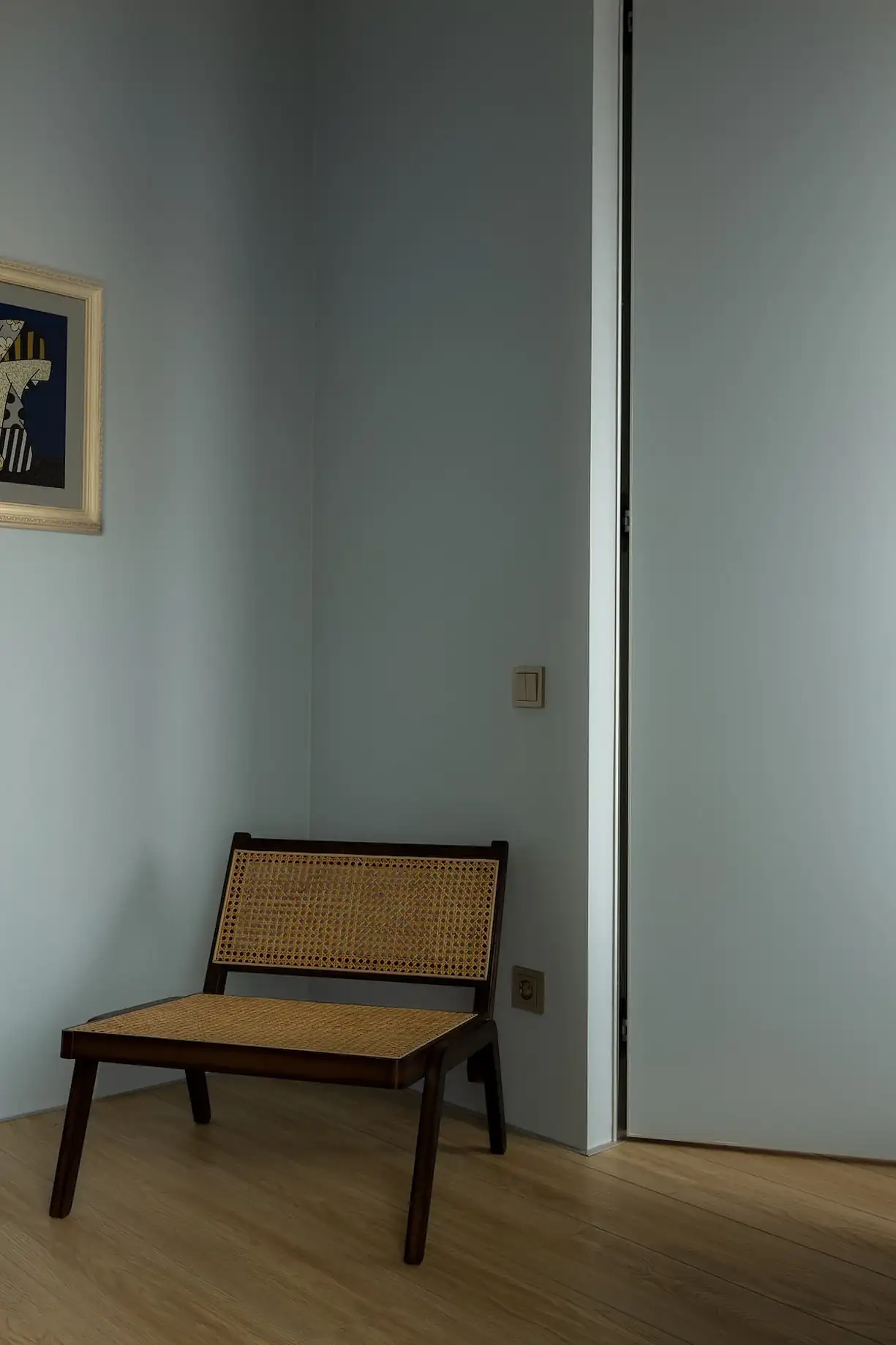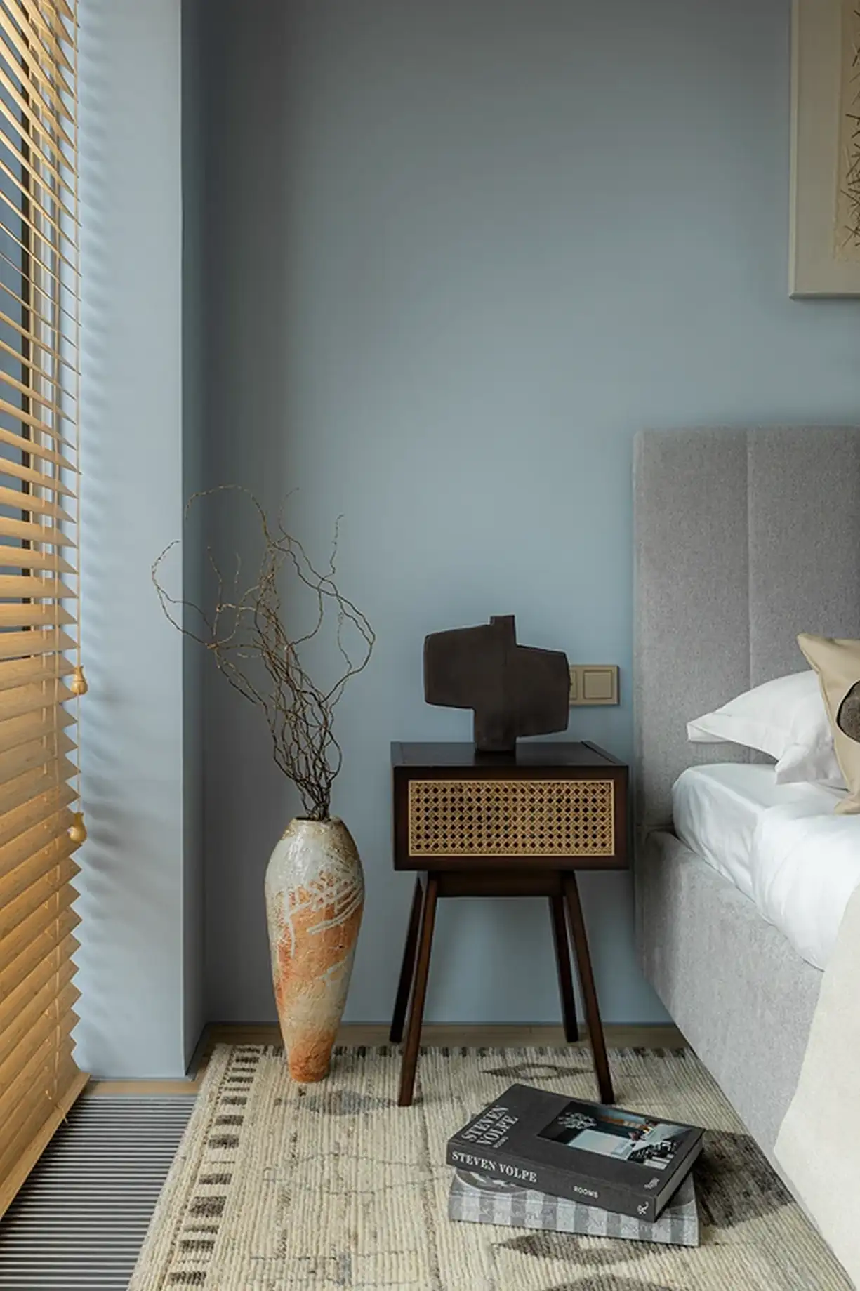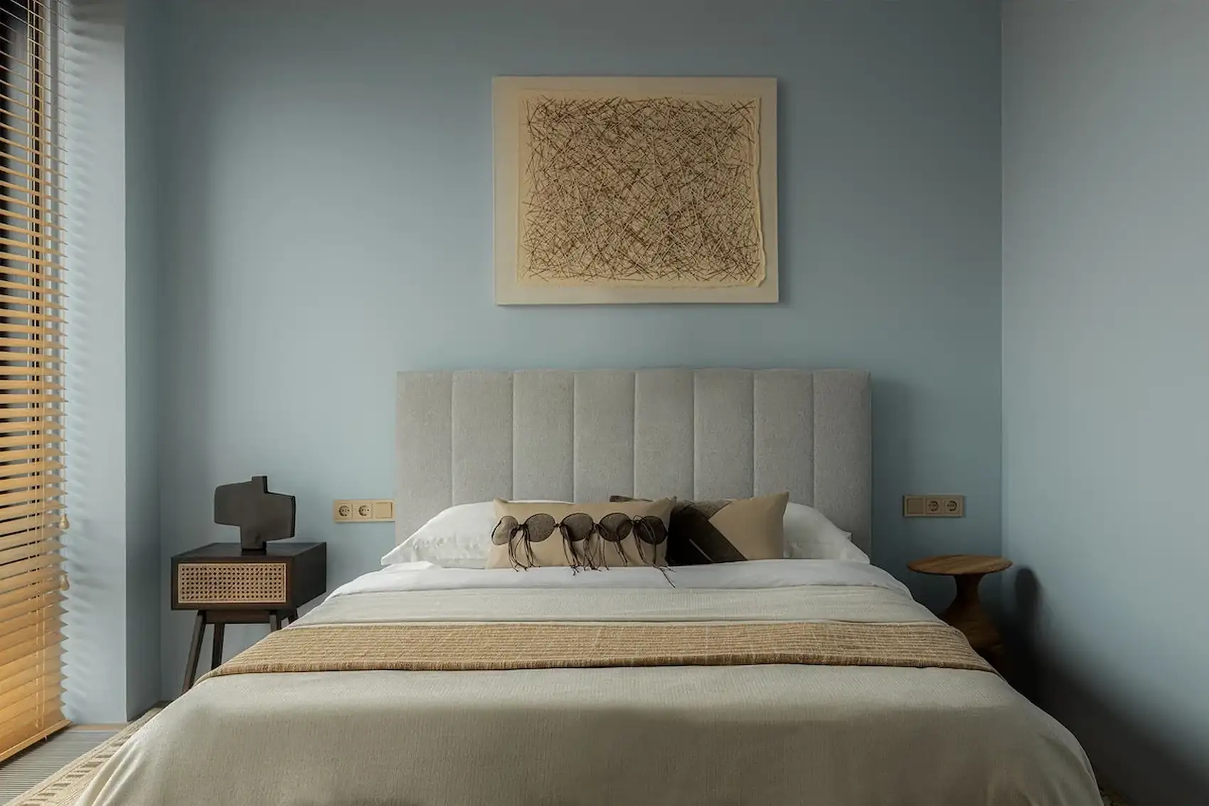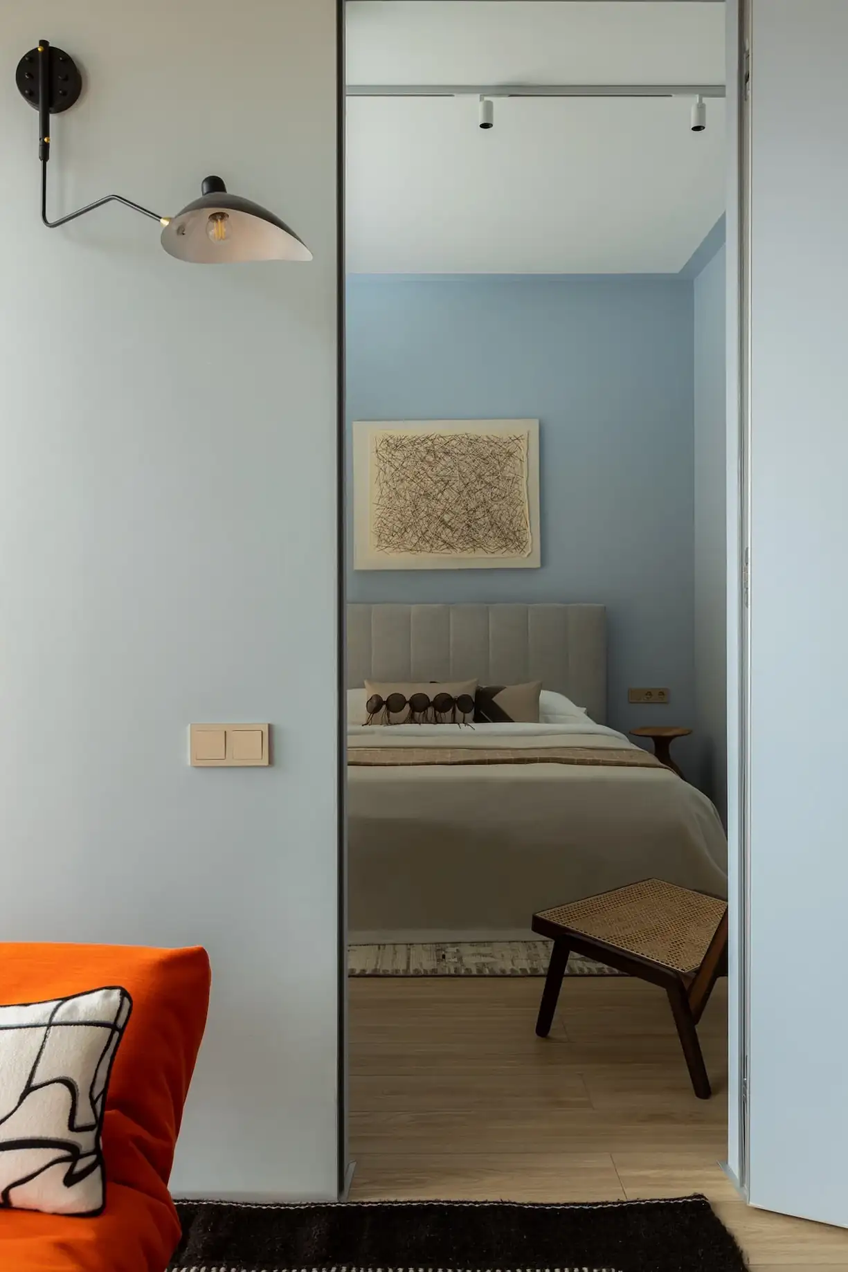 A hálószobában a falak világoskék árnyalata dominál. A szoba főszereplője a kényelmes, texturált szürke szövettel kárpitozott, puha fejtámlás ágy. Bár a szoba alapterülete kicsi, a ruhák tárolását egy kompakt, mégis tágas, mennyezetig érő beépített gardróbszekrény oldja meg. A berendezést egy fiókos éjjeliszekrény és egy kis lerakóasztal egészíti ki, ahol az apróságokat lehet kényelmesen tárolni.