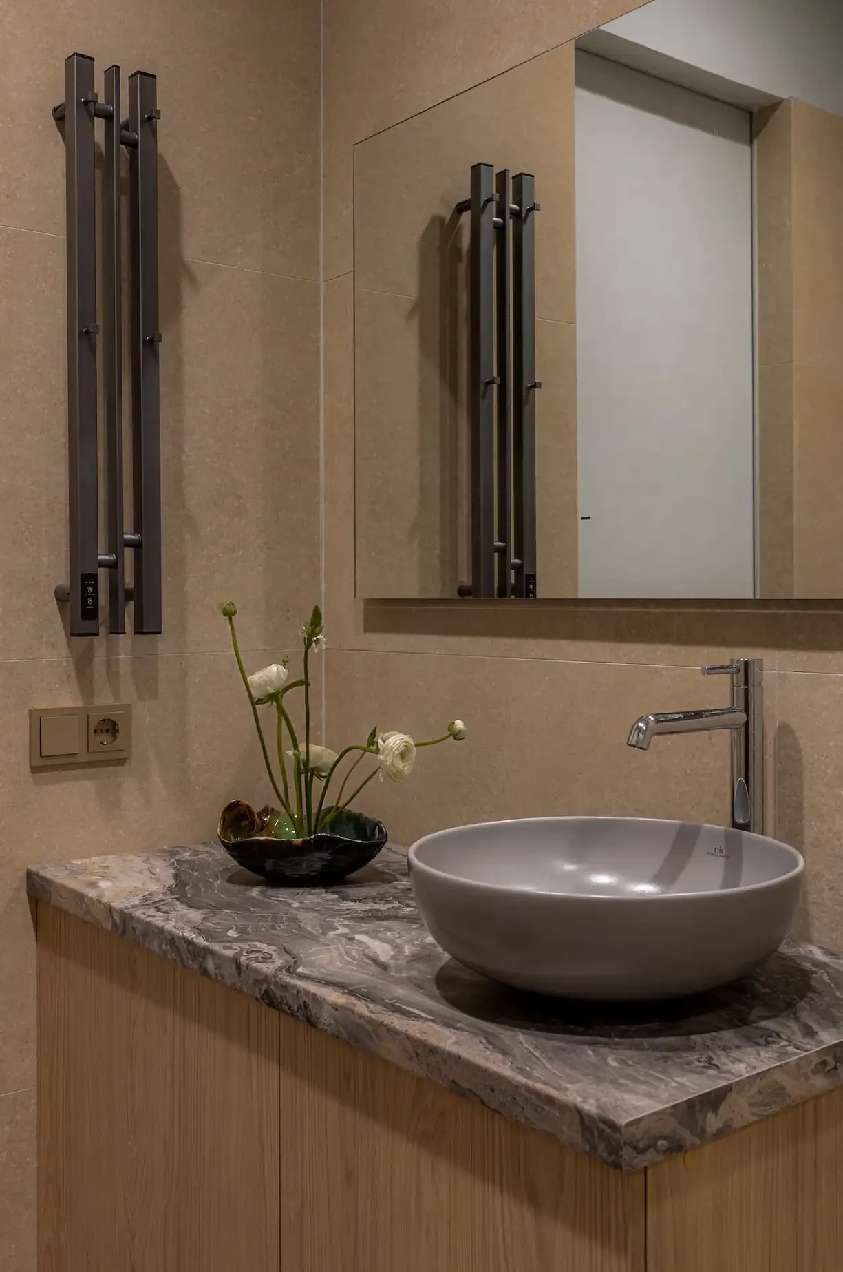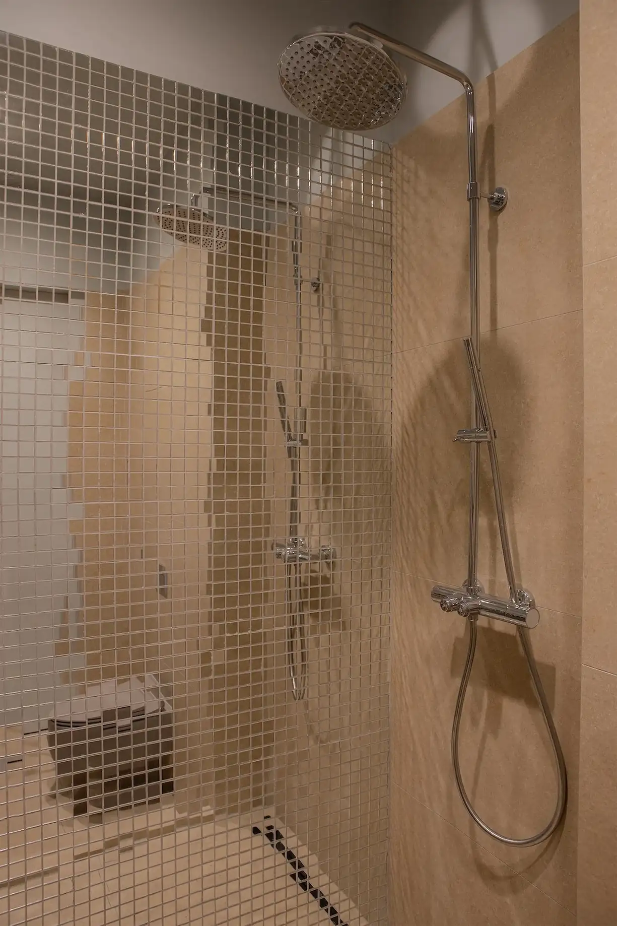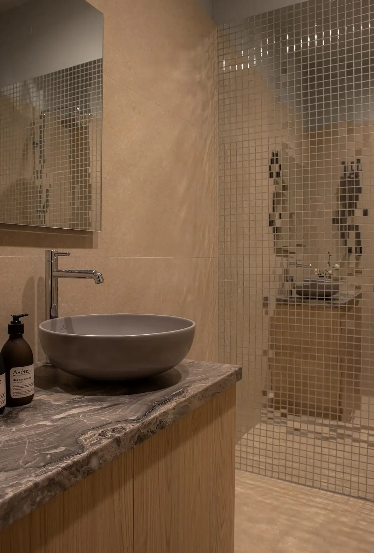 A fürdőszoba burkolata a természetességet sugározza: az alapot egy kőhatású, semleges bézs greslap adja, amelyet szürke falfestés egészít ki. A helyiség egyértelmű ékessége a zuhanyzó falát borító, csillogó tükörmozaik, amely optikailag is tágítja a teret. A funkcionalitás itt is a letisztult dizájnnal párosul: a mosdó alatti tágas szekrény nemcsak a fürdőszobai kellékeket rejti el, hanem a mosógépet is magában foglalja.