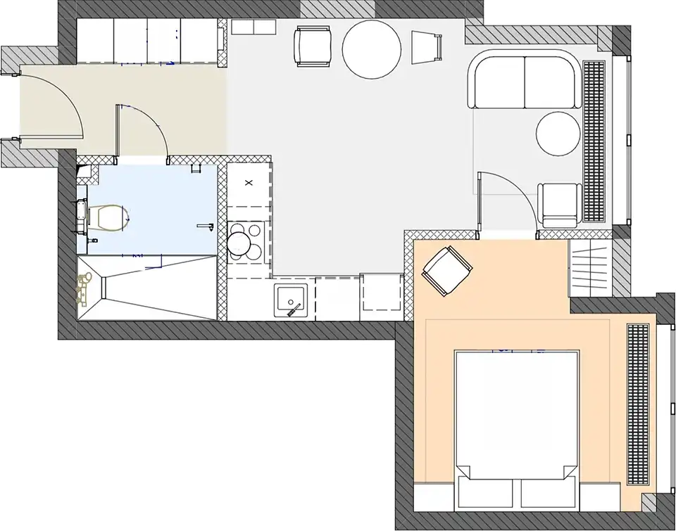 Az építtető eredetileg teljesen nyitott, válaszfalak nélküli térként adta át a lakást, a tervező azonban úgy döntött, hogy tartja magát a lakáshoz javasolt alaprajzi elrendezéshez. A konyhát megtartották az eredeti helyén, viszont felhúzták a fürdőszobát határoló falakat, és teljesen leválasztottak egy intim hálószobát, kialakítva a végleges, logikus térszerkezetet.