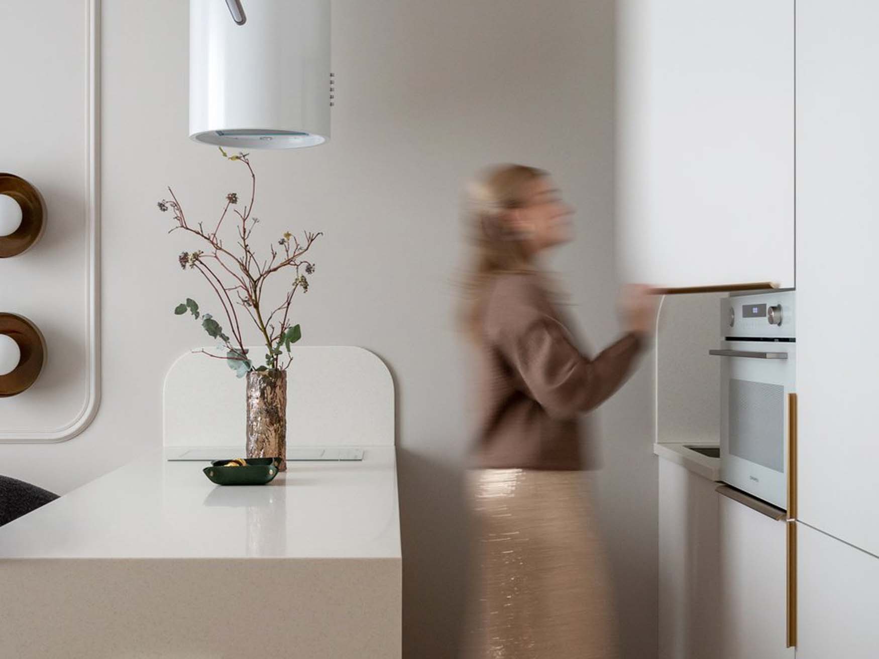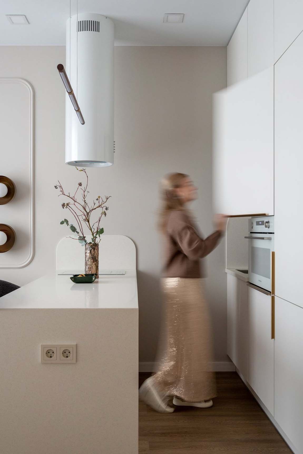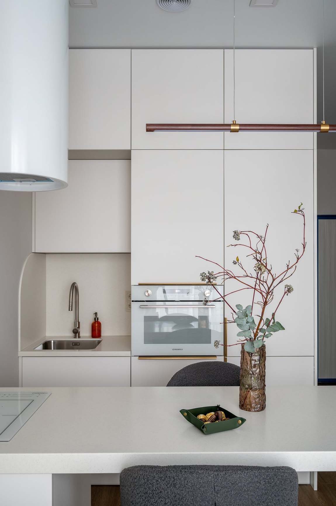 A helyiség világos falszínei szinte egybeolvadnak a konyhabútor frontjaival, ami a légiesség és a tágasság érzetét erősíti. A finom kőerezetű, matt munkalap csak egy leheletnyi kontrasztot visz a térbe.