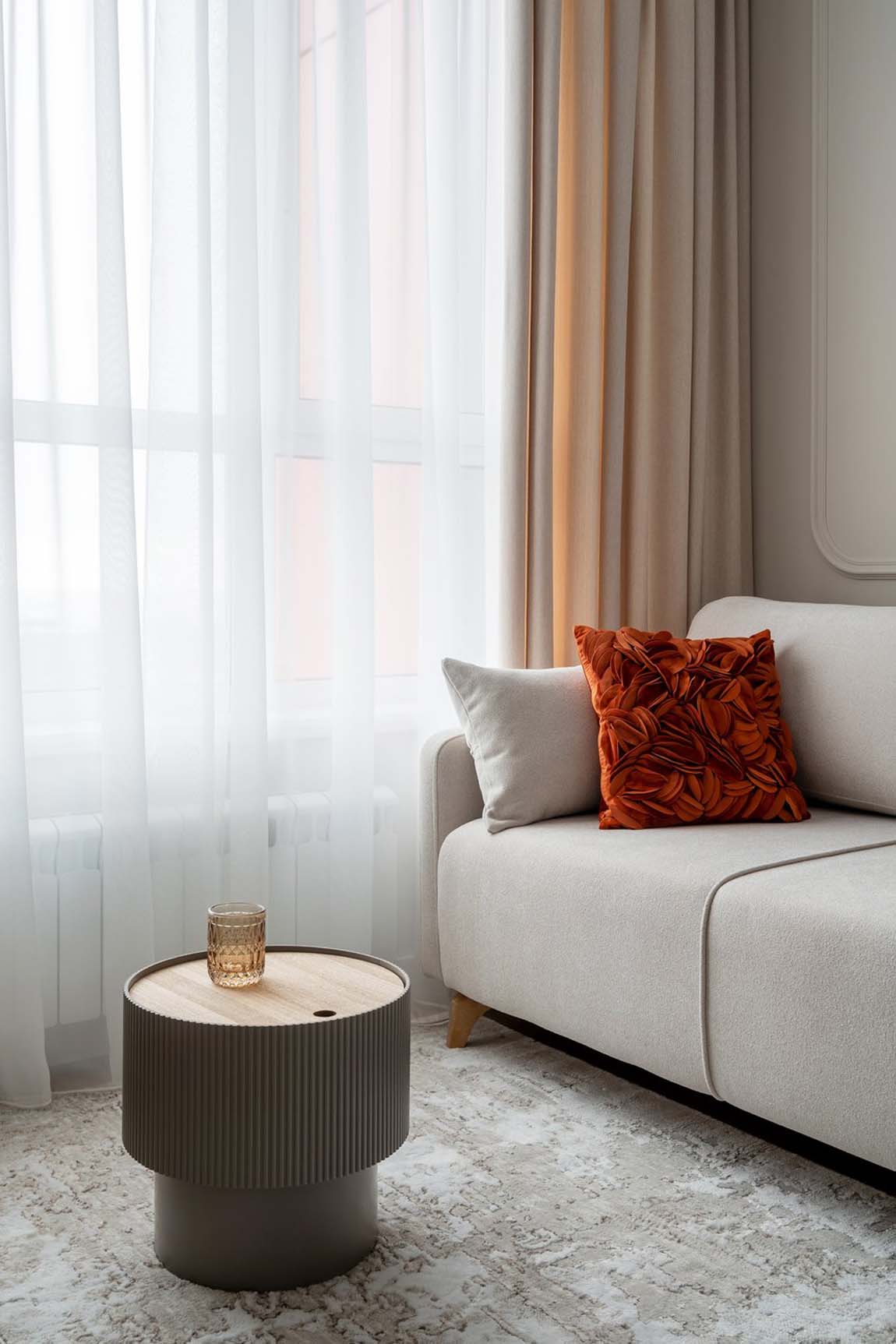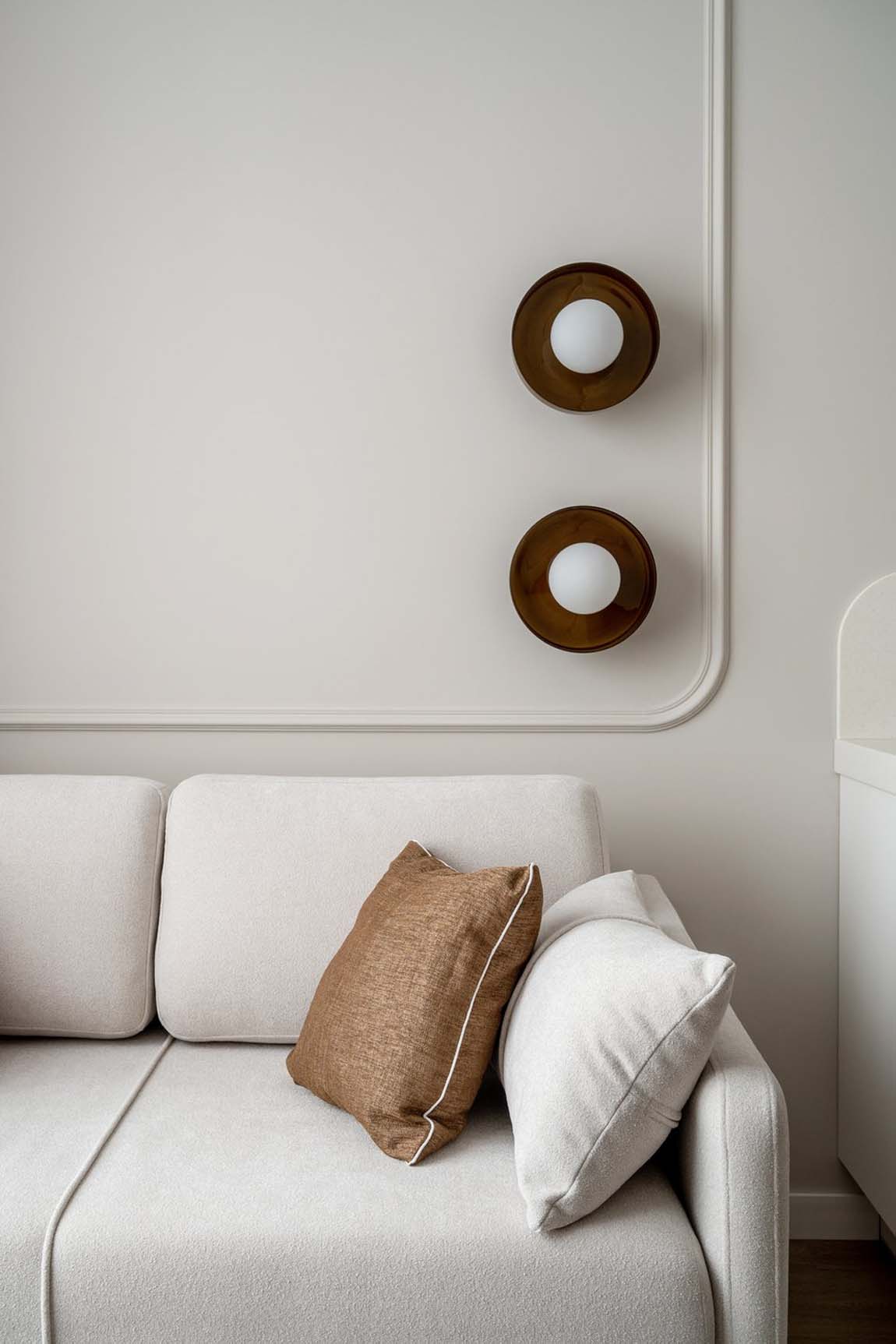 A nappali falain végigfutó, a falakkal azonos színűre festett íves díszlécek a fény hatására izgalmas árnyjátékot keltenek. A tér központi bútordarabja egy kompakt, ágyazható kanapé.