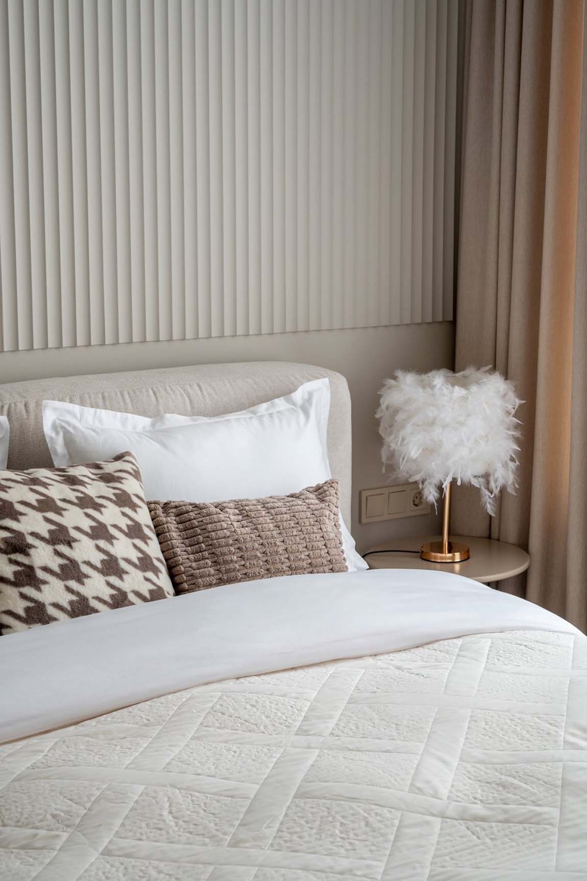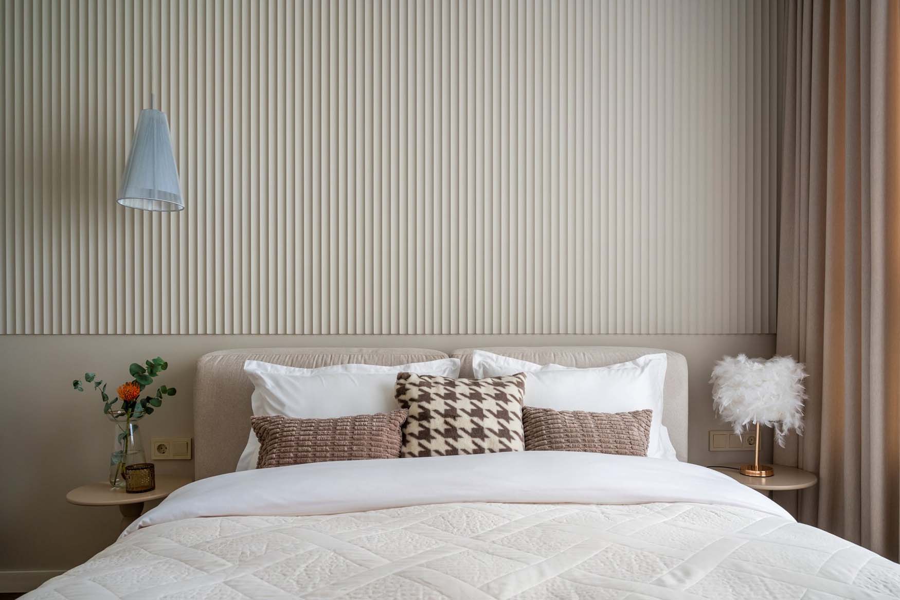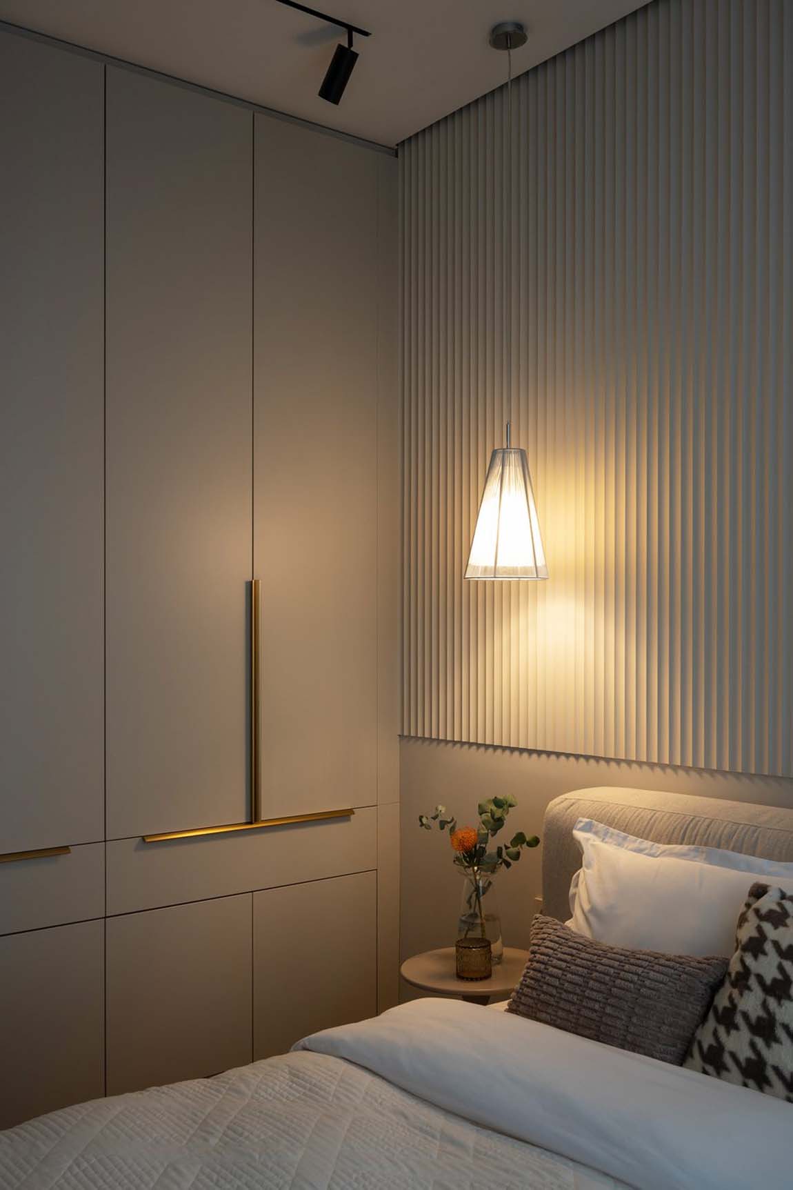 A hálószoba fókuszpontja az ágy mögötti fal, melyet domború, duropolimer panelekkel burkoltak. A mennyezeti gipszkartonba rejtett LED-szalag esti fénnyel megvilágítva lágy árnyékokat vet, életre keltve a formákat.