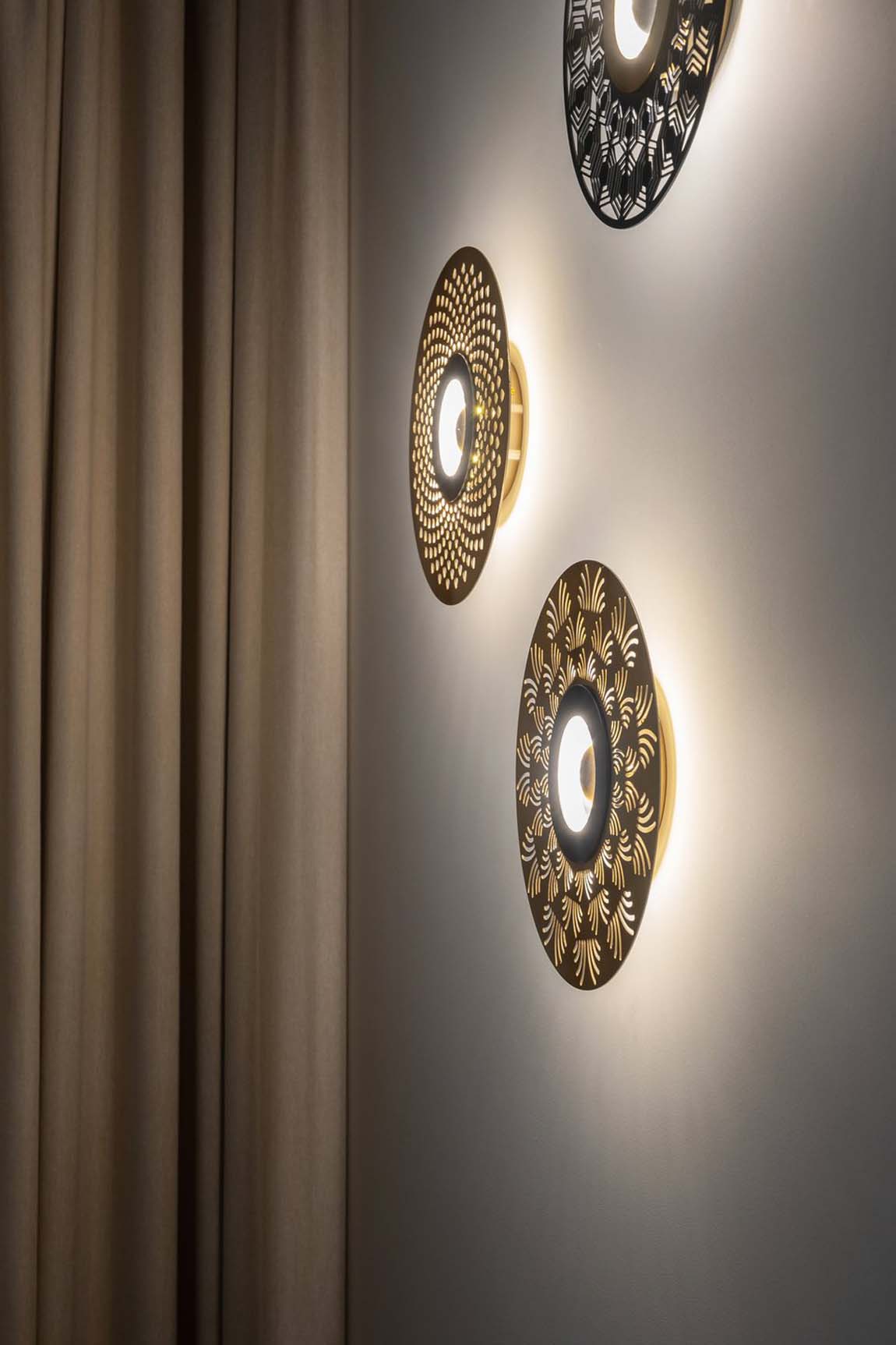 Az ággyal szemközti fal díszes karú lámpái felkapcsolva sejtelmes árnyékmintákat rajzolnak a felületre. A szoba általános megvilágítását egy mennyezeti sínrendszer adja, míg az egyik éjjeliszekrény fölé belógatott függeszték meghitt, helyi fényt biztosít.