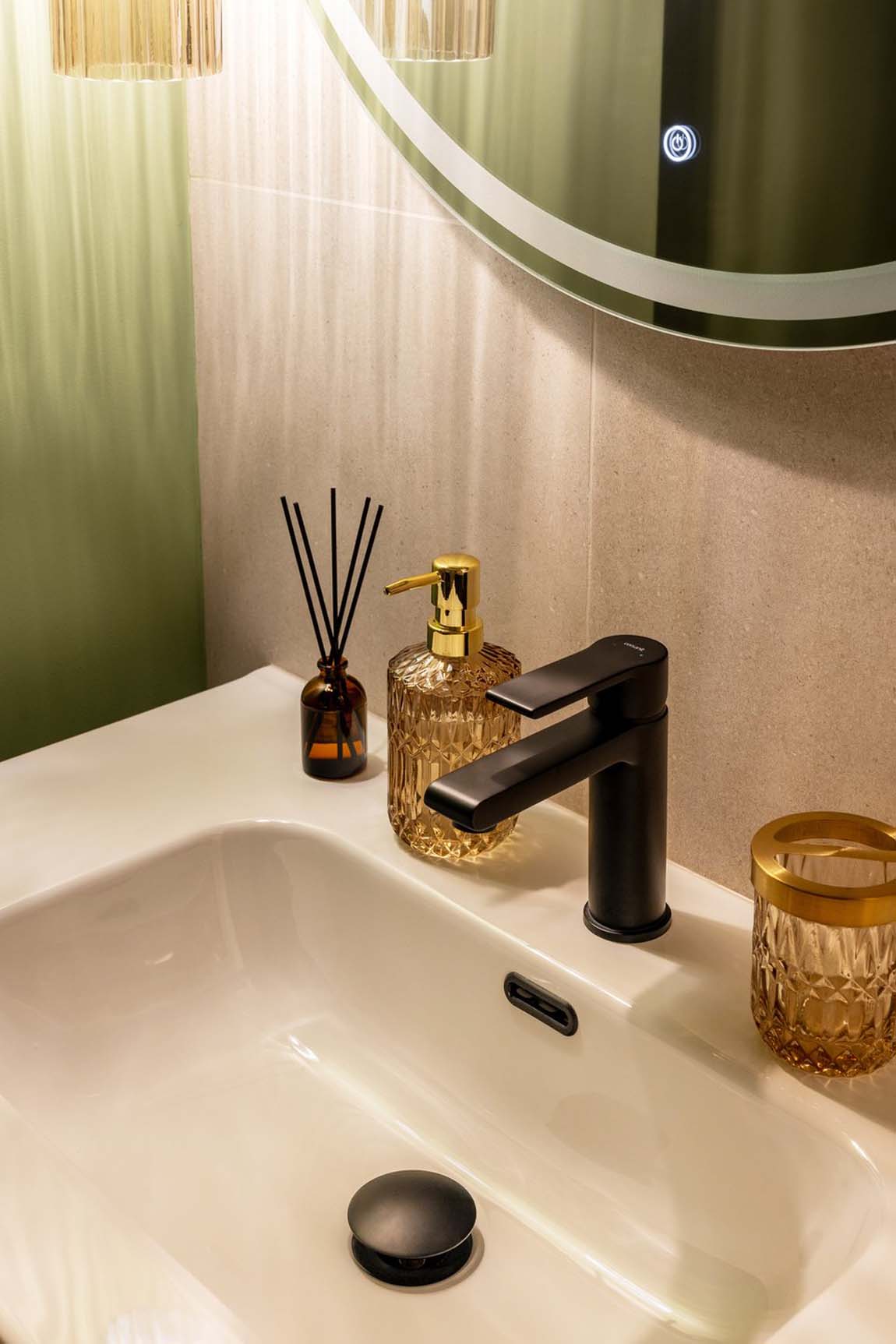 A fürdőszoba falait nagyméretű, kőhatású greslapok és mosható falfesték párosával díszítették. A padlót szintén greslap borítja, de már játékos terrazzo mintával. A tárolásról egy fiókos, beépített mosdós alsószekrény gondoskodik. Fölötte háttérvilágítással ellátott tükör kapott helyet, a tér ékköve pedig egy bordázott üvegbúrás, dekoratív függeszték.