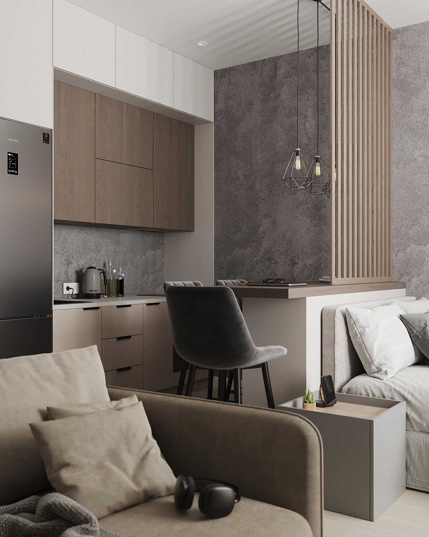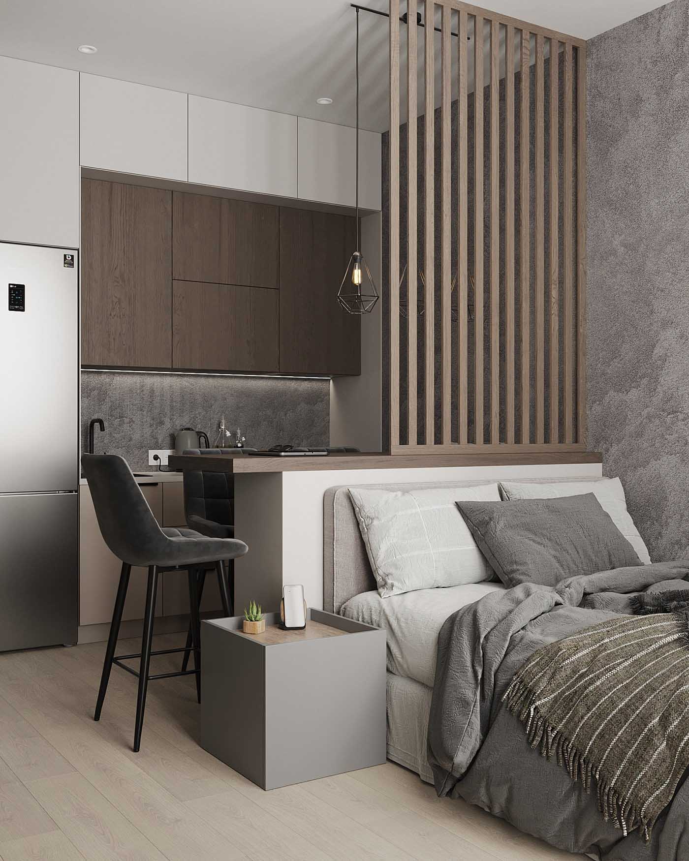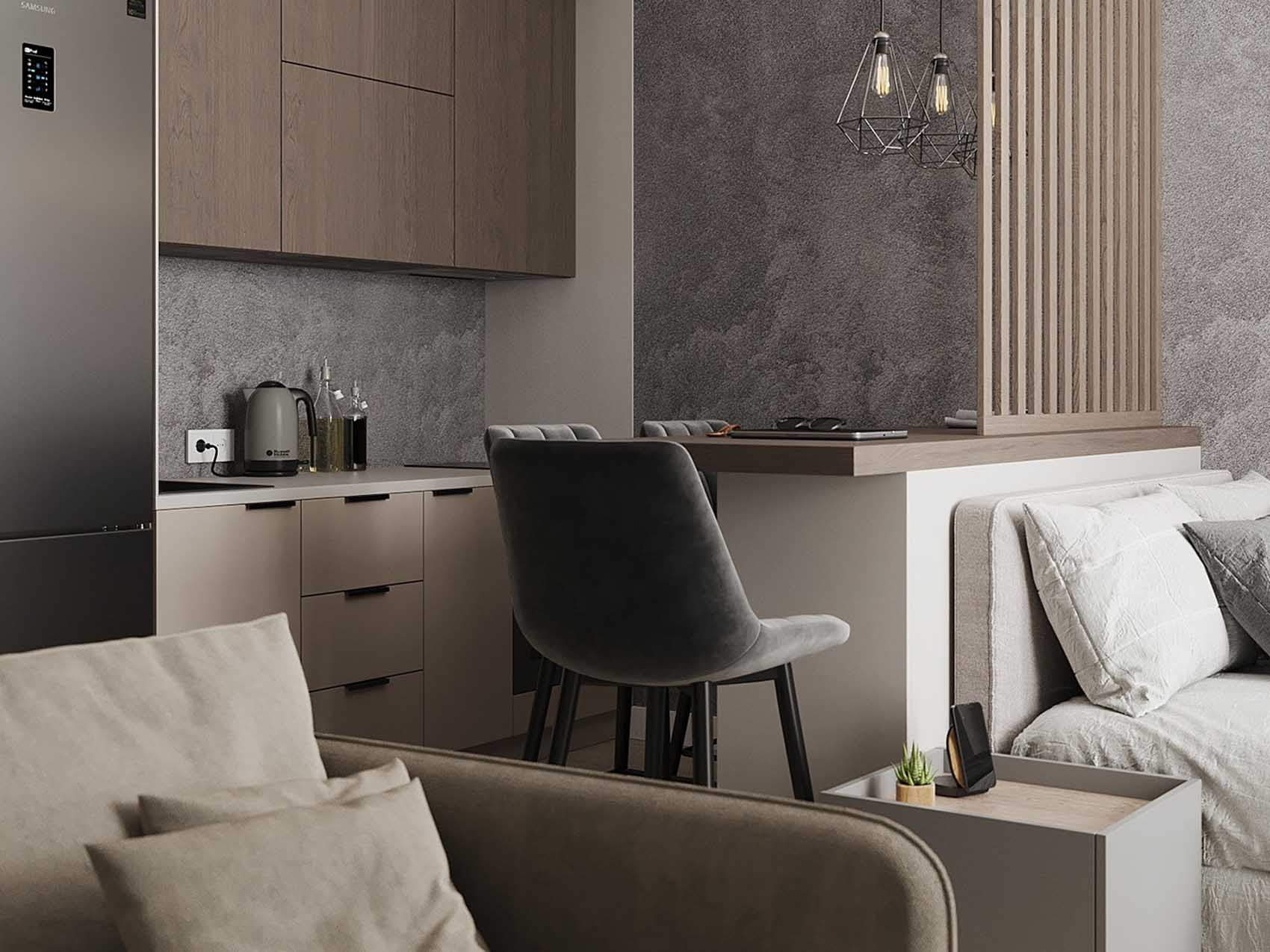 Ebben a zónában hangsúlyos, sötétszürke, betonhatású tapétát használtak. Ez vizuálisan elválasztja az ágyat a kanapétól, ugyanakkor összekapcsolja azt a konyha zónájával.