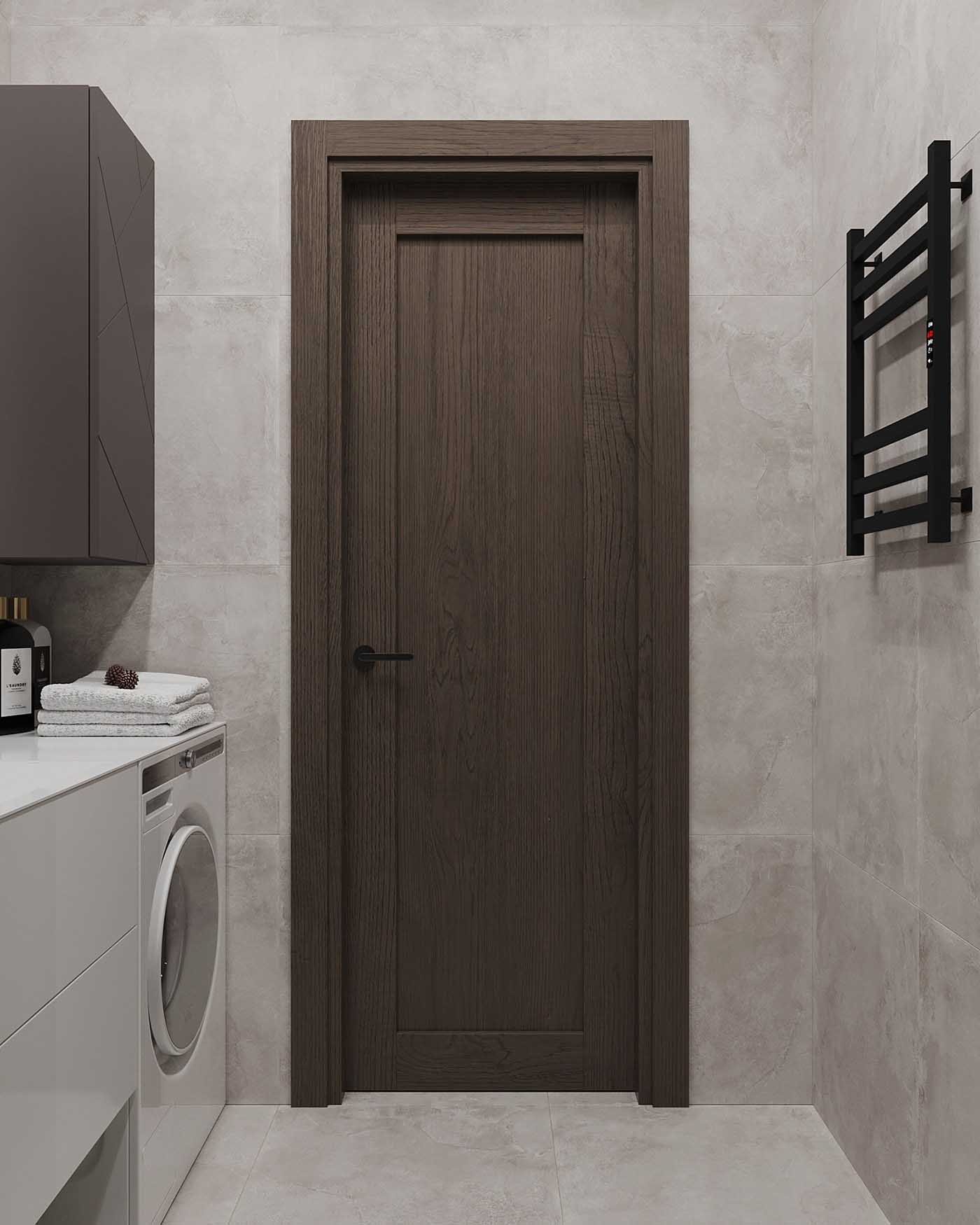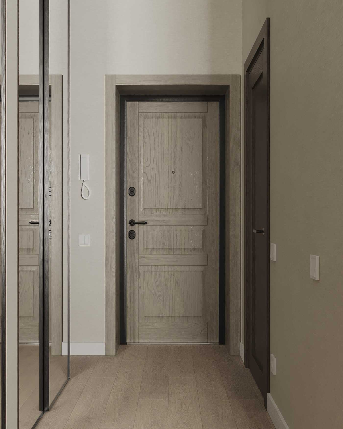 A bejárati ajtót nem cserélték ki, de a fürdőszobához egy gyönyörű, furnérozott beltéri ajtót választottak – a fa textúrája kiválóan finomítja a monokróm belső teret, és illik a lakás többi bútorához.