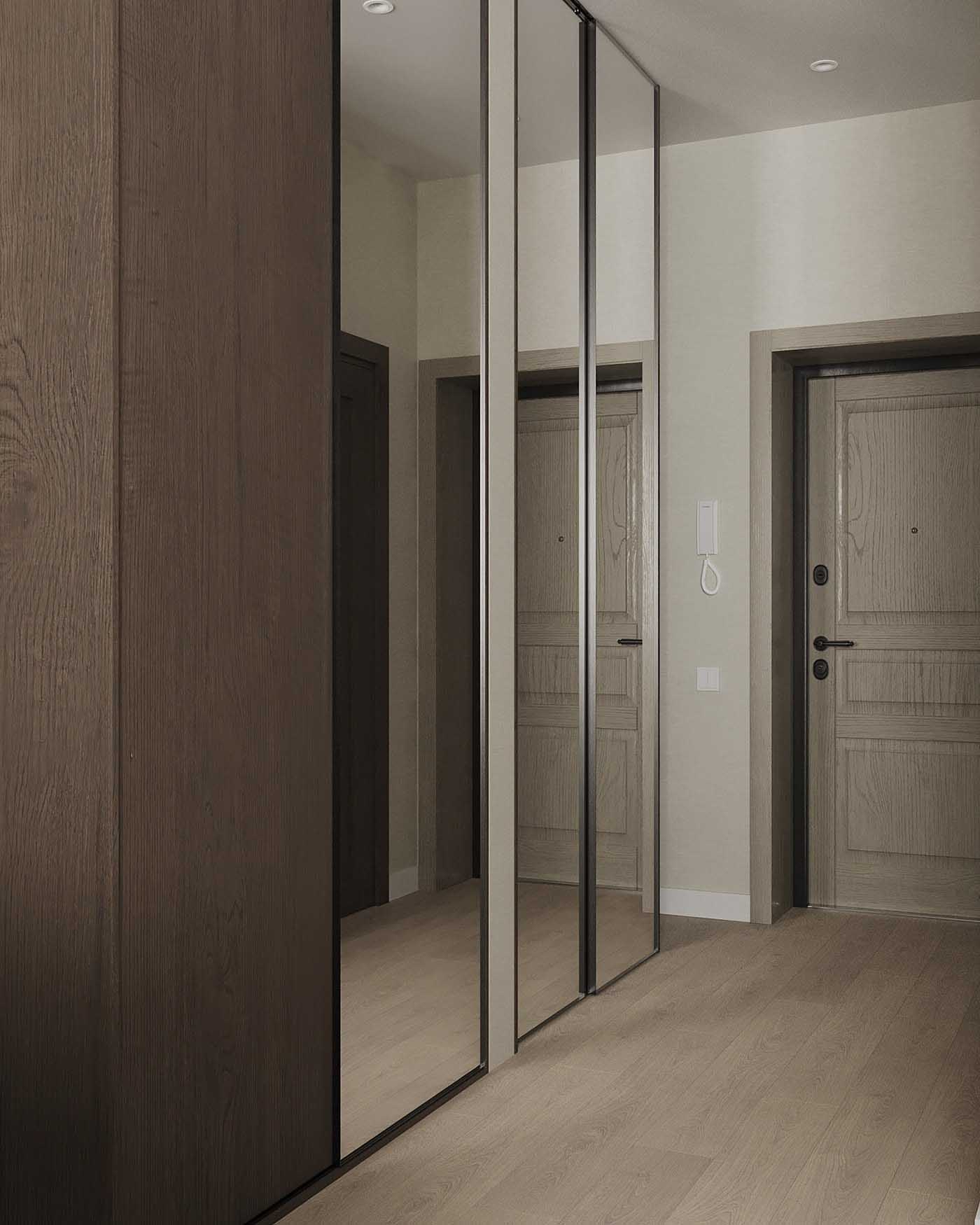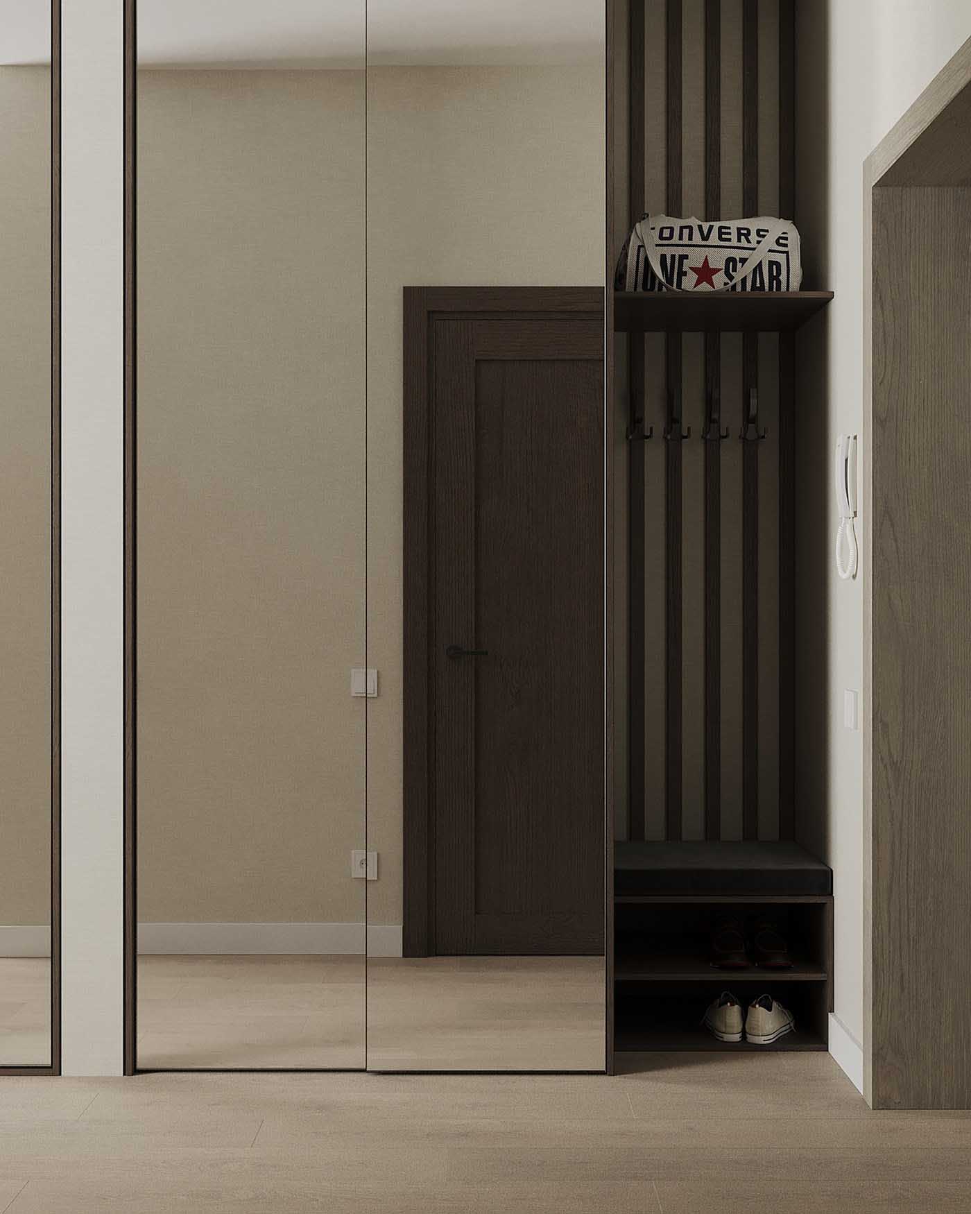 Az előszoba keskeny és kicsi, ezért a szekrény tükrös ajtókat kapott. A bárpultnál is alkalmazott léces megoldás visszaköszön a bejárat melletti puff felett. A léceken akasztók találhatók és egy polc a sapkáknak/táskáknak. A puff alatt van egy kis hely a cipők számára.