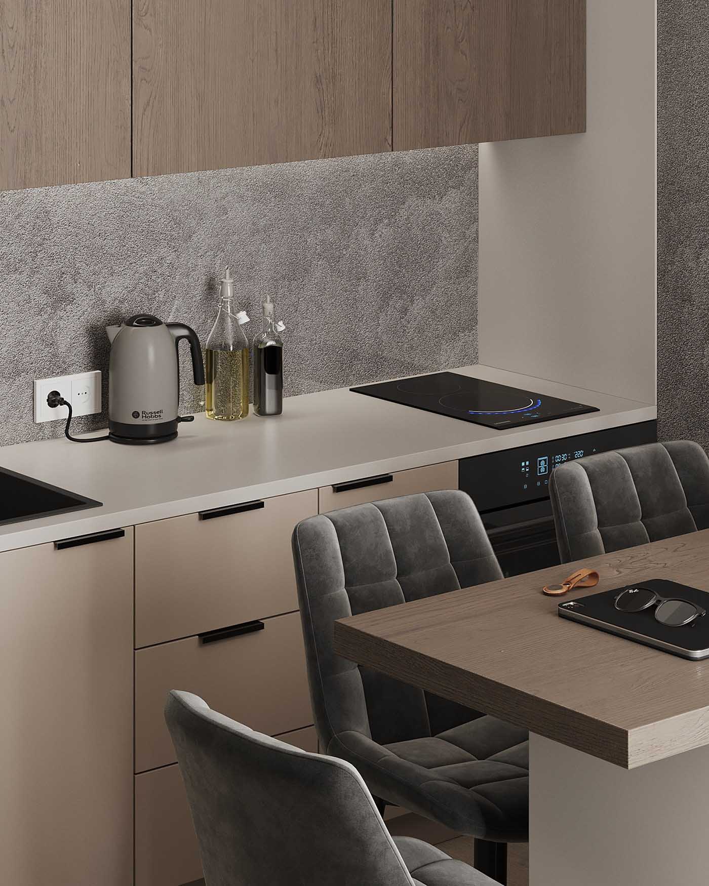 A szürkésbézs tónusokat fekete elemek élénkítik. Ebben a lakásban a fekete szín elválasztó elemként működik, kiemeli és érdekesebbé teszi a lakás többi színét. Ilyen a fekete dohányzóasztal, a fekete vasalatok, a fekete szaniterek, a székek fekete lábai, a beépített szekrények fekete fém elemei stb. Pontosan a fekete az, ami életre kelti a többi árnyalatot, megadja a szükséges kontrasztot, és kiemeli a színeket és tárgyakat. Ez a megoldás különösen jól működik a semleges, szürkésbézs enteriőrökben, megakadályozva, hogy az összhatás jellegtelen és élettelen legyen.
