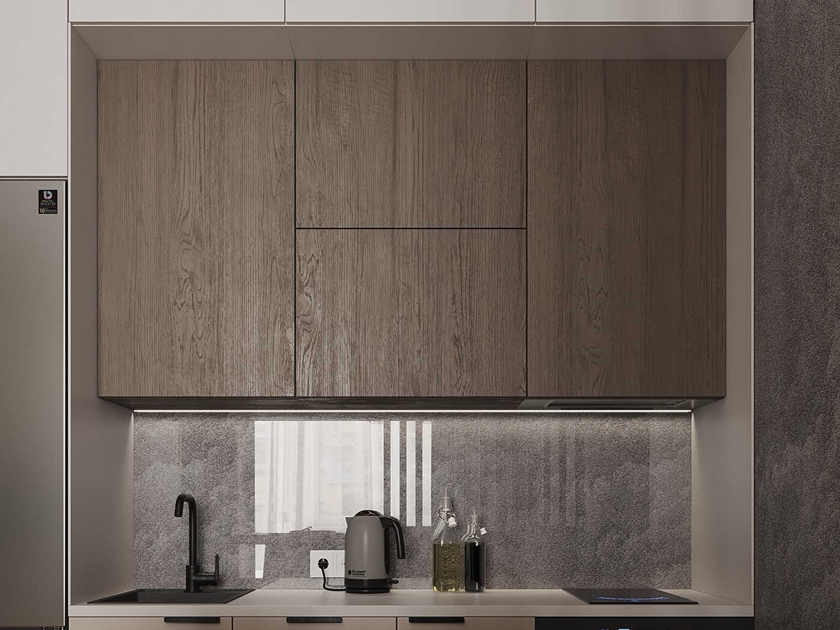A konyhai hátfal egy hangsúlyos, betonhatású tapéta, ugyanaz, mint a szomszédos falon. A hátfal területén a tapétát plexiüveg borítás védi. Ez egy rendkívül praktikus, olcsó és egyszerűen kivitelezhető megoldás.