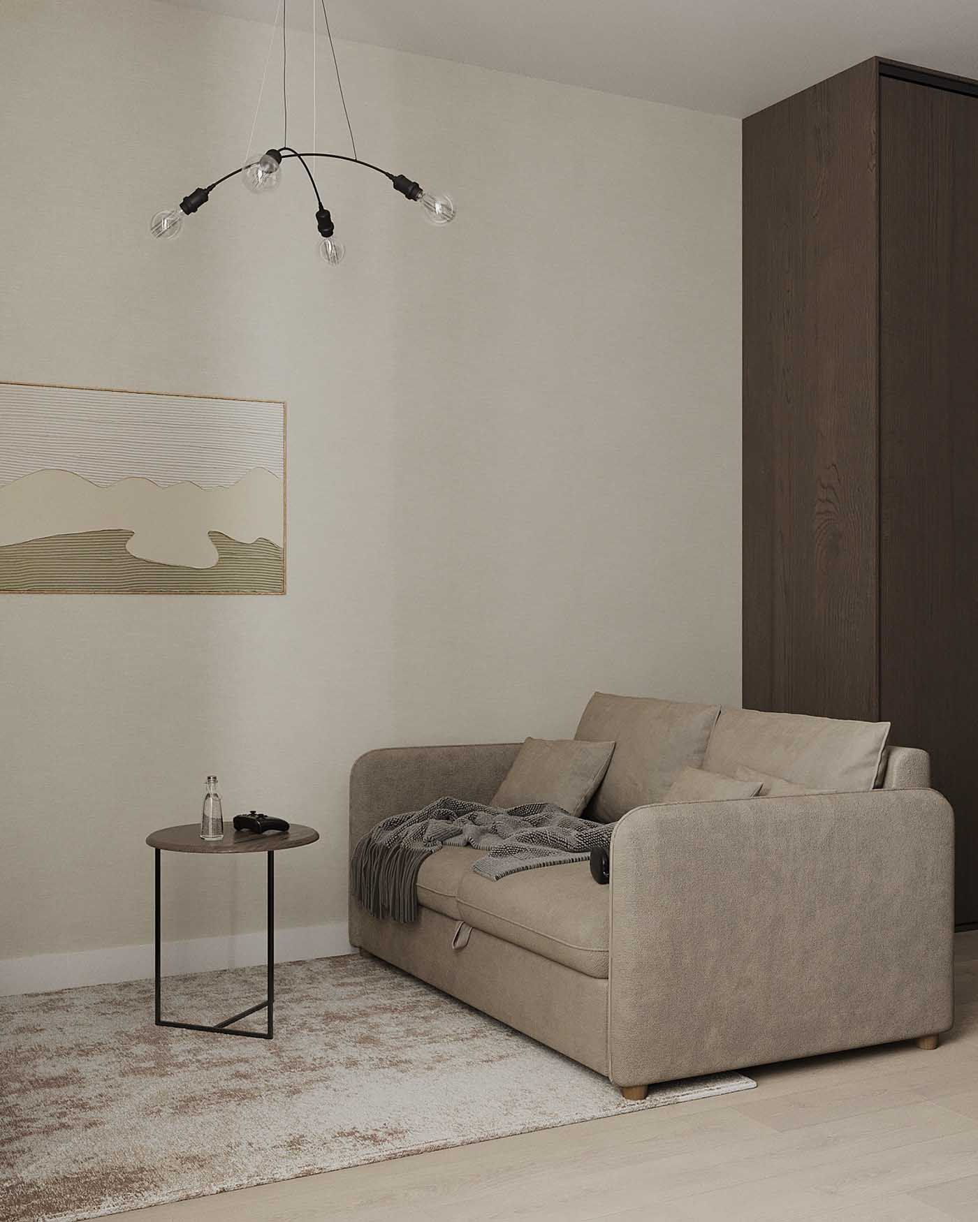 Az éjjeliszekrény stílusban és színben is illeszkedik a TV-szekrényhez. Nyugodt tónusai mintegy kiegyensúlyozzák az ágy melletti aktívabb falat. Vizuális kompaktsága ellenére a szekrény rendkívül funkcionális – pontosan erre van szükség az ilyen kis stúdiólakásokban, ahol minden négyzetméter számít. Ez a kis éjjeliszekrény egyben zónaelválasztó elemként is működik.